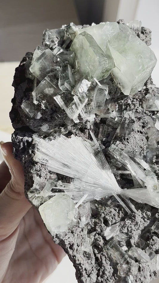 Green Apophyllite w/Scolecite Sprays on Basalt Matrix Specimen #31
