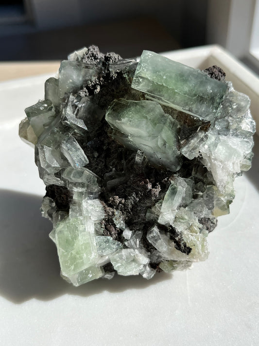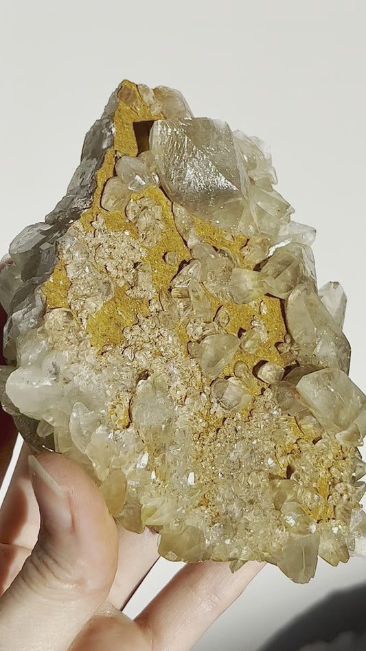 Grupo de cuarzo mango “desafiando la gravedad” en matriz de siderita (espécimen de gabinete grande)