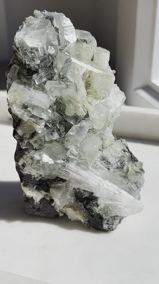Apofilita verde con aerosoles de estilbita y escolecita en el espécimen de matriz de basalto #13