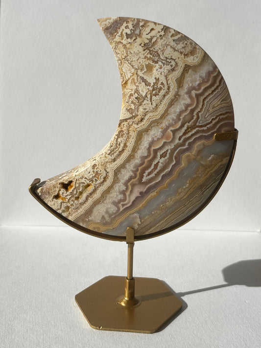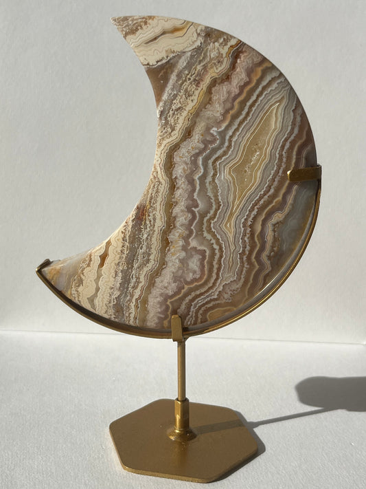 High Grade Golden Lace Agate Moon Carving on Stand with Parallax Effect B