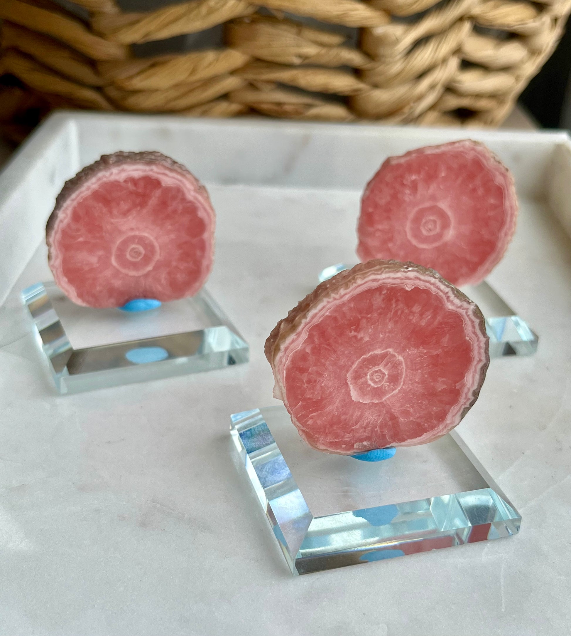 El soporte de vidrio para muestras se vende por separado. El borde exterior puede contener residuos de resina resultantes del corte y procesamiento de la gran estalactita en rodajas.