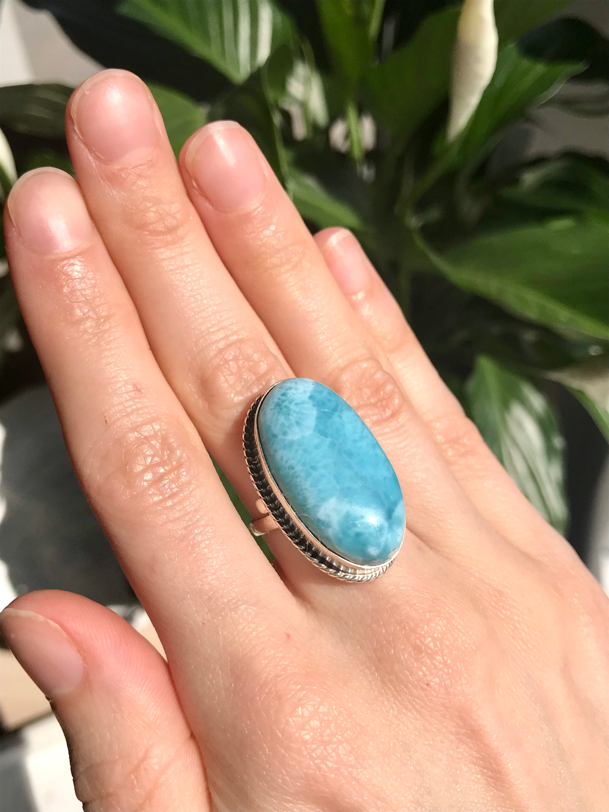 Piedra Larimar de grado AAA de calidad exquisita engastada en plata de ley 925. Todos estos anillos son ajustables al tamaño de anillo deseado.