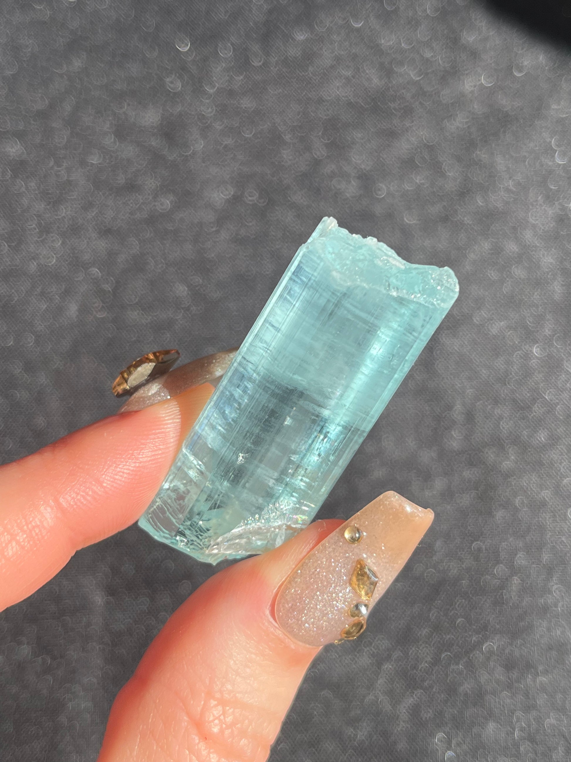 This elegant aquamarine exhibits a soft yet vivid icy blue tone, superb transparency, and well-defined prism faces that beautifully catch and diffuse light. The top termination shows a naturally etched surface with intricate sculptural patterns that reflect fluid interaction during the crystal’s final growth phases.