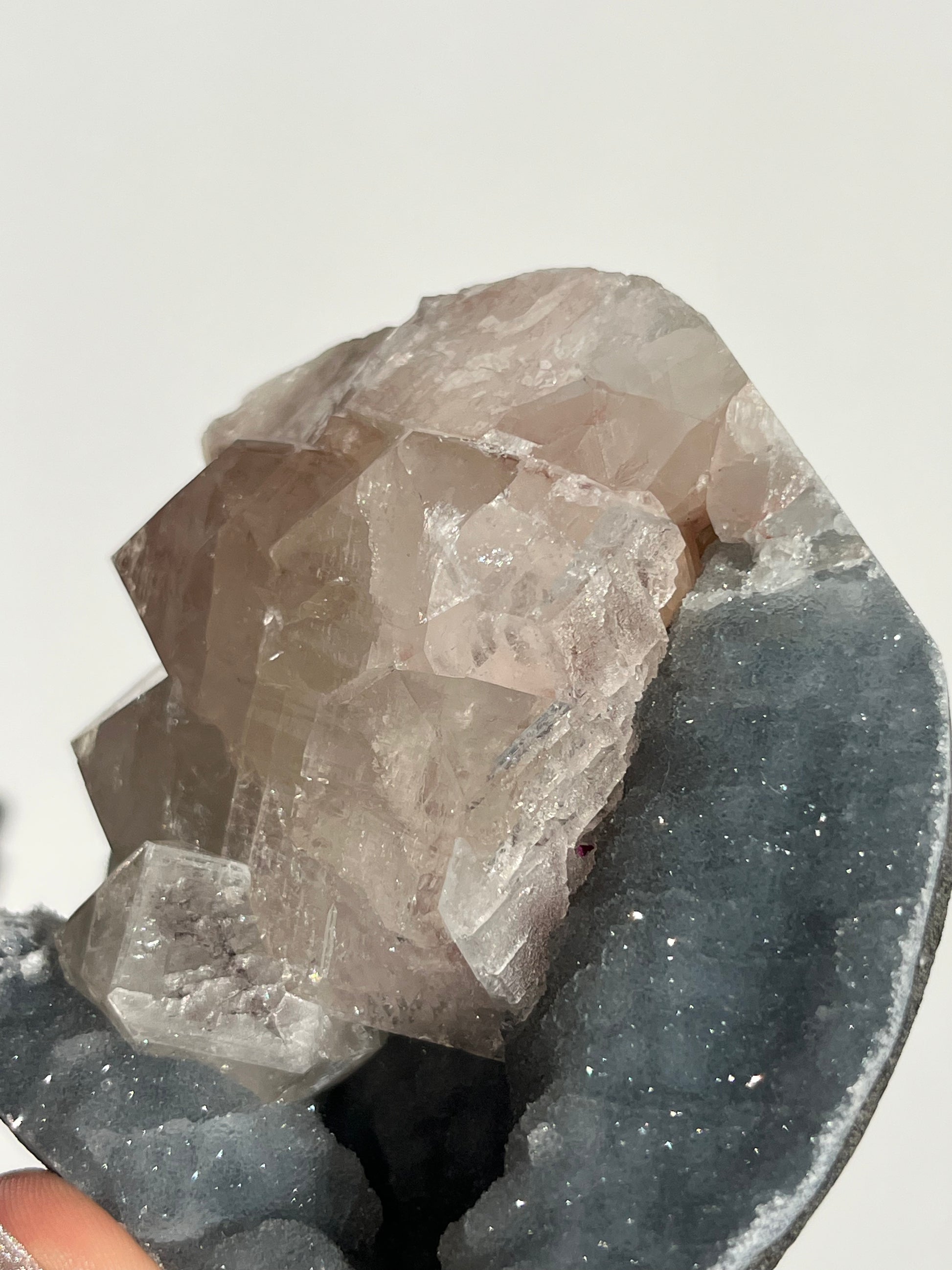 Blue Chalcedony and Apophyllite with Peach Stilbite Standing Geode Specimen B