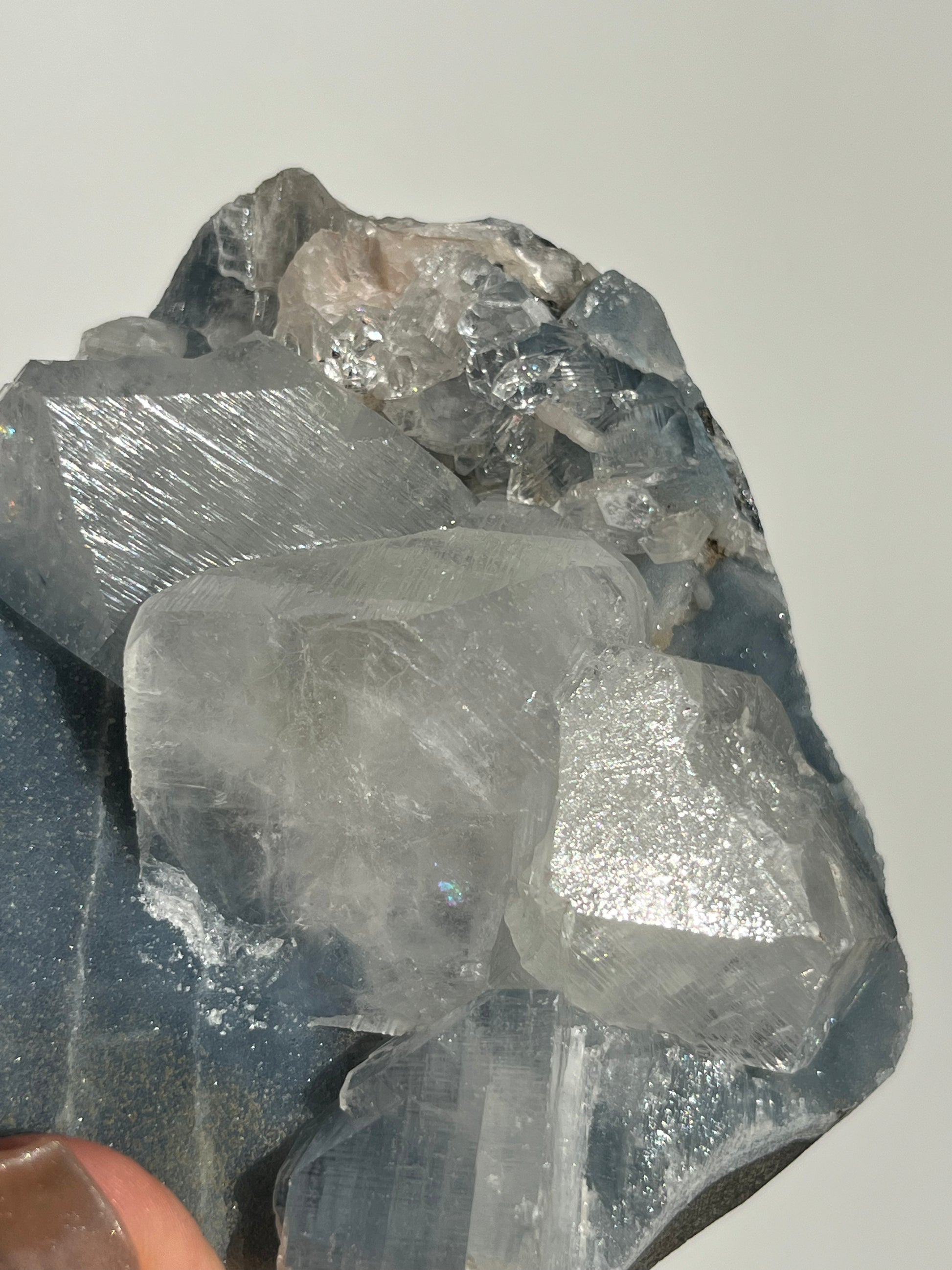 Blue Chalcedony and Apophyllite with Peach Stilbite Standing Geode Specimen G