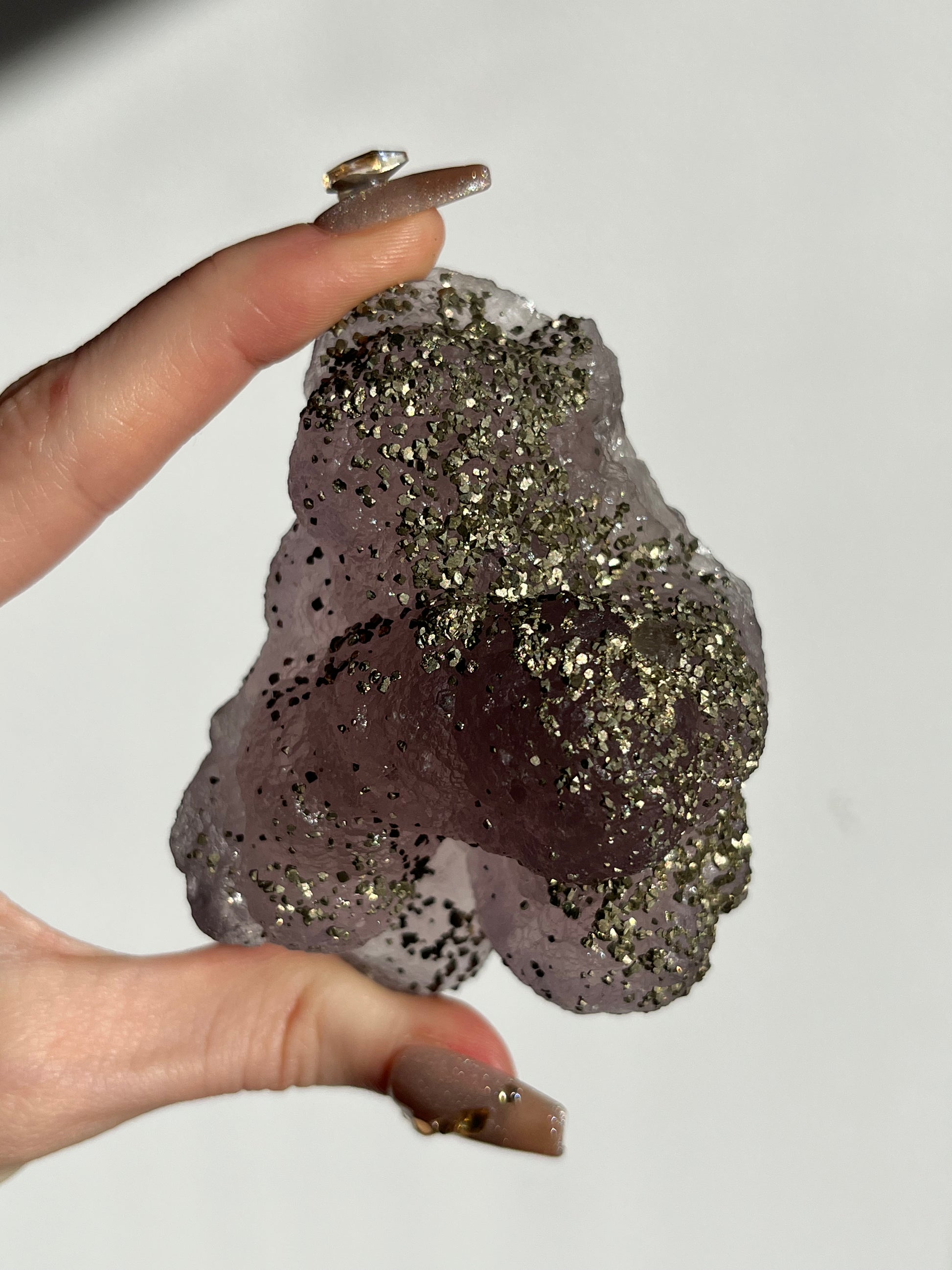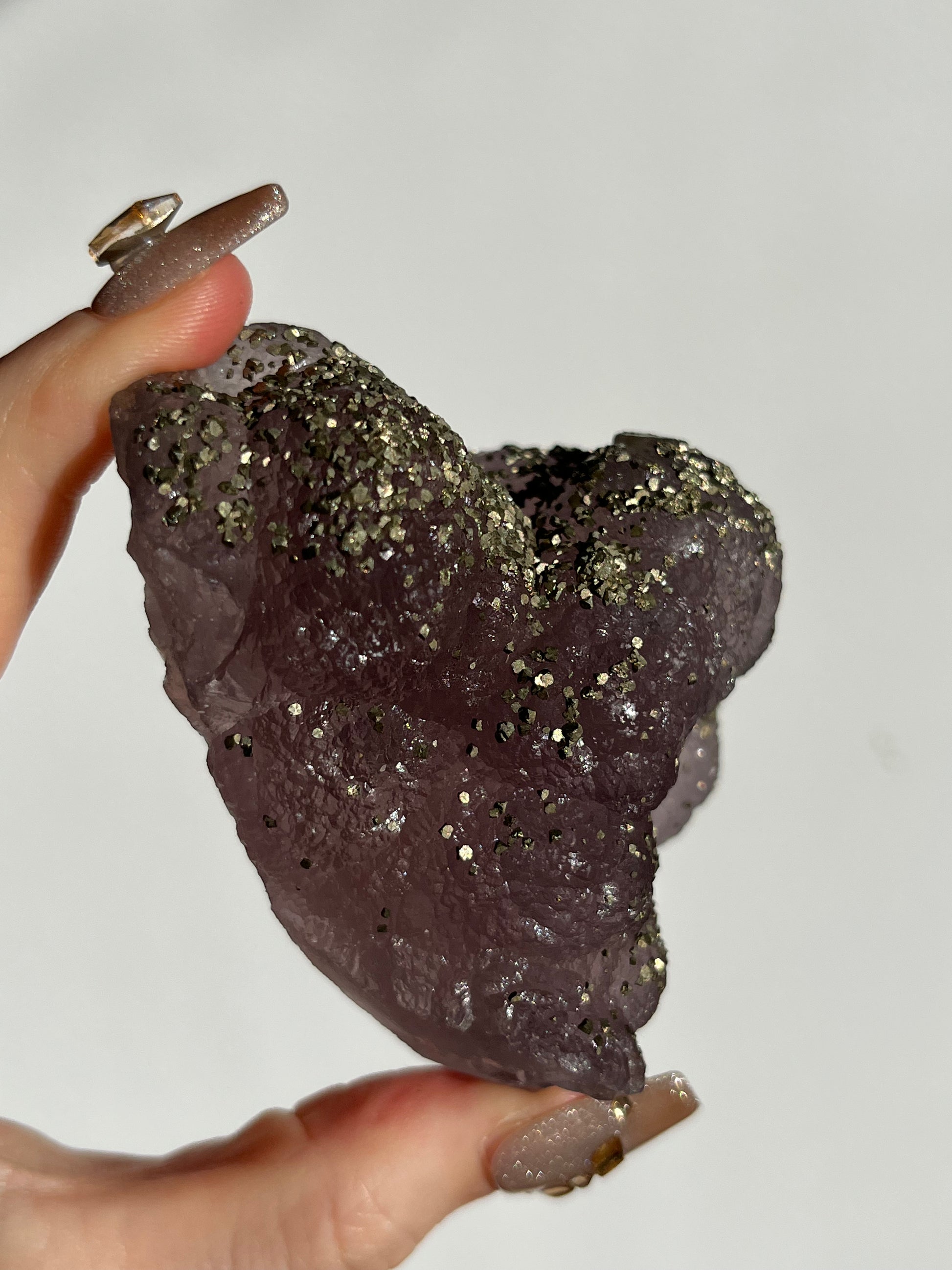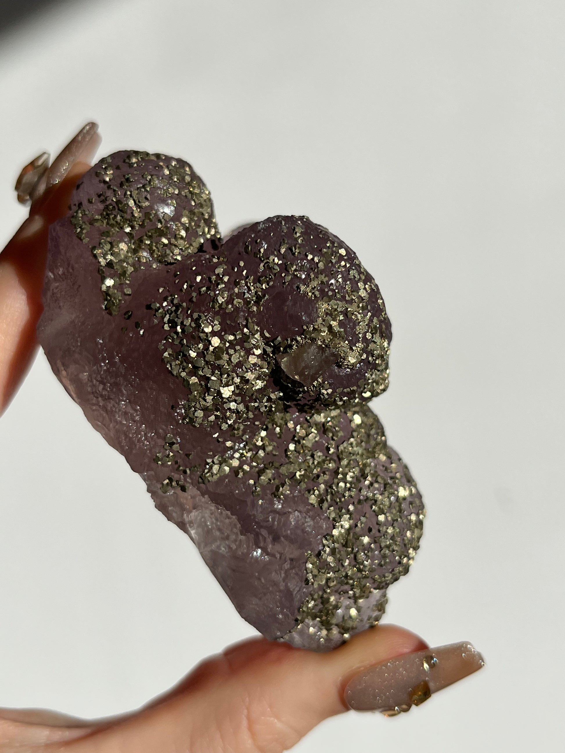 Metaphysically, this rare pairing of Purple Botryoidal Fluorite and Pyrite serves as a bridge between intuition and strength. The grape-like formations of this fluorite variety soothe the mind and awaken the third eye, while golden pyrite anchors in a sense of confidence, protection, and personal power. Working together to promote clarity, energetic shielding, and visionary insight that is grounded in action.