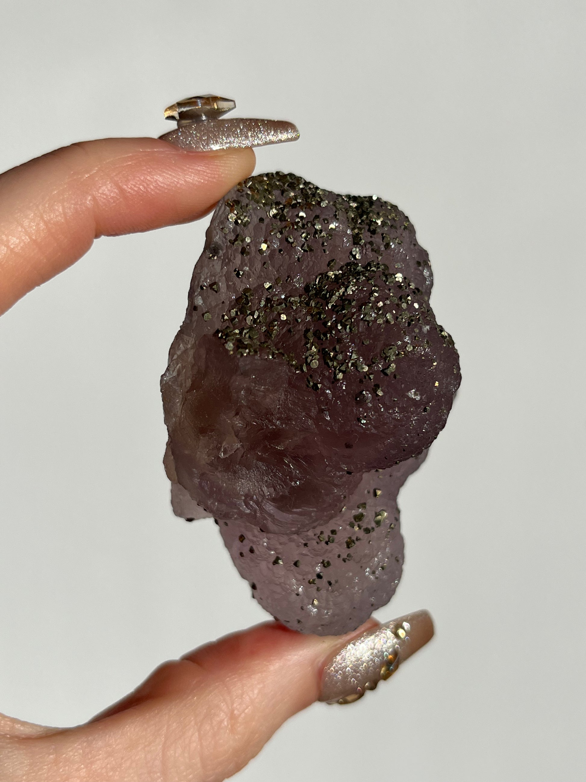 Metaphysically, this rare pairing of Purple Botryoidal Fluorite and Pyrite serves as a bridge between intuition and strength. The grape-like formations of this fluorite variety soothe the mind and awaken the third eye, while golden pyrite anchors in a sense of confidence, protection, and personal power. Working together to promote clarity, energetic shielding, and visionary insight that is grounded in action.