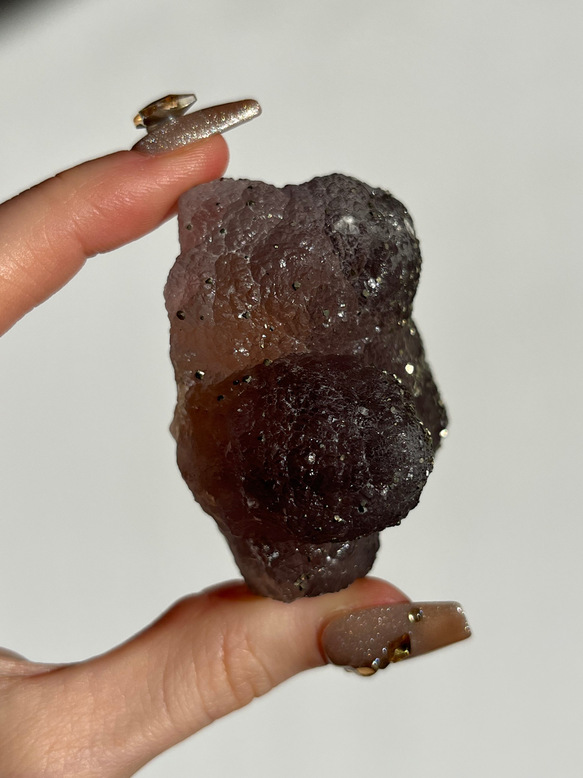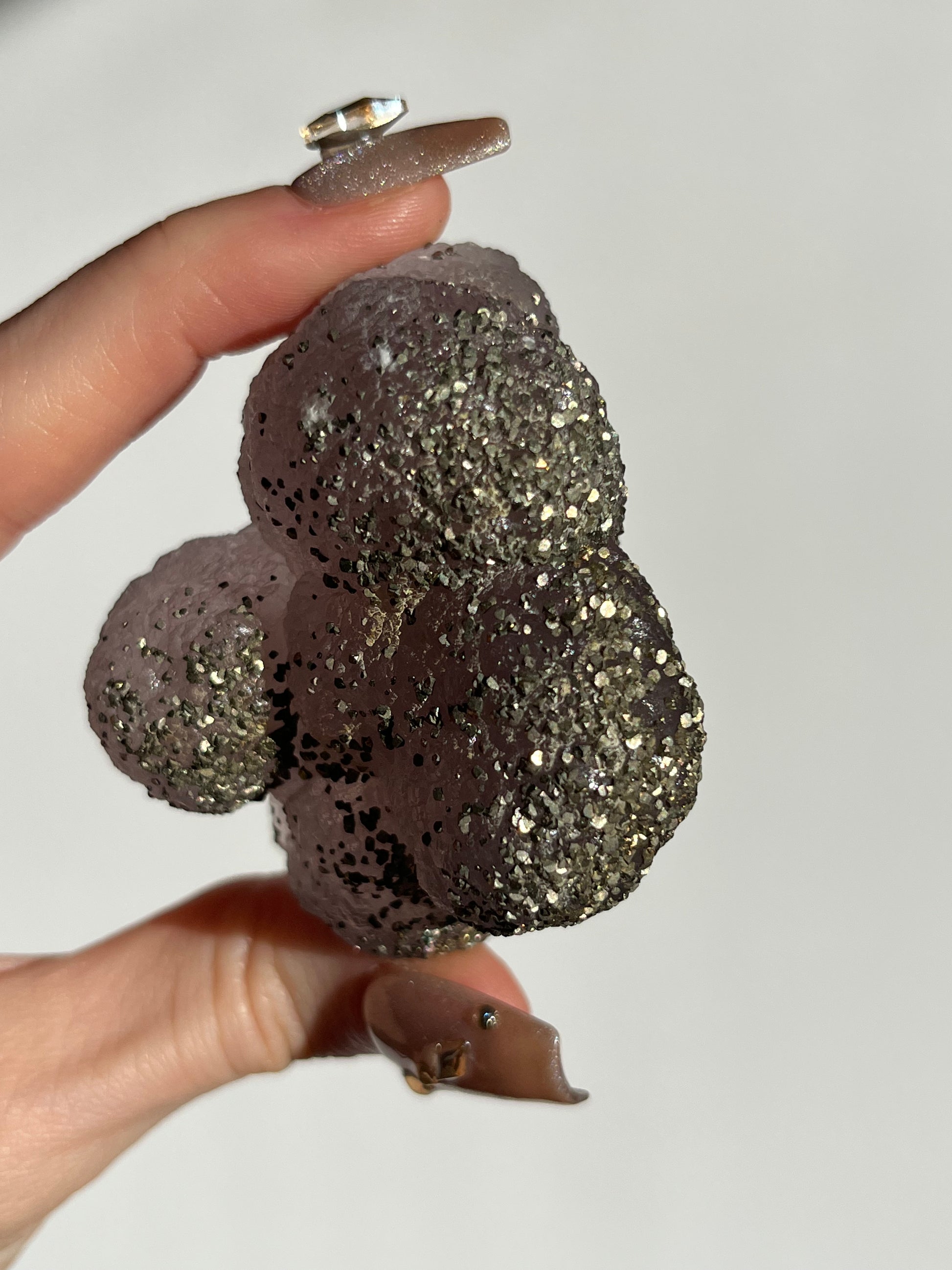 Metaphysically, this rare pairing of Purple Botryoidal Fluorite and Pyrite serves as a bridge between intuition and strength. The grape-like formations of this fluorite variety soothe the mind and awaken the third eye, while golden pyrite anchors in a sense of confidence, protection, and personal power. Working together to promote clarity, energetic shielding, and visionary insight that is grounded in action.