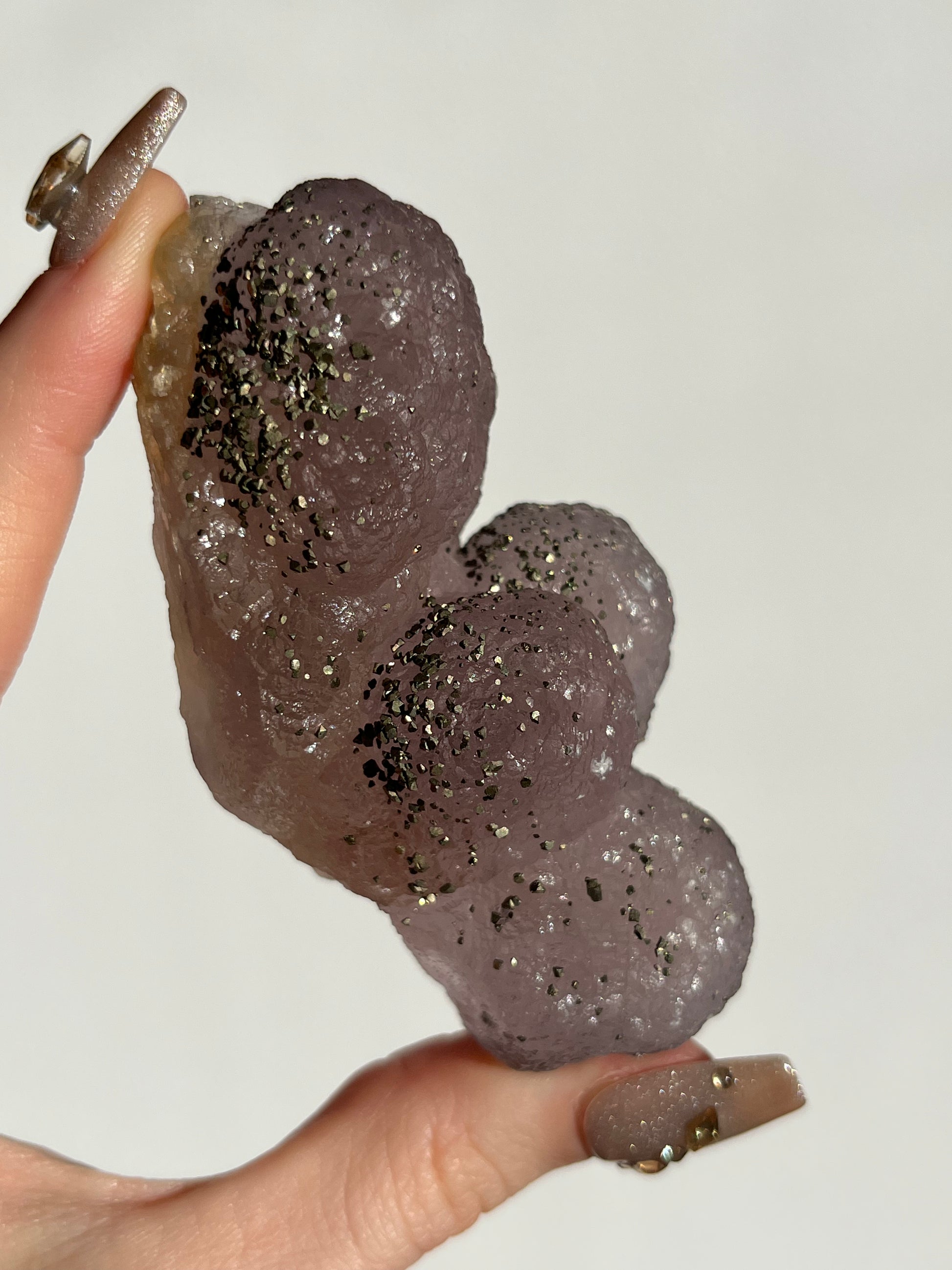 Metaphysically, this rare pairing of Purple Botryoidal Fluorite and Pyrite serves as a bridge between intuition and strength. The grape-like formations of this fluorite variety soothe the mind and awaken the third eye, while golden pyrite anchors in a sense of confidence, protection, and personal power. Working together to promote clarity, energetic shielding, and visionary insight that is grounded in action.