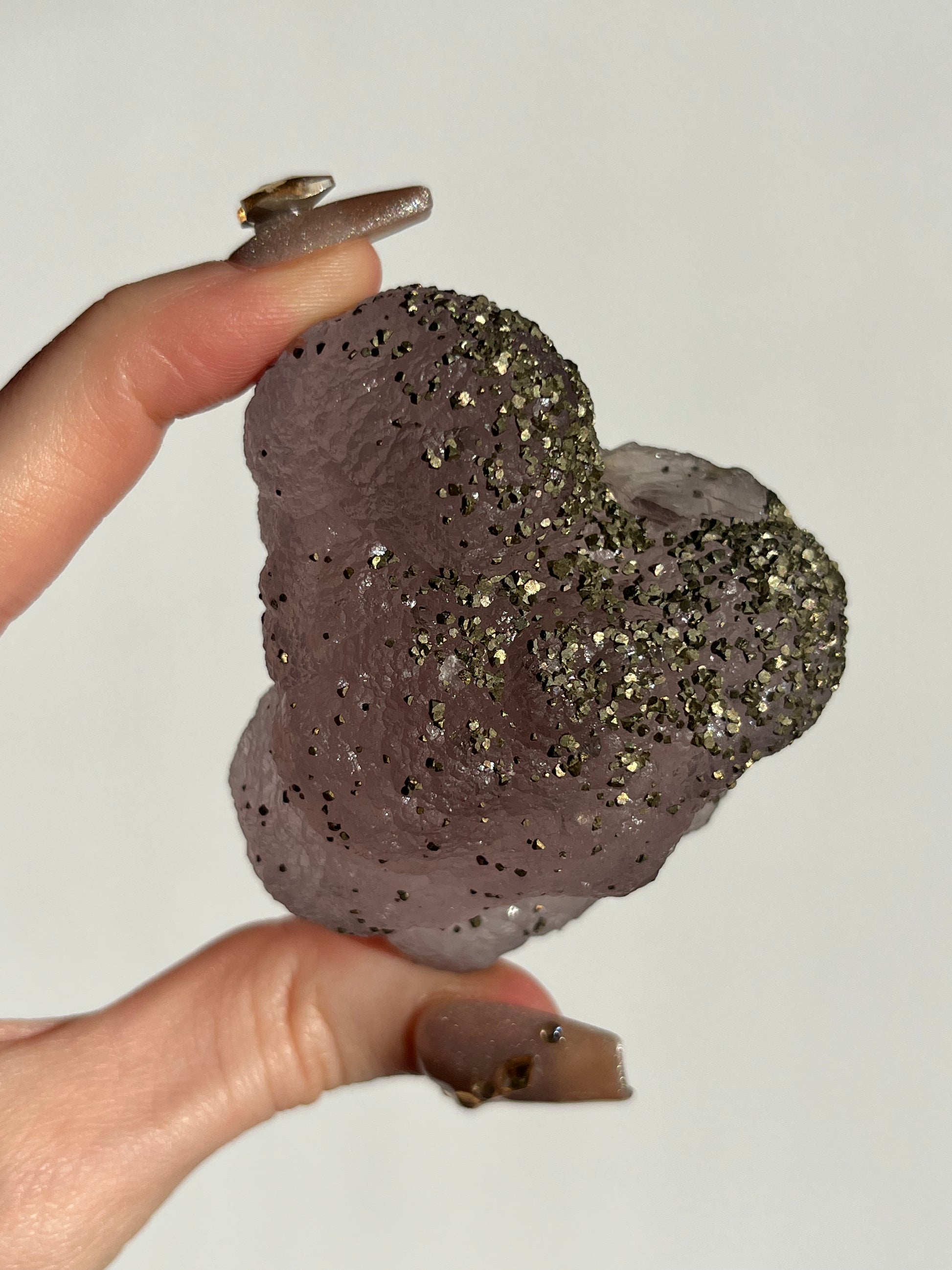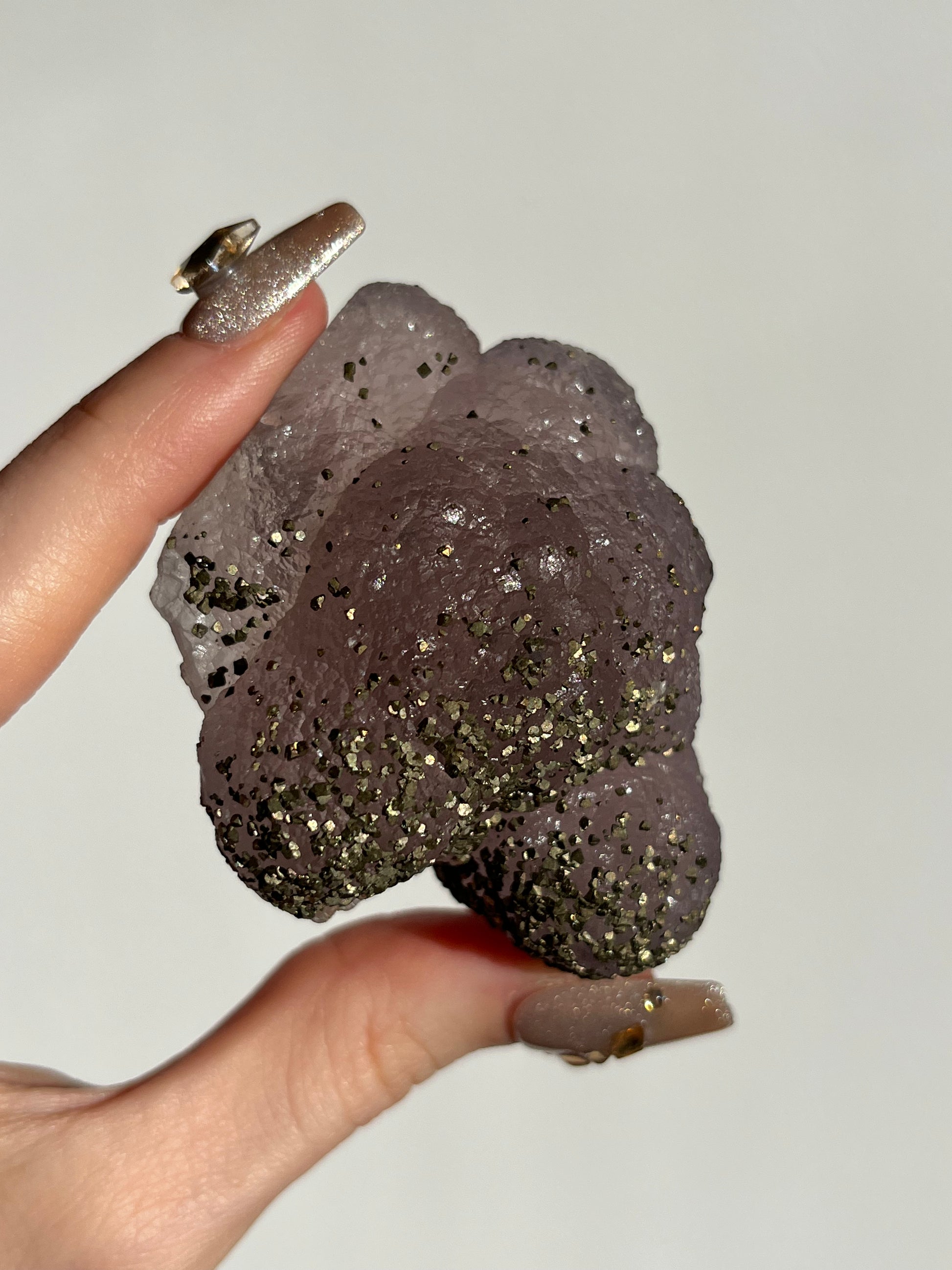 Metaphysically, this rare pairing of Purple Botryoidal Fluorite and Pyrite serves as a bridge between intuition and strength. The grape-like formations of this fluorite variety soothe the mind and awaken the third eye, while golden pyrite anchors in a sense of confidence, protection, and personal power. Working together to promote clarity, energetic shielding, and visionary insight that is grounded in action.