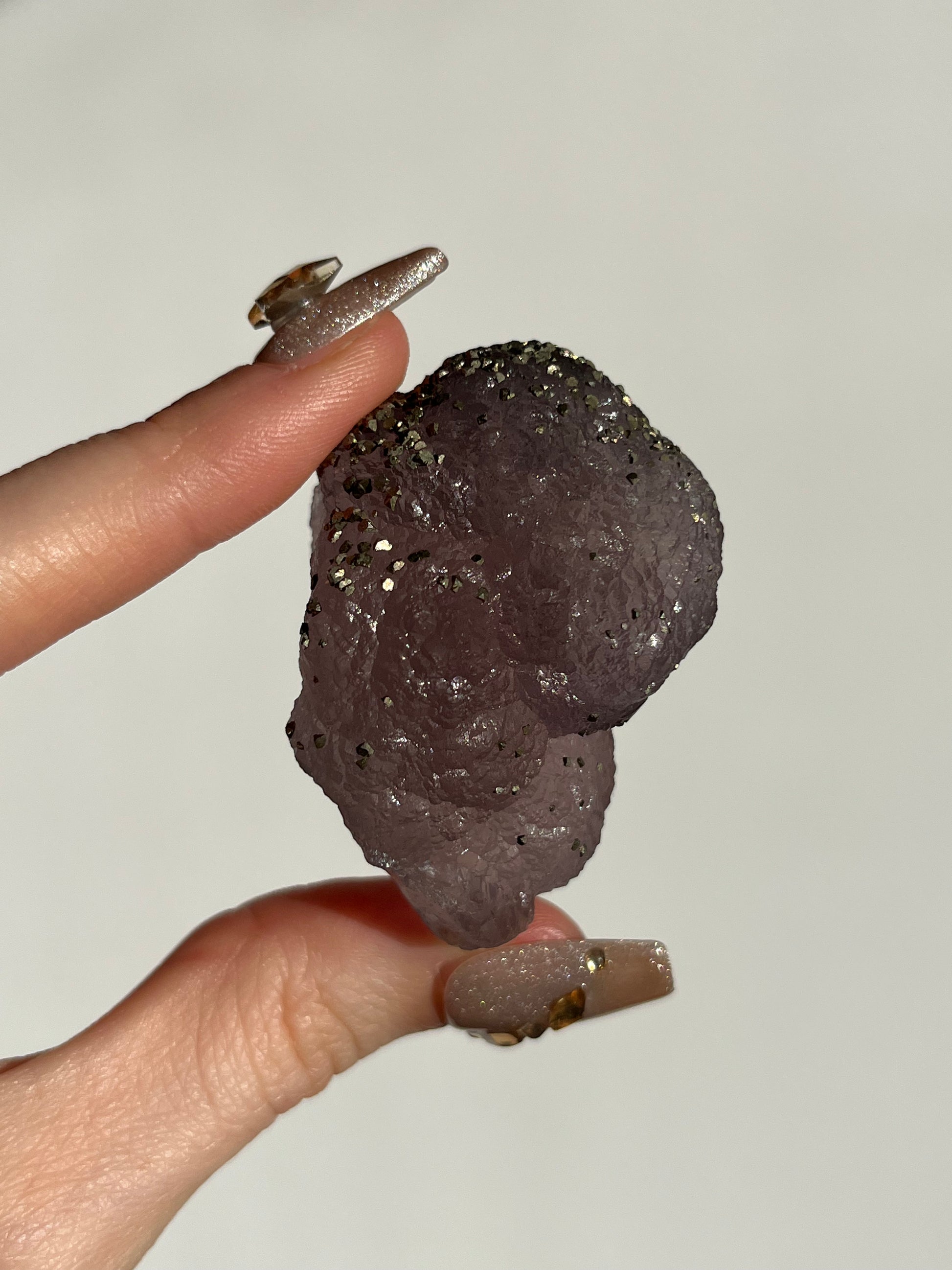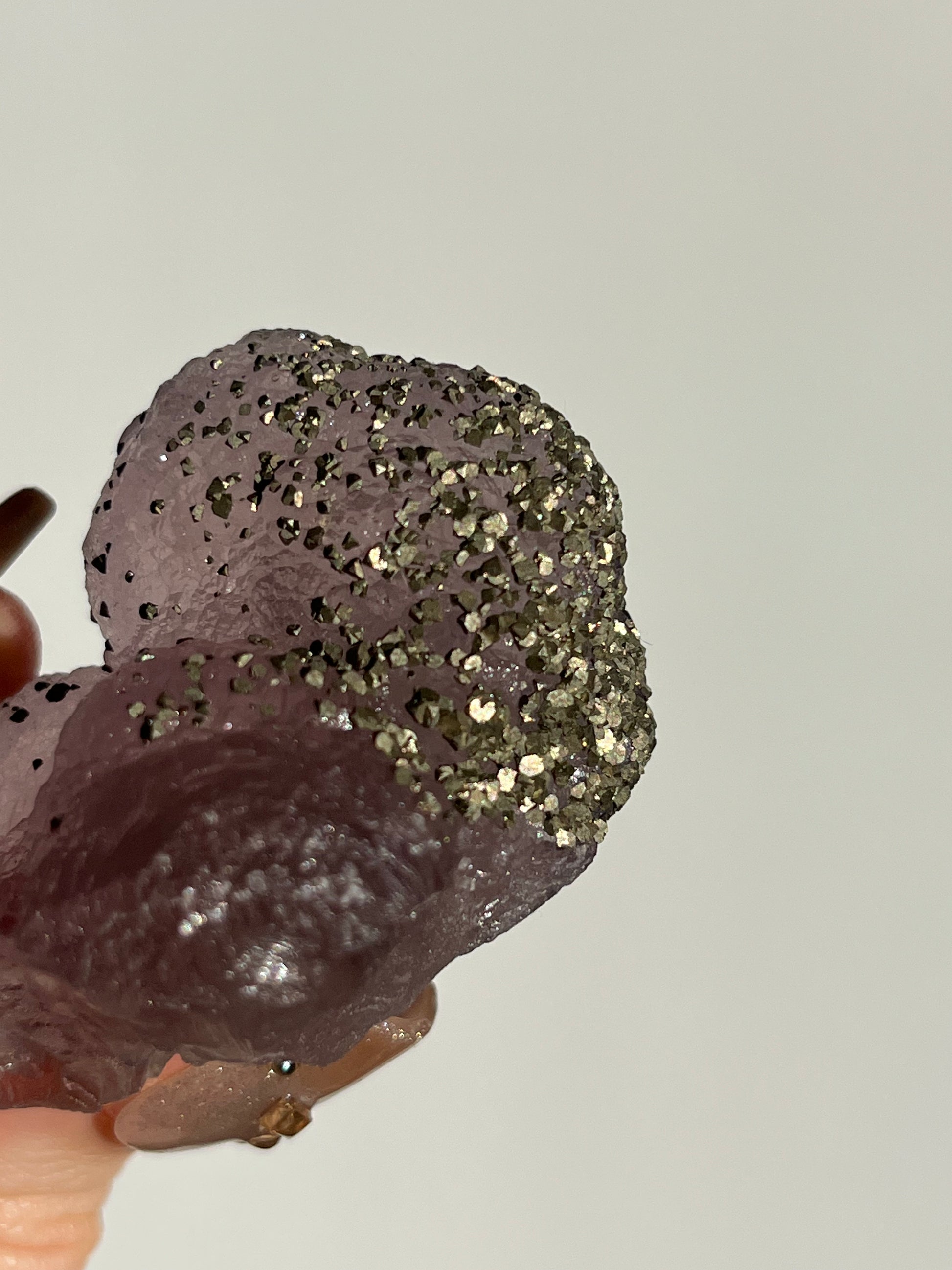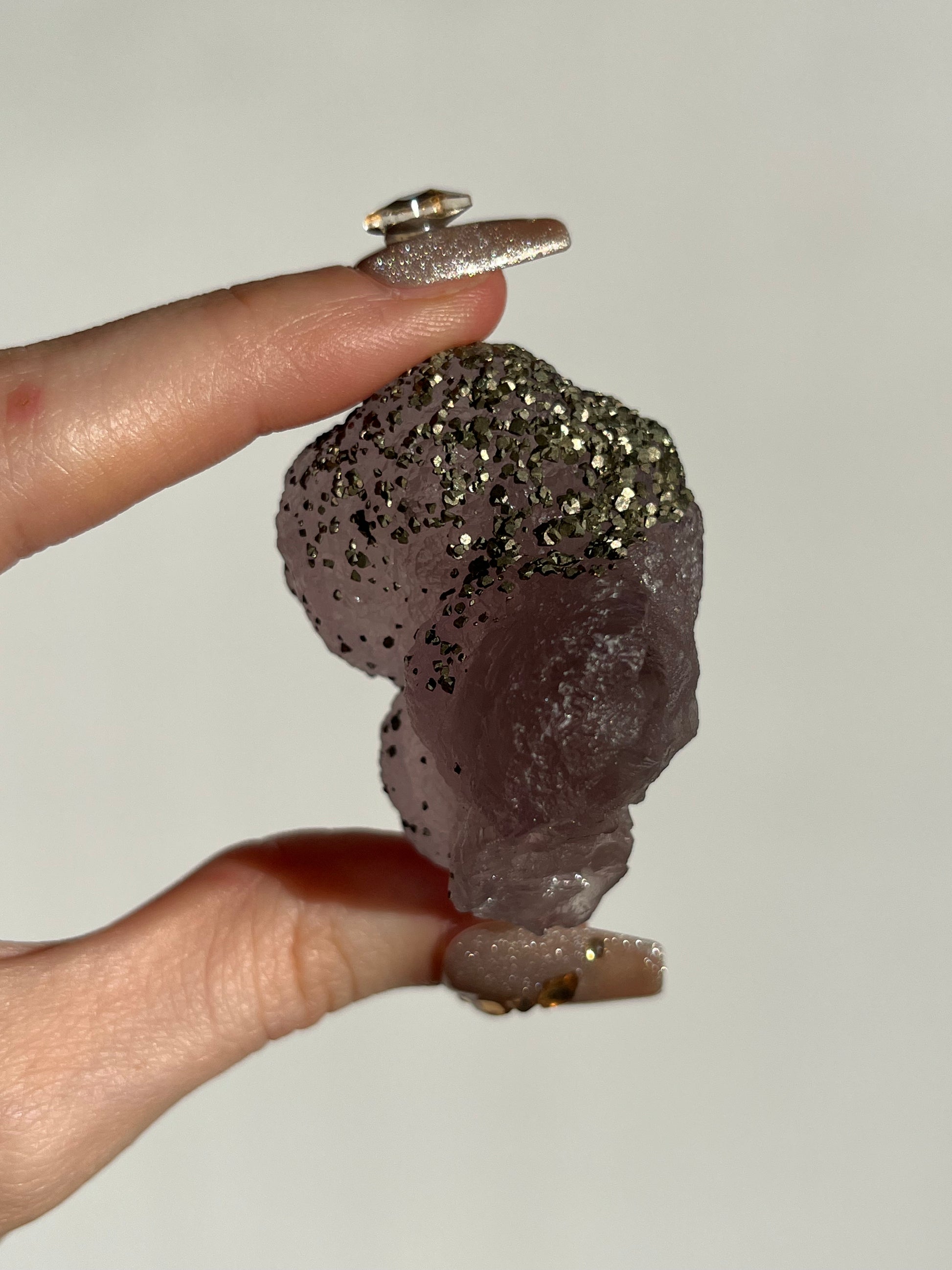 Metaphysically, this rare pairing of Purple Botryoidal Fluorite and Pyrite serves as a bridge between intuition and strength. The grape-like formations of this fluorite variety soothe the mind and awaken the third eye, while golden pyrite anchors in a sense of confidence, protection, and personal power. Working together to promote clarity, energetic shielding, and visionary insight that is grounded in action.