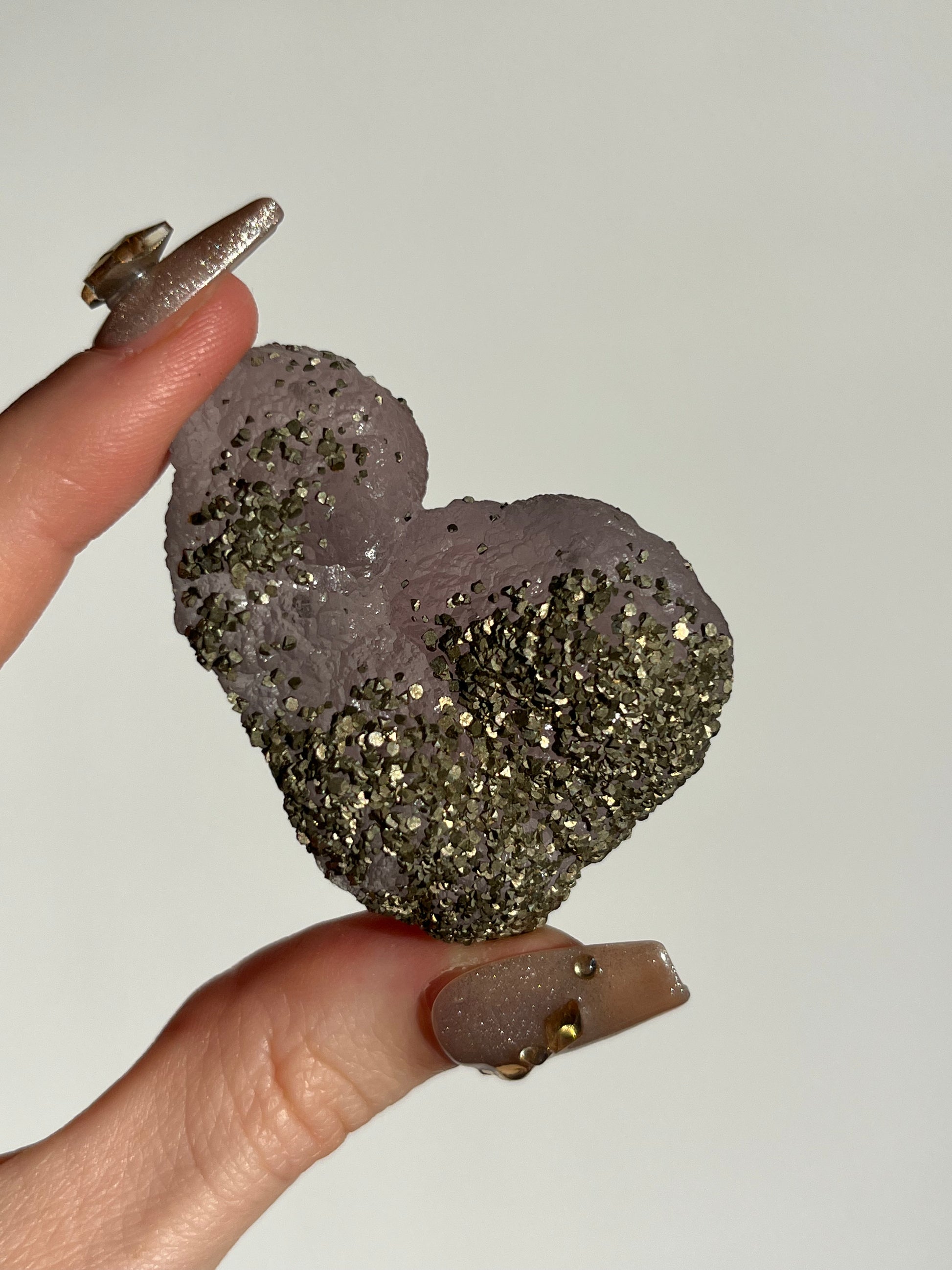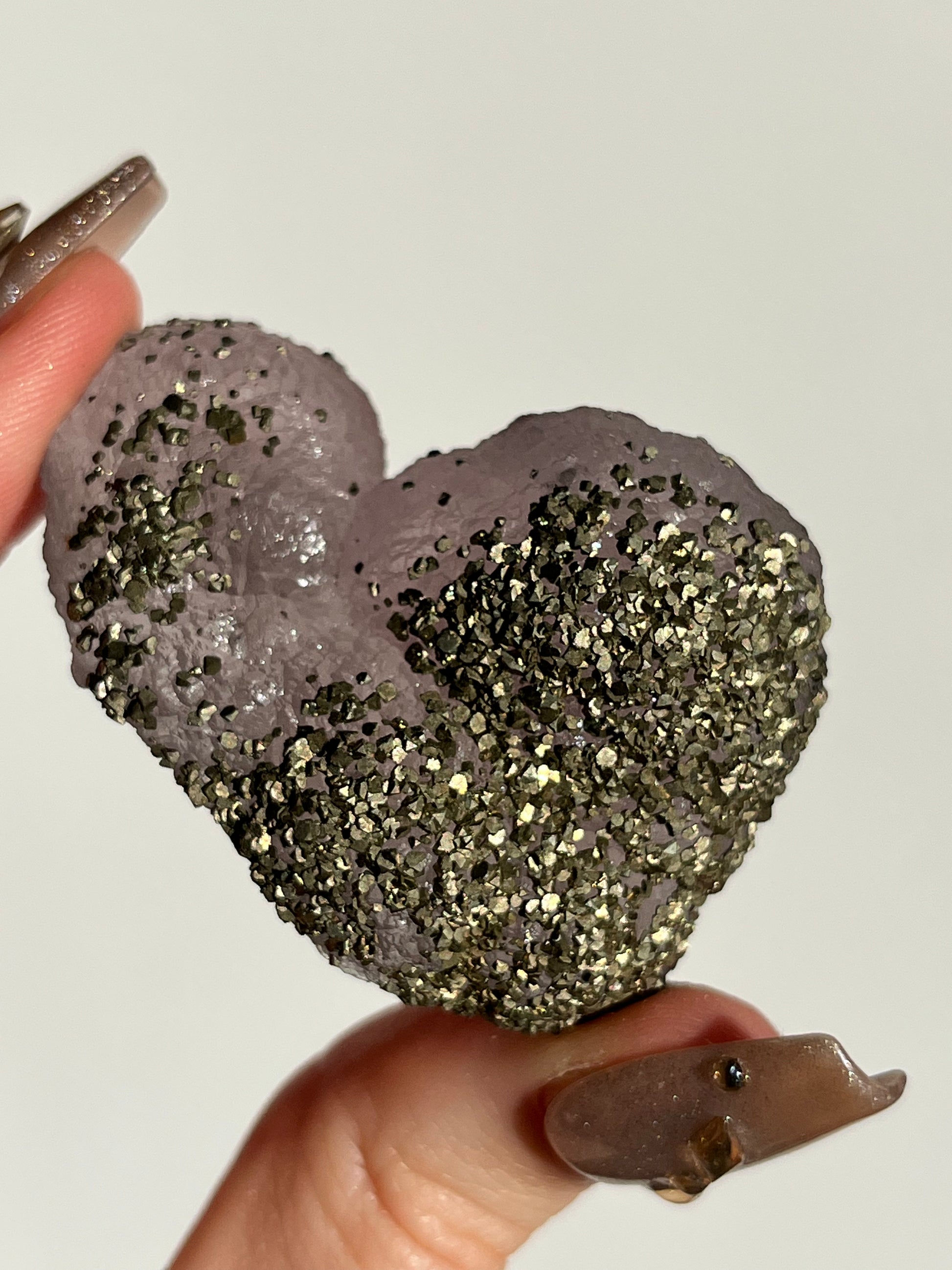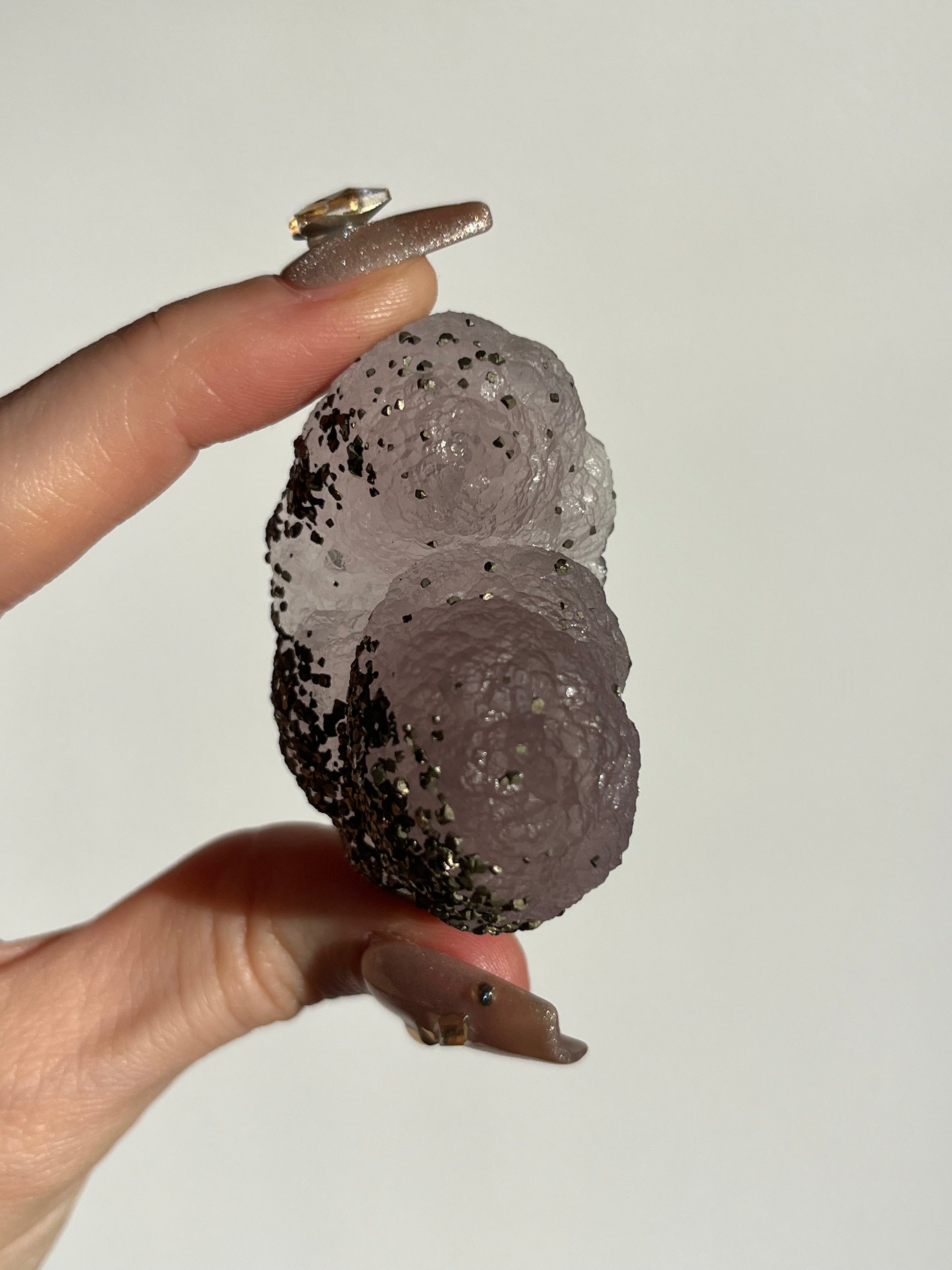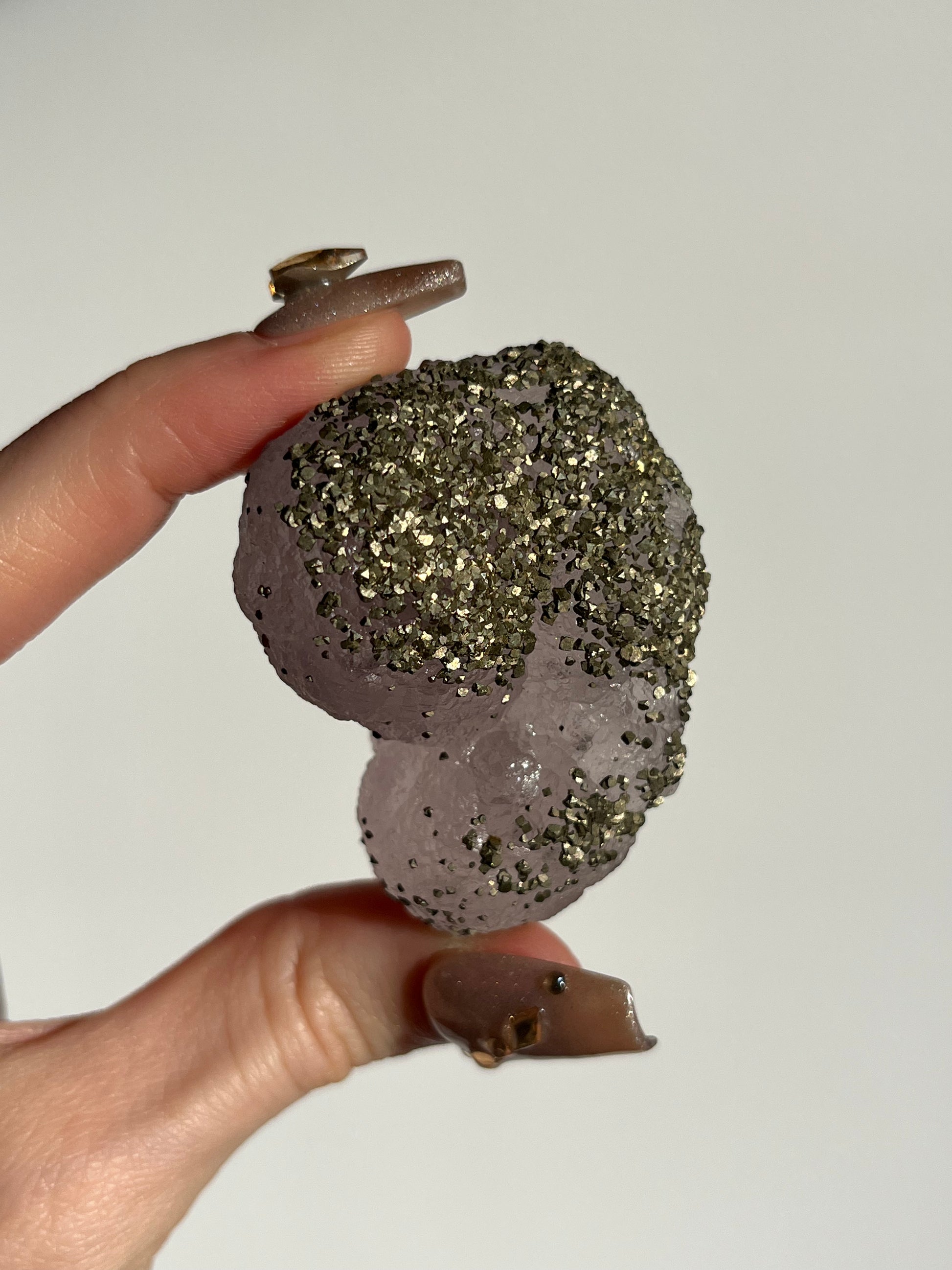 Metaphysically, this rare pairing of Purple Botryoidal Fluorite and Pyrite serves as a bridge between intuition and strength. The grape-like formations of this fluorite variety soothe the mind and awaken the third eye, while golden pyrite anchors in a sense of confidence, protection, and personal power. Working together to promote clarity, energetic shielding, and visionary insight that is grounded in action.