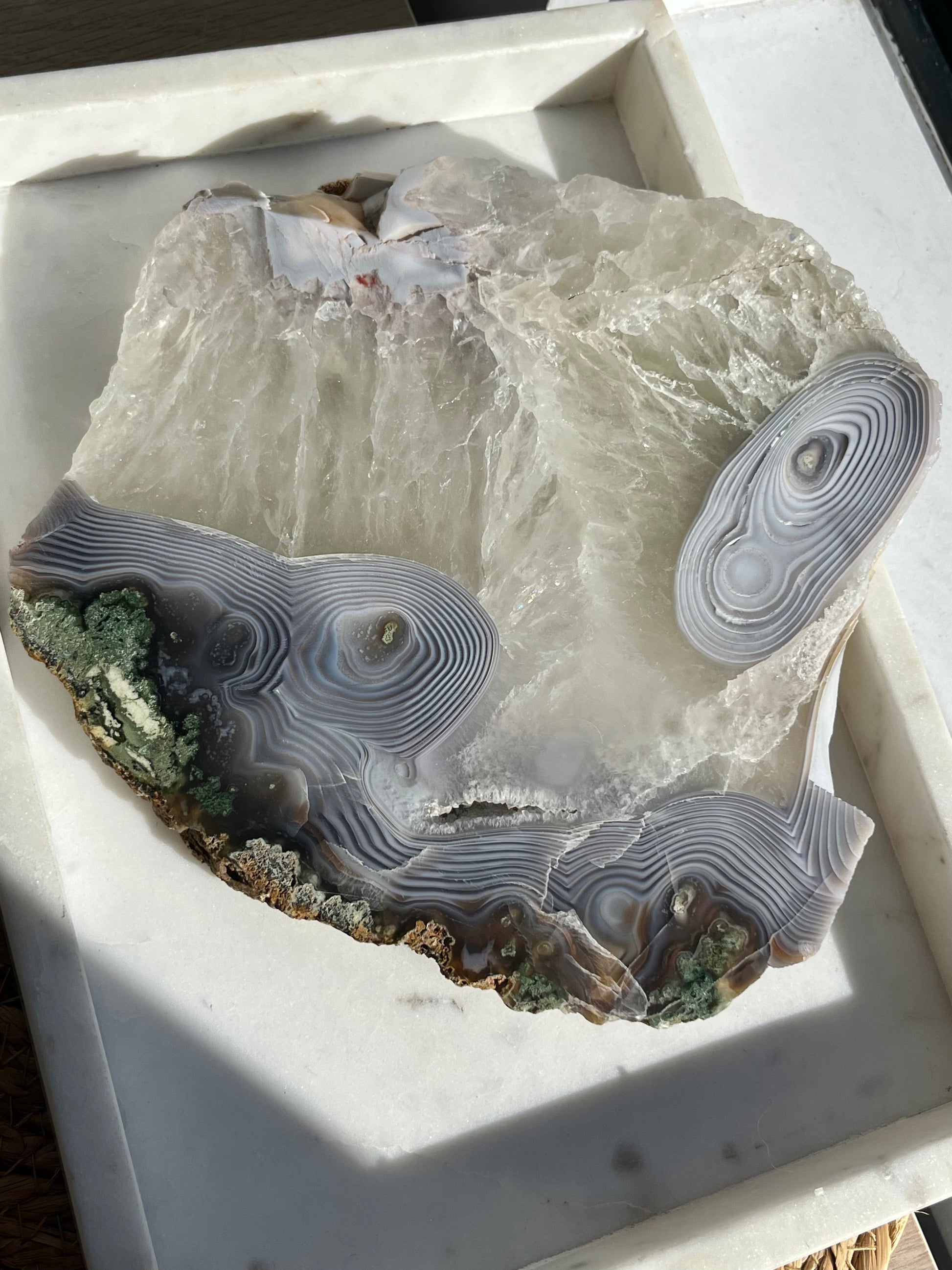 La ágata Danau o “Lago” es una ágata intensamente calmante. Con sus tonos violeta claro que se encuentran con el musgo terroso, es un recordatorio de cómo debemos llevar nuestras vidas: al unísono con nuestra alma espiritual acuosa y nuestra vida física terrenal.