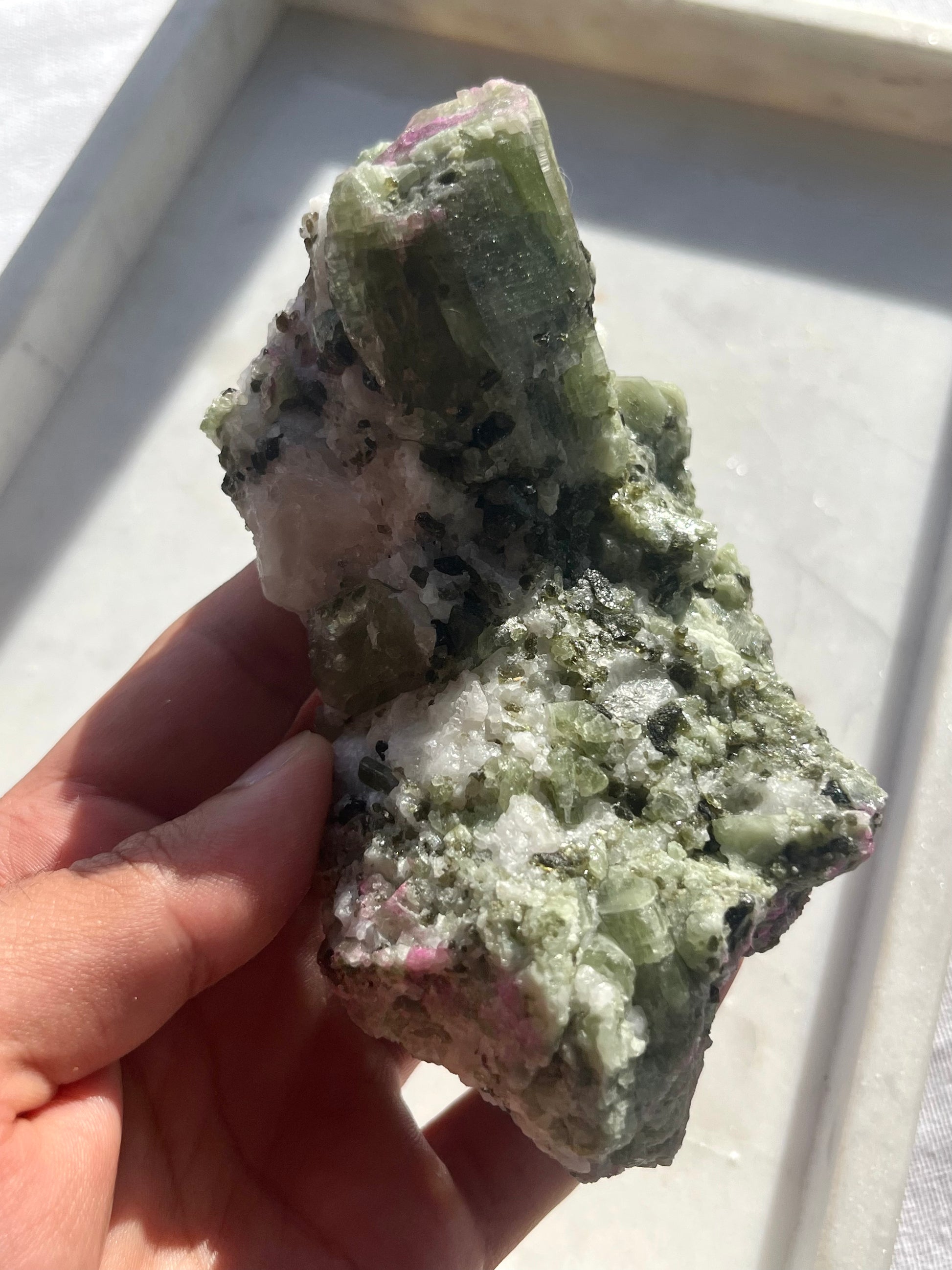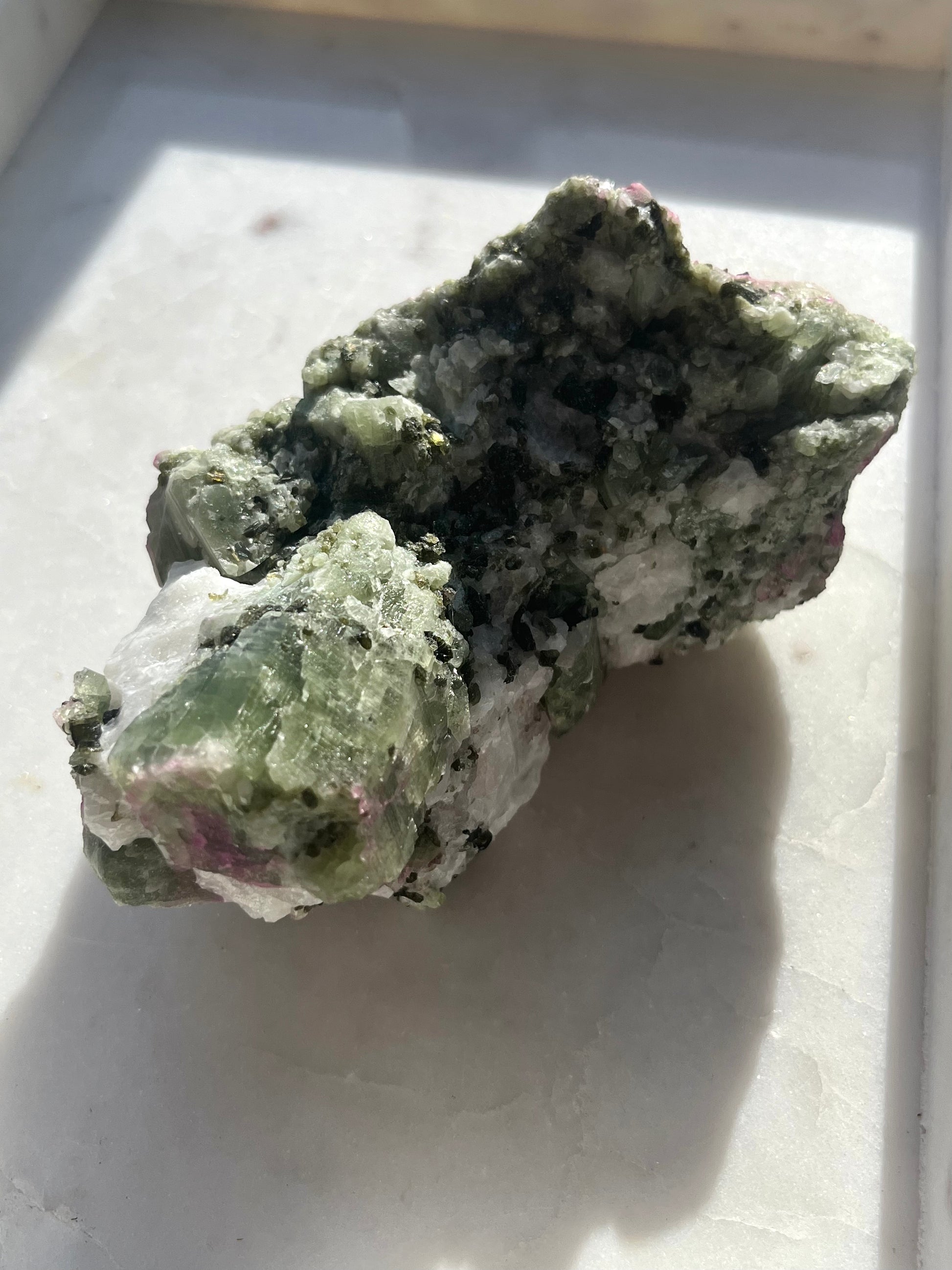 Espécimen de diópsido con sodalita rosa y moscovita en matriz de mármol #4