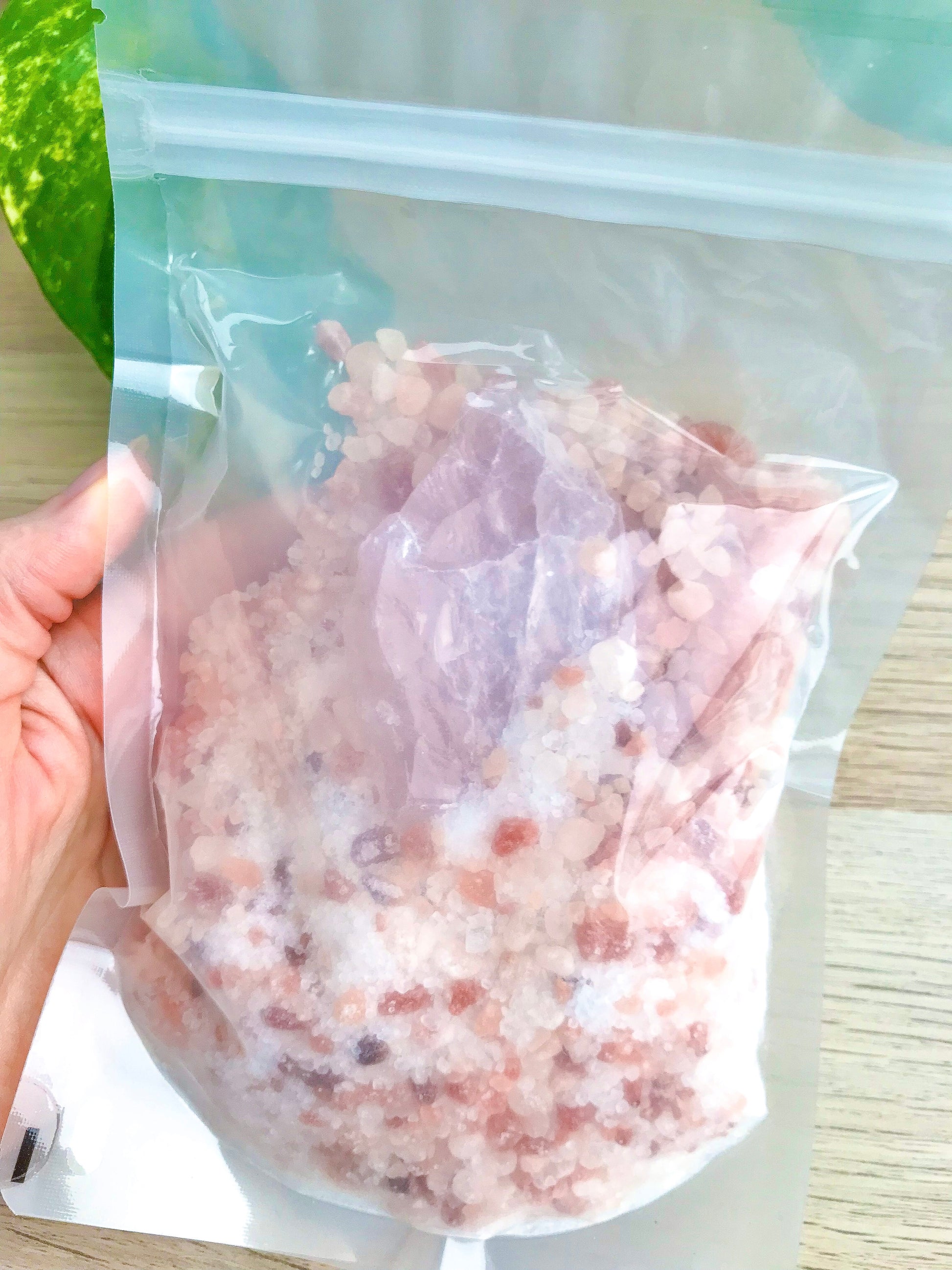 Tamaño: 250 g de sales de baño premium en una bolsa compostable. Opción para con y sin cristal.