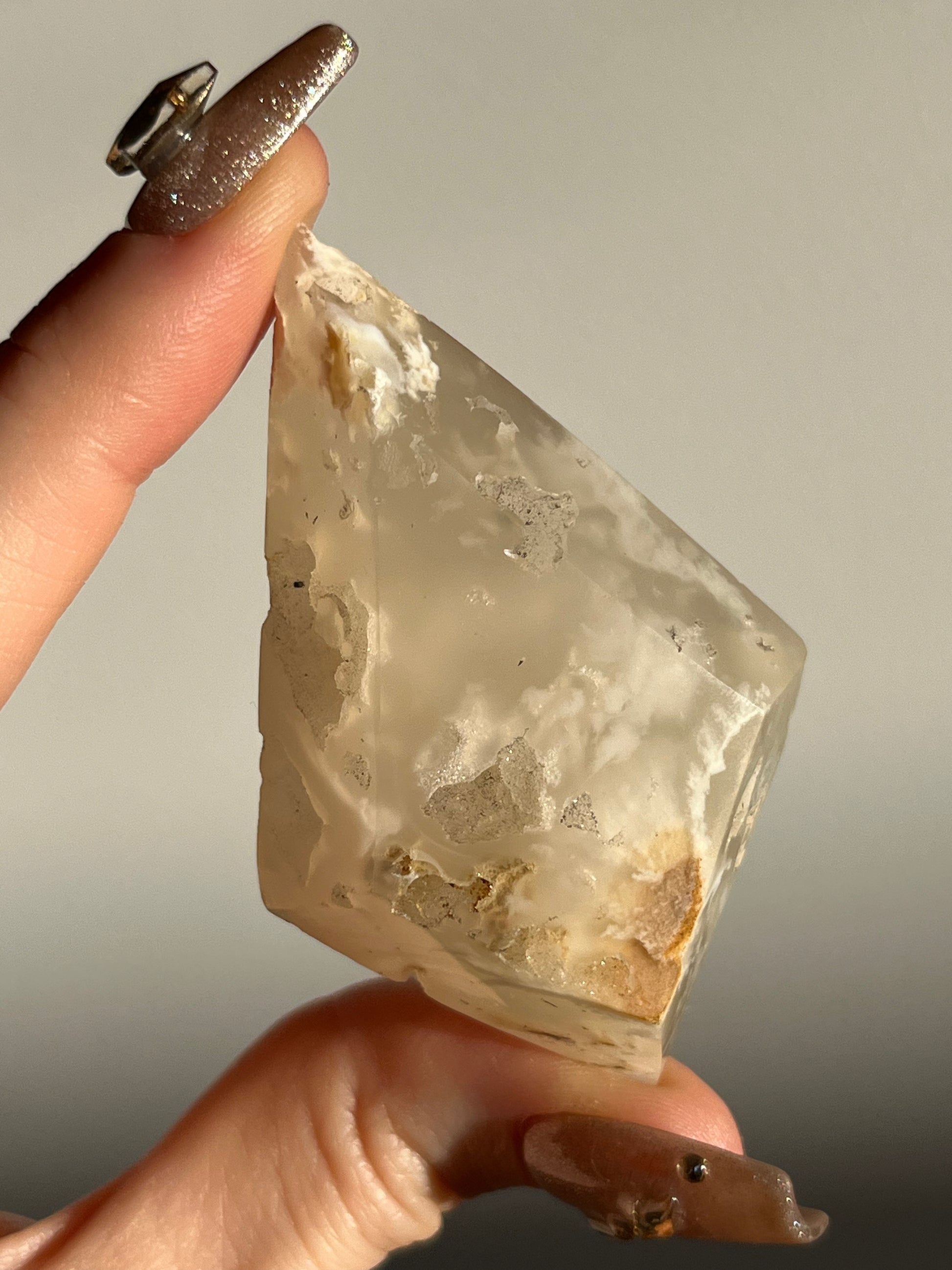 An unearthed discovery of Indonesian Flower Agate that bears delicate cream coloured plume chalcedony patterns set in amongst a neutral toned chalcedony. An elegant and show stopping variant of the more common pink hued Madagascan variety.