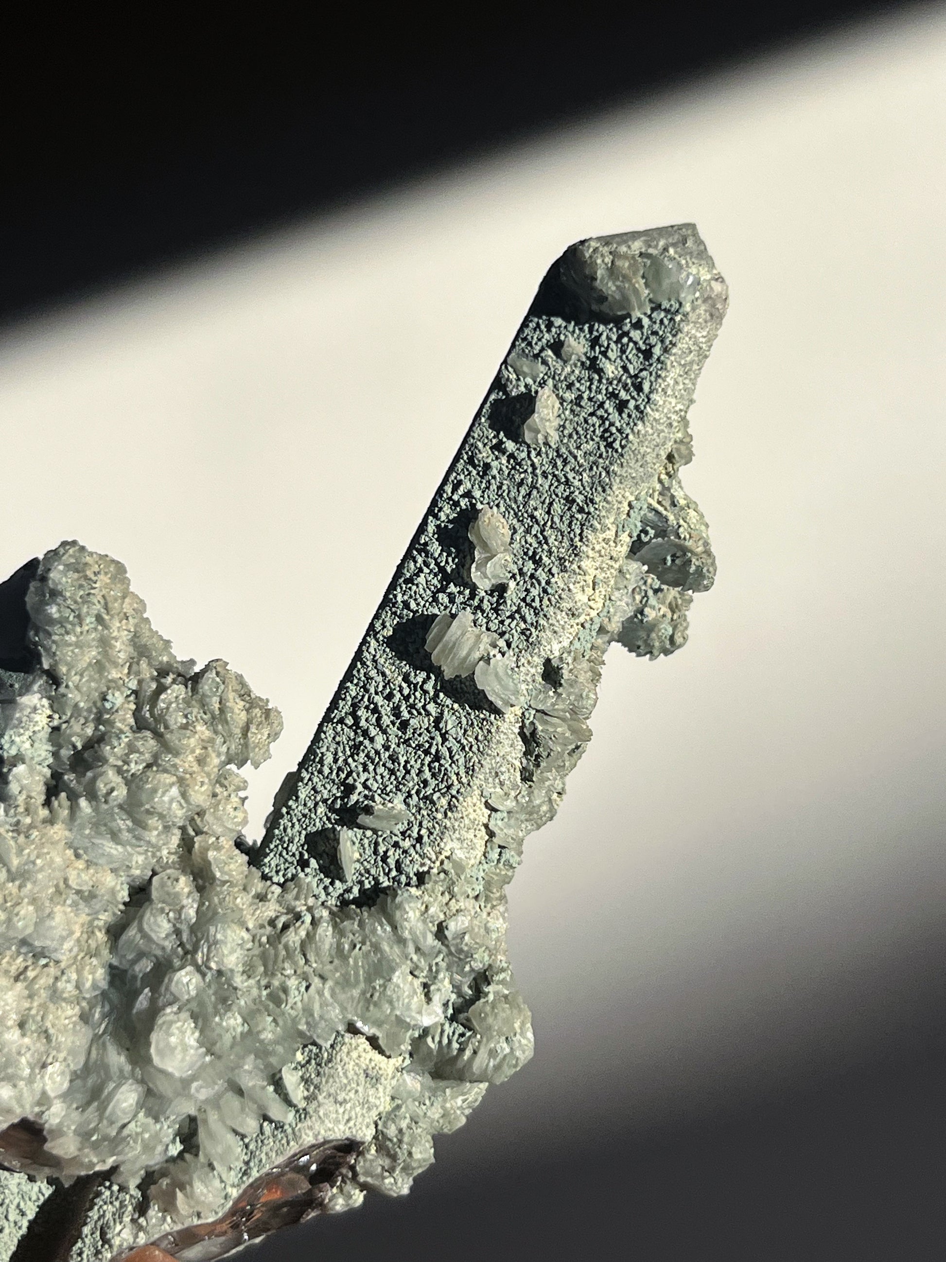 This recent and rare find of Chinese Quartz features a soft green chlorite coating and delicate calcite petals that resemble ancient coin-like blooms.