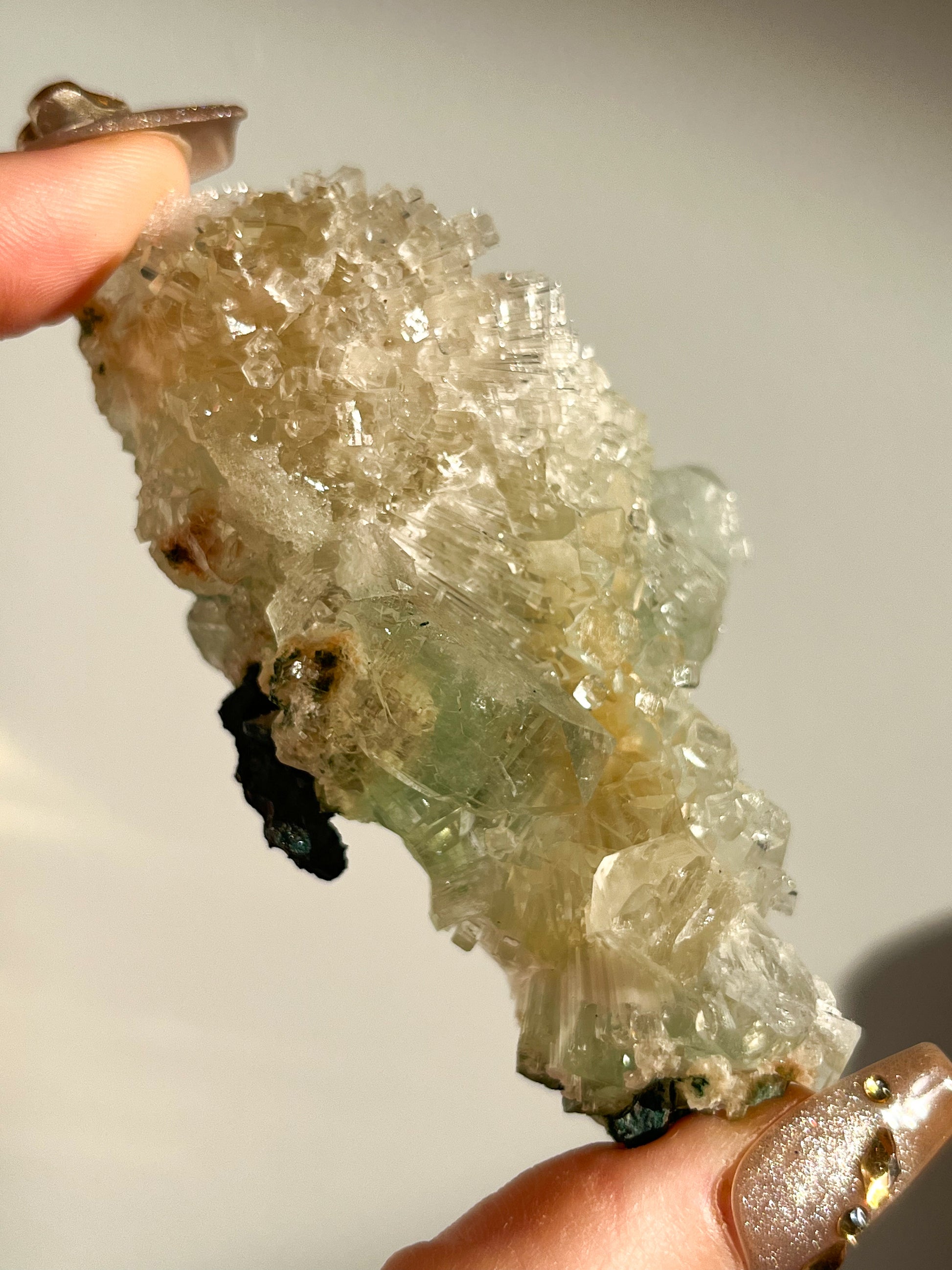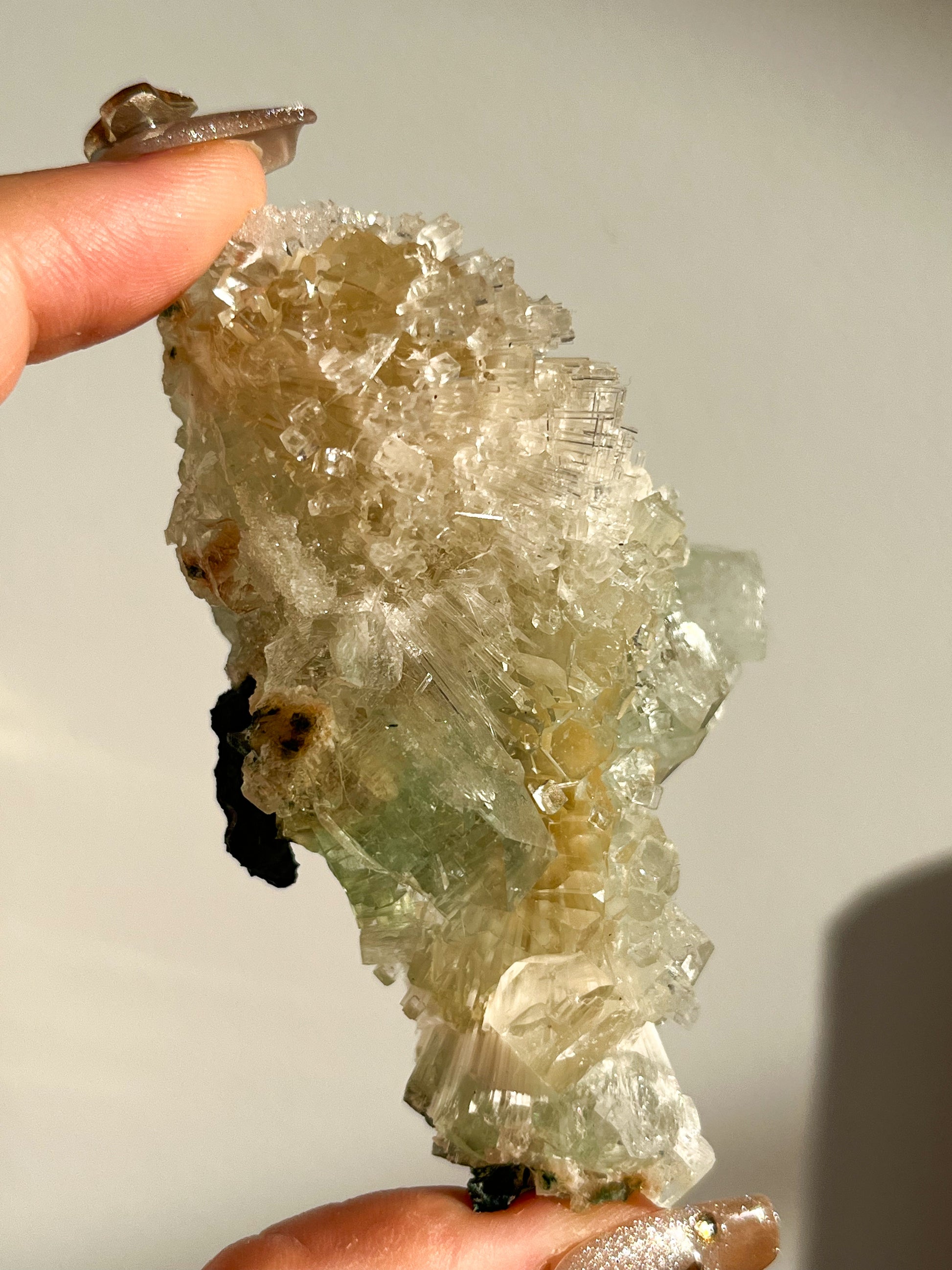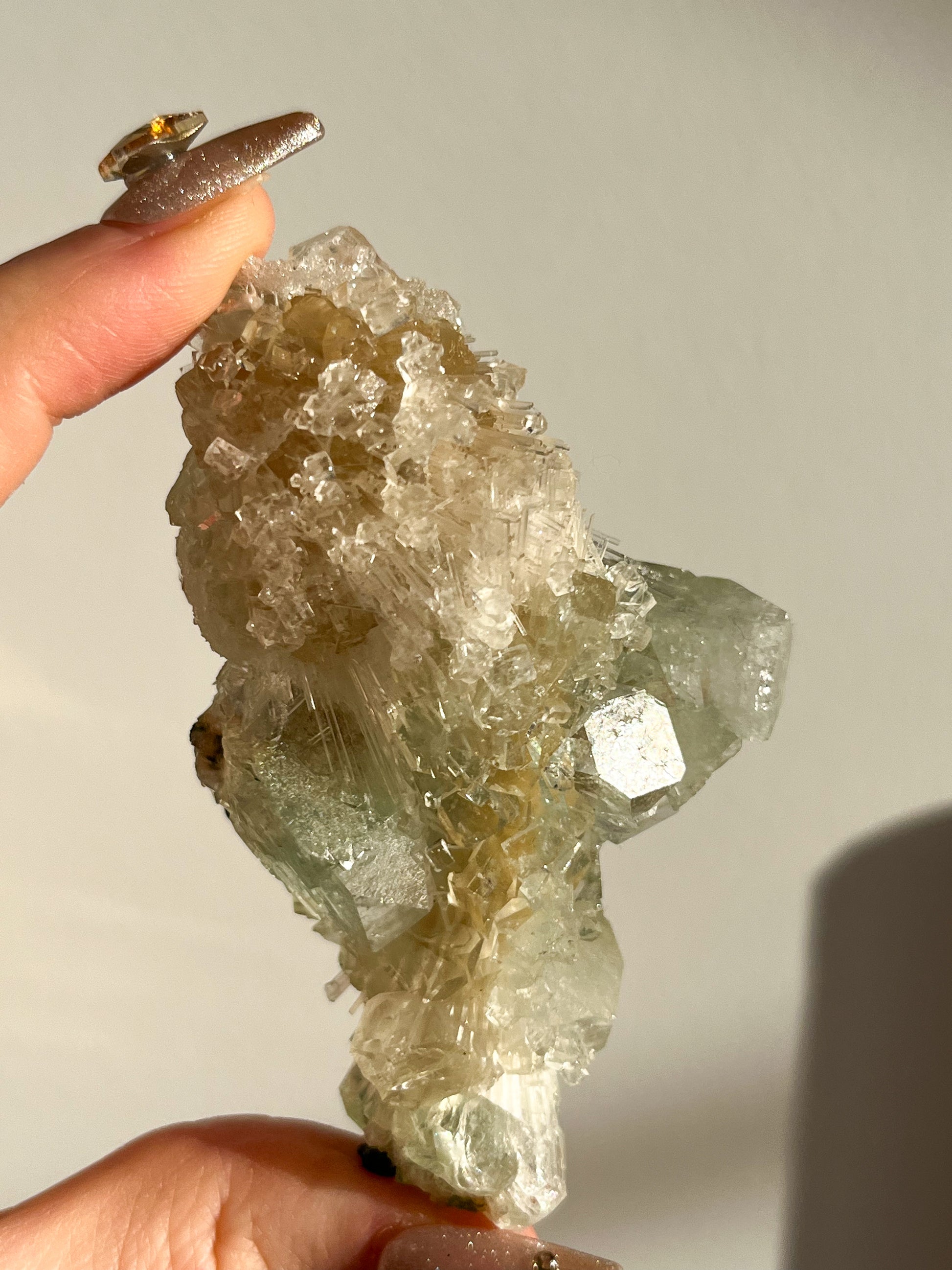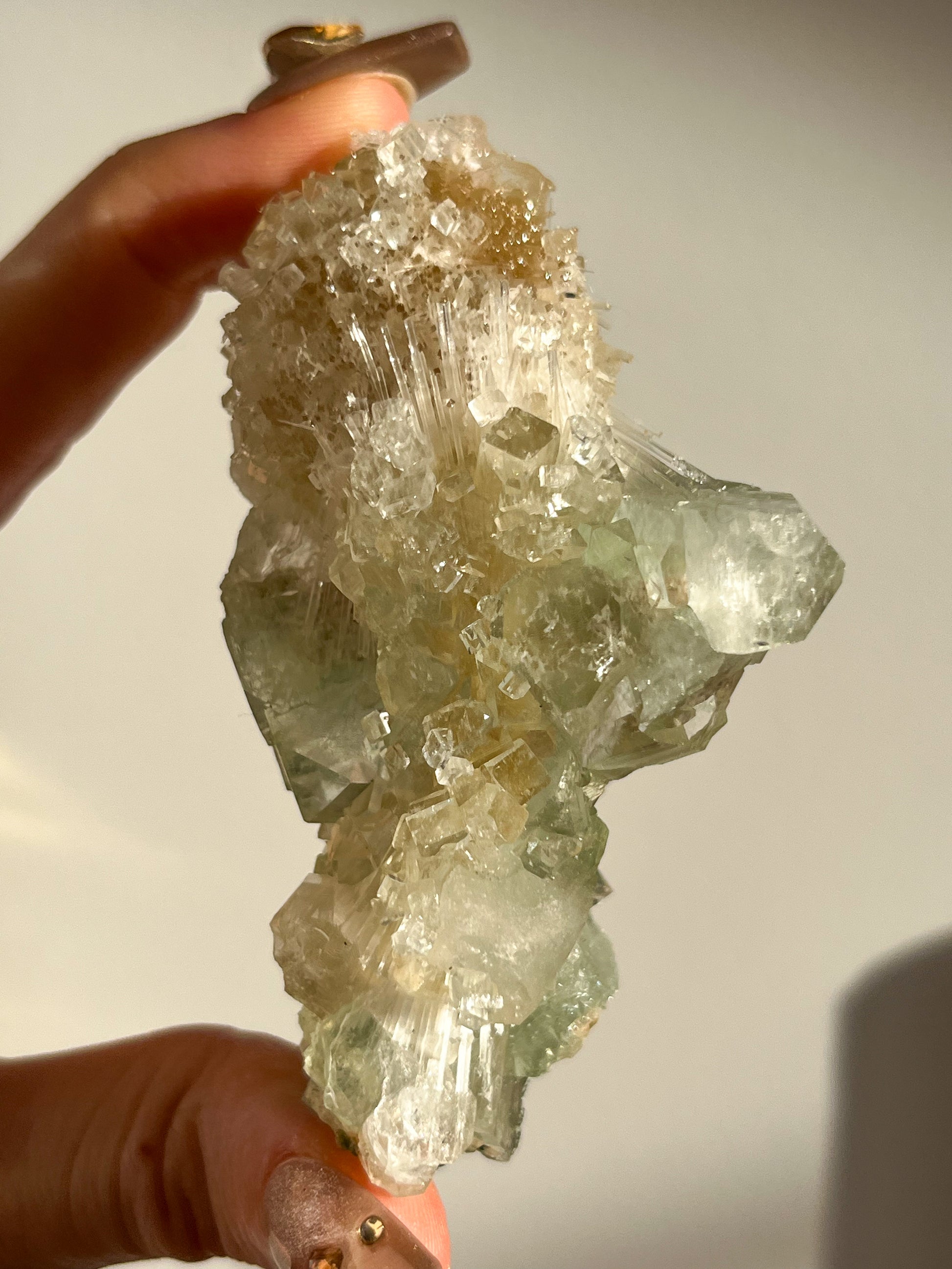 This find of Green Apophyllite, Thomsonite, Mesolite & Calcite specimens are a recent find in 2024 from the Apophyllite mines of India. This latest mineral discovery is from only one find. Making this desirable crystal combination not only rare, but a very exciting one.