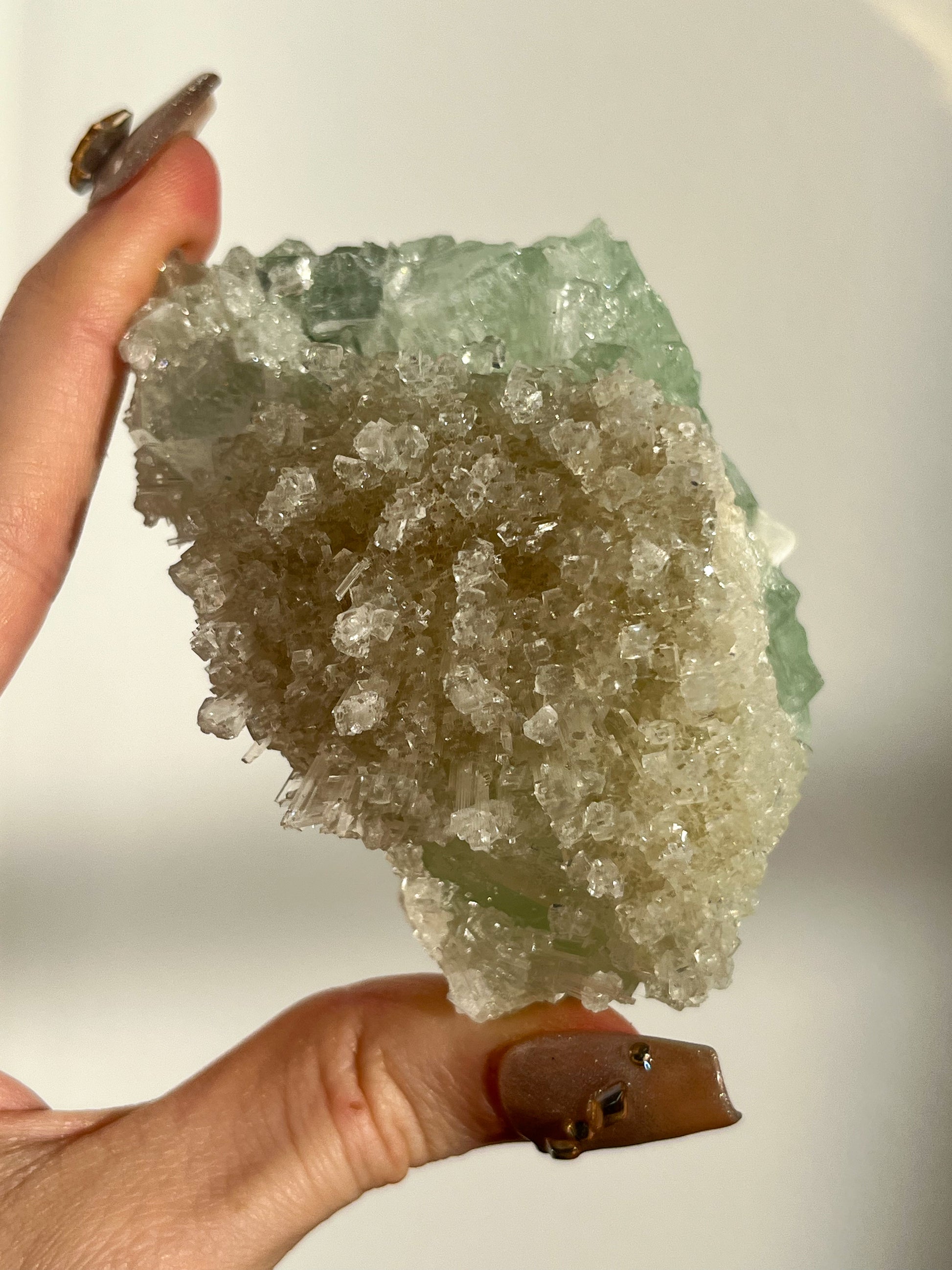 This find of Green Apophyllite, Thomsonite, Mesolite & Calcite specimens are a recent find in 2024 from the Apophyllite mines of India. This latest mineral discovery is from only one find. Making this desirable crystal combination not only rare, but a very exciting one.