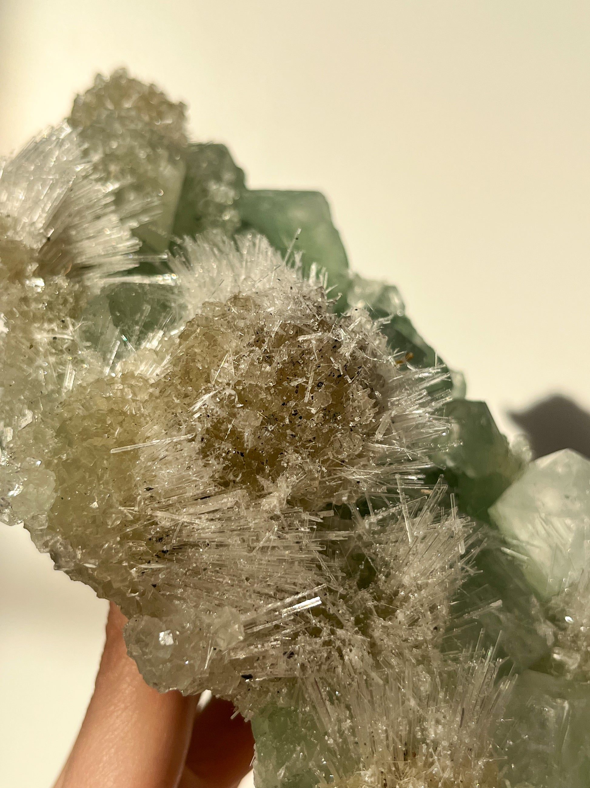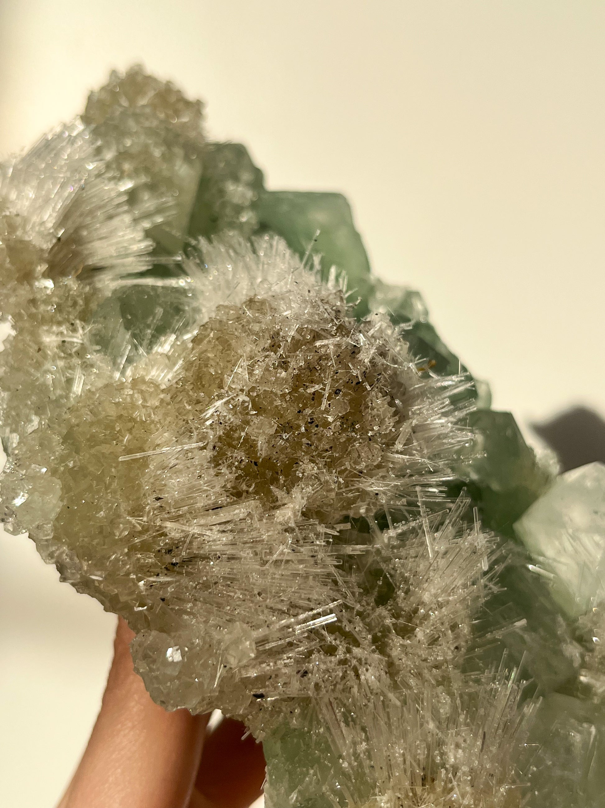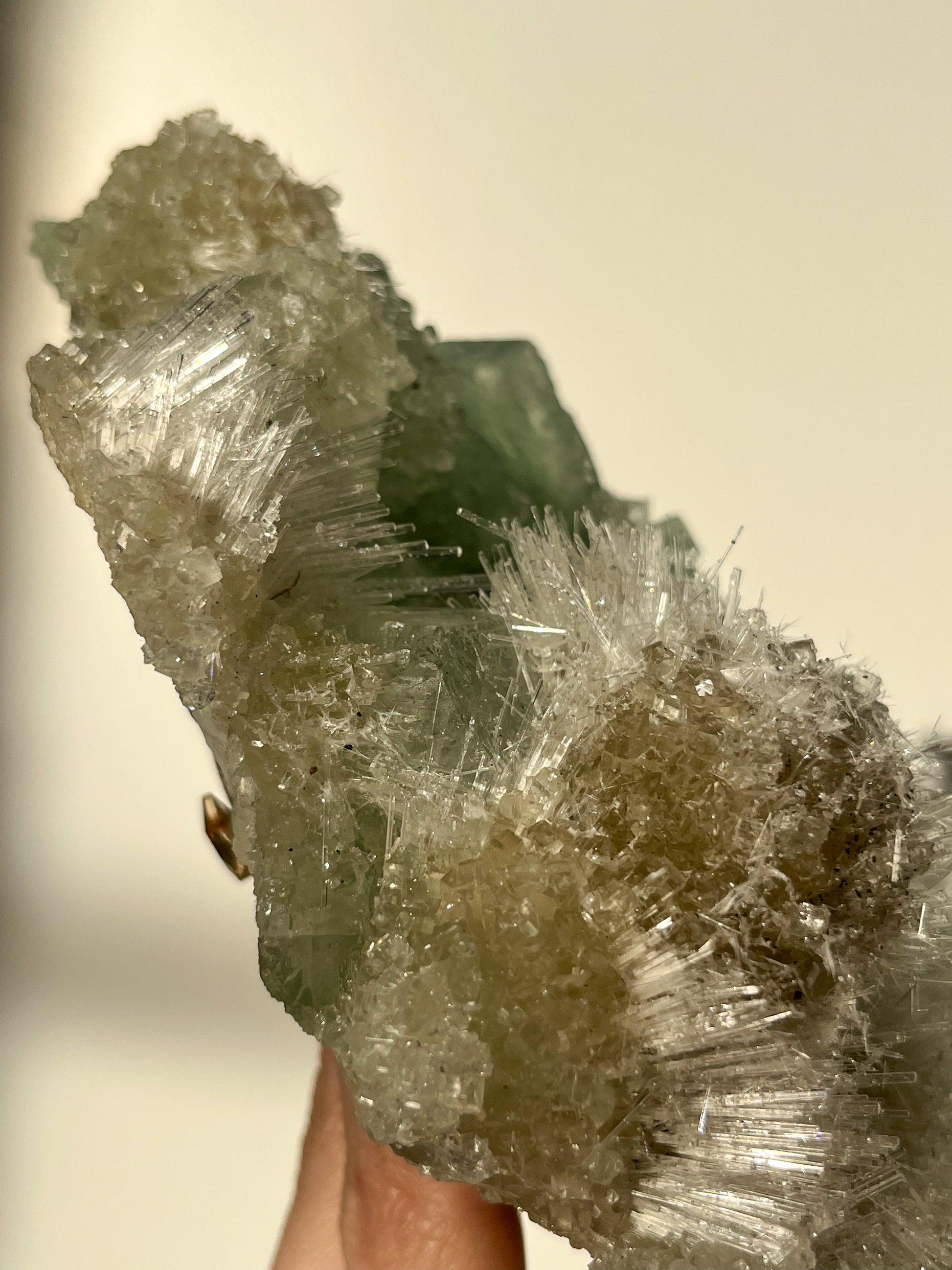 This find of Green Apophyllite, Thomsonite, Mesolite & Calcite specimens are a recent find in 2024 from the Apophyllite mines of India. This latest mineral discovery is from only one find. Making this desirable crystal combination not only rare, but a very exciting one.