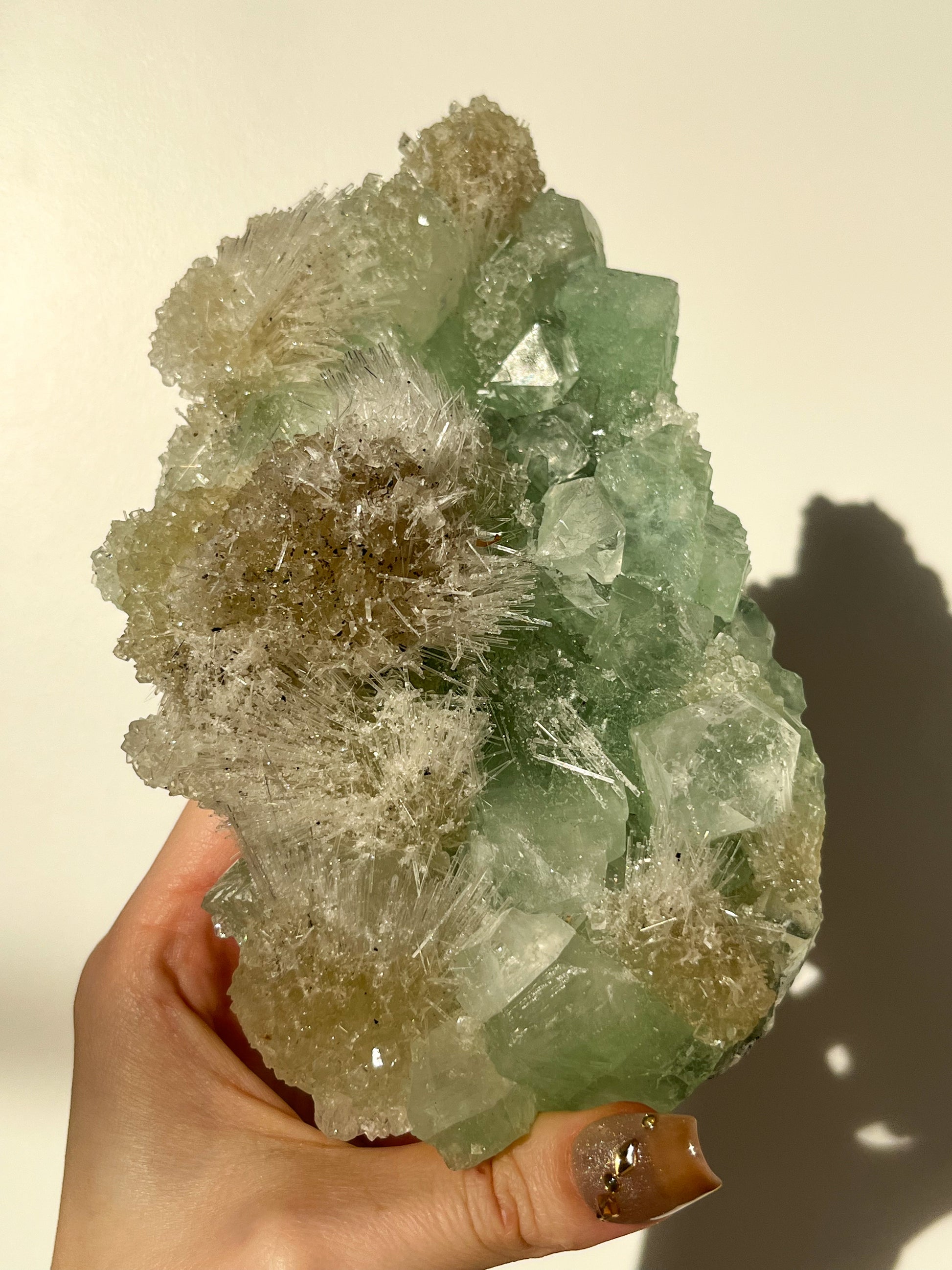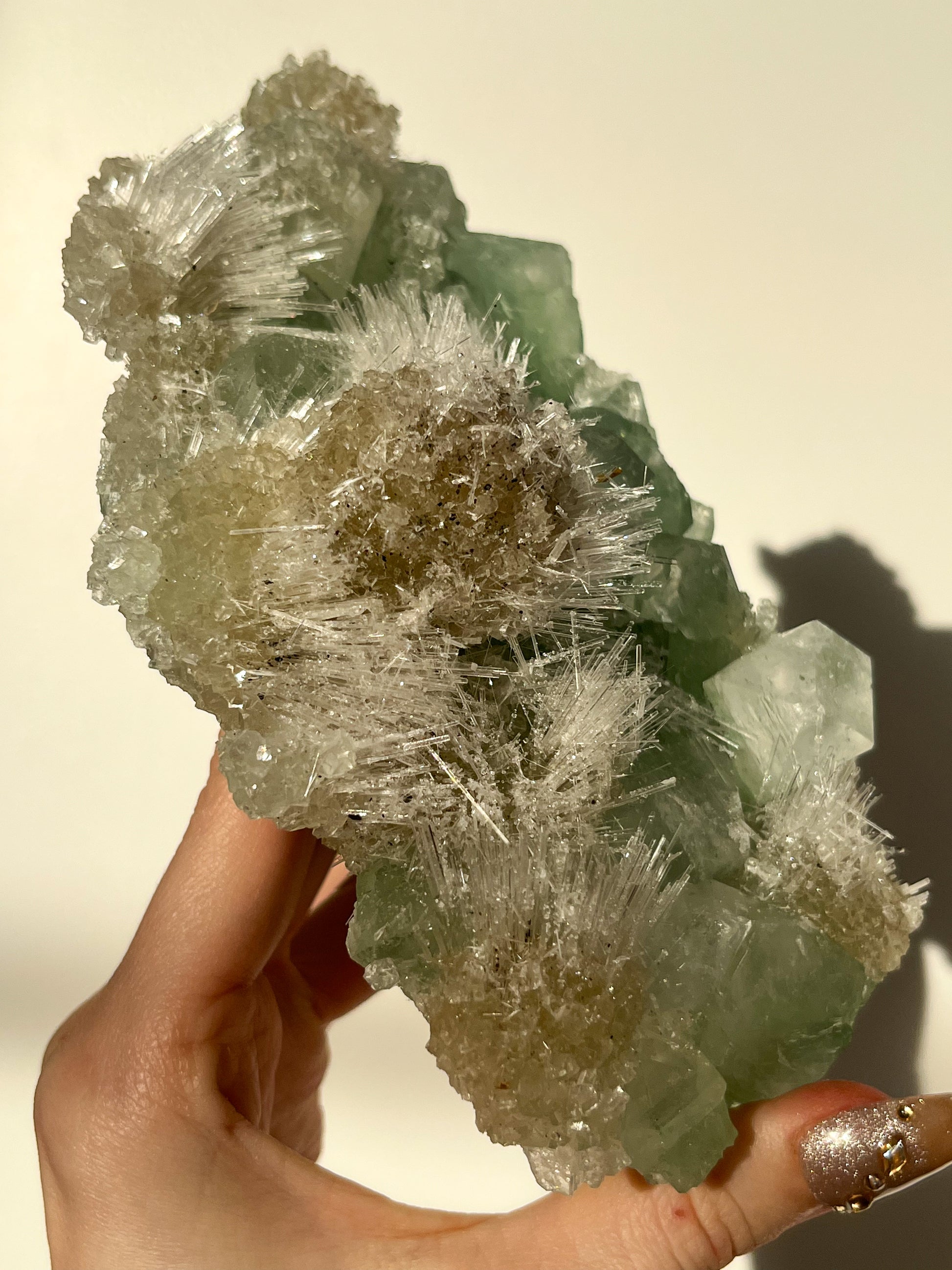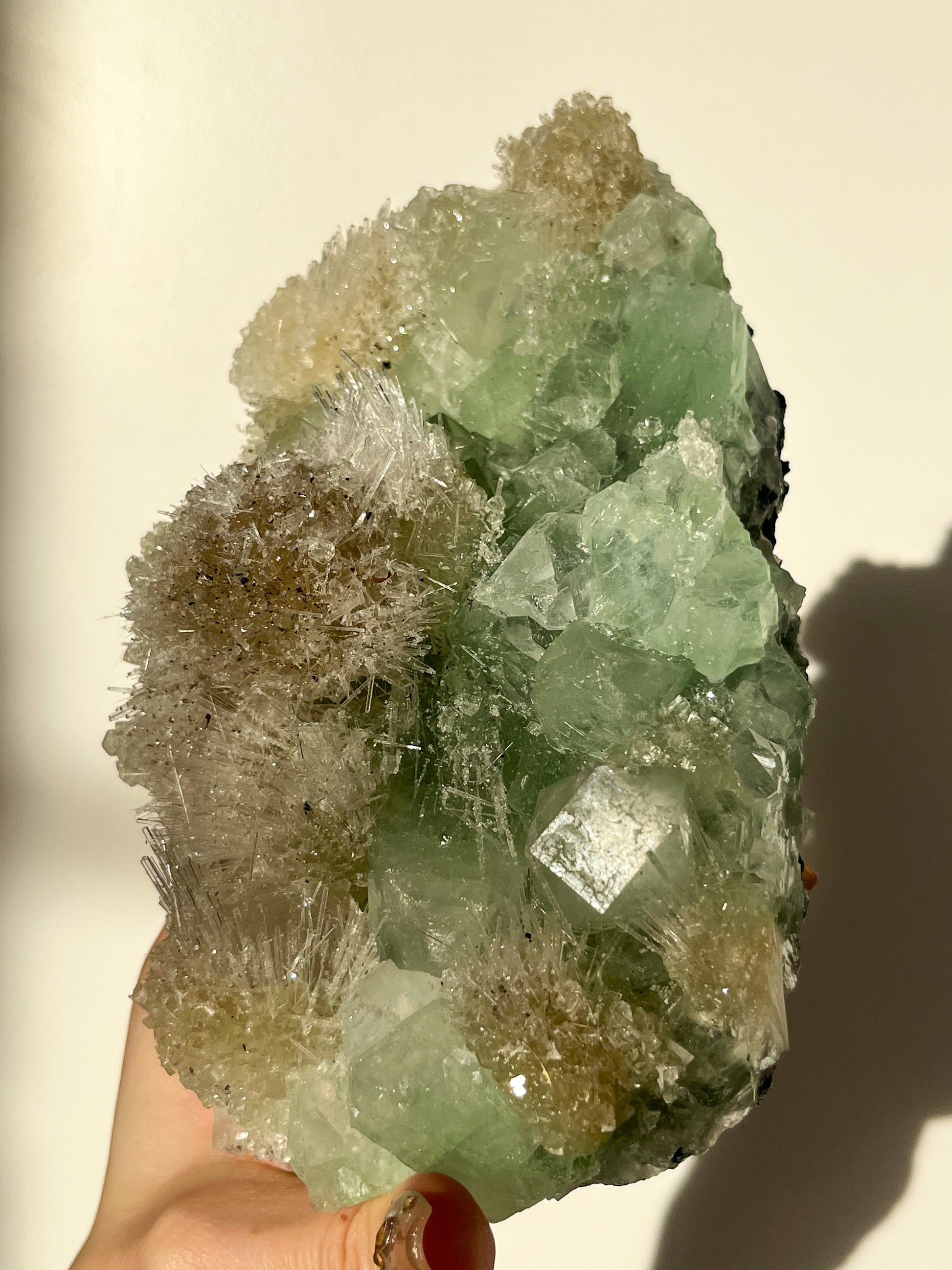 This find of Green Apophyllite, Thomsonite, Mesolite & Calcite specimens are a recent find in 2024 from the Apophyllite mines of India. This latest mineral discovery is from only one find. Making this desirable crystal combination not only rare, but a very exciting one.