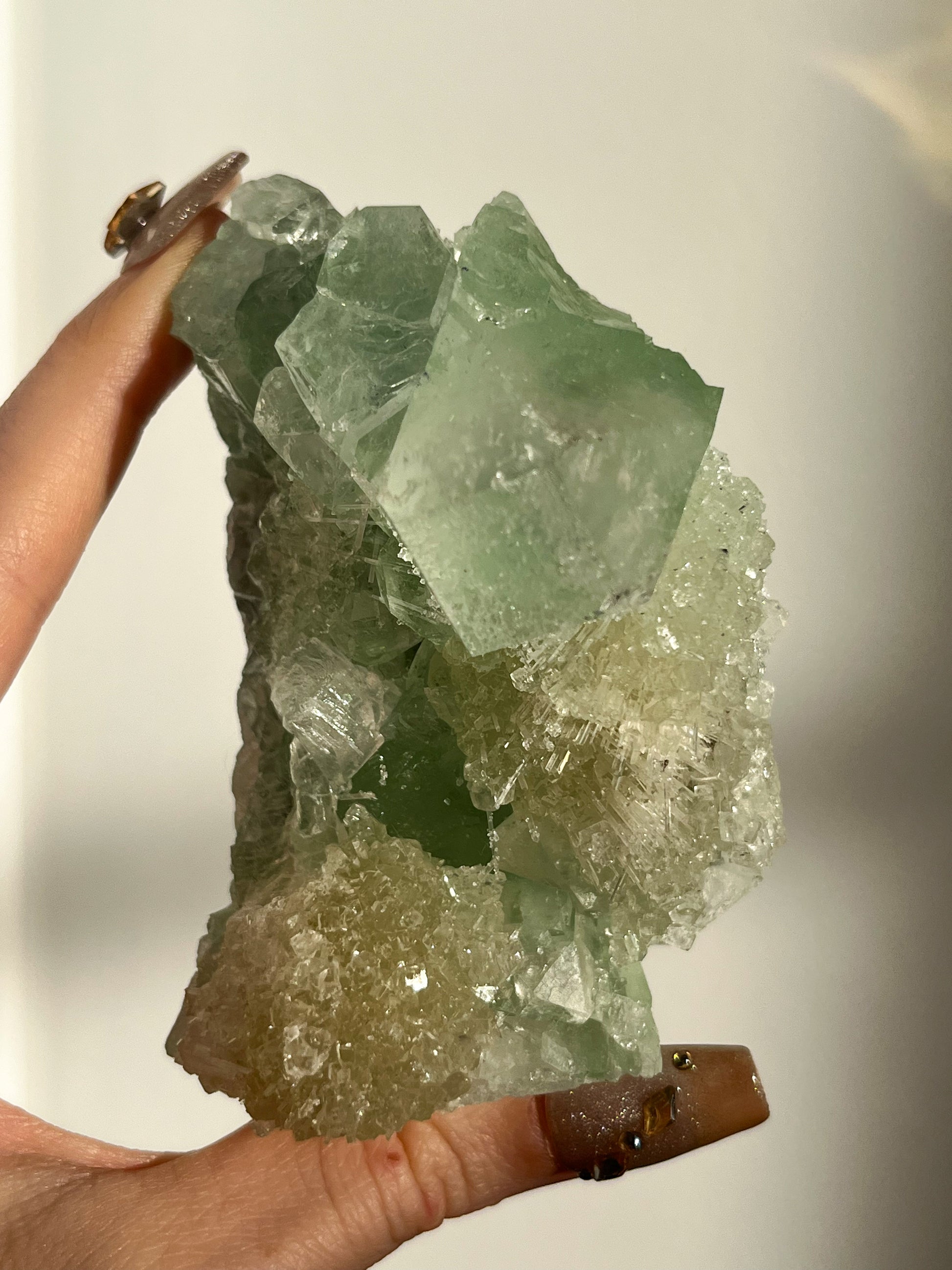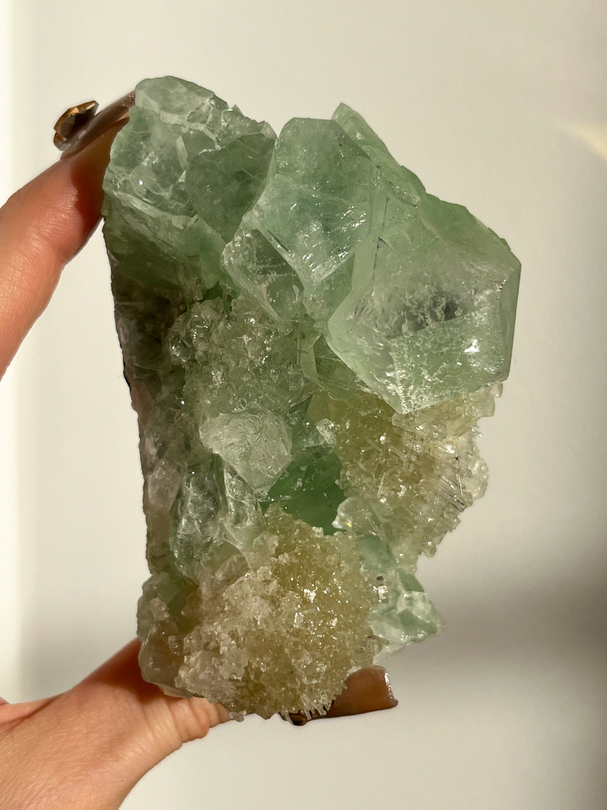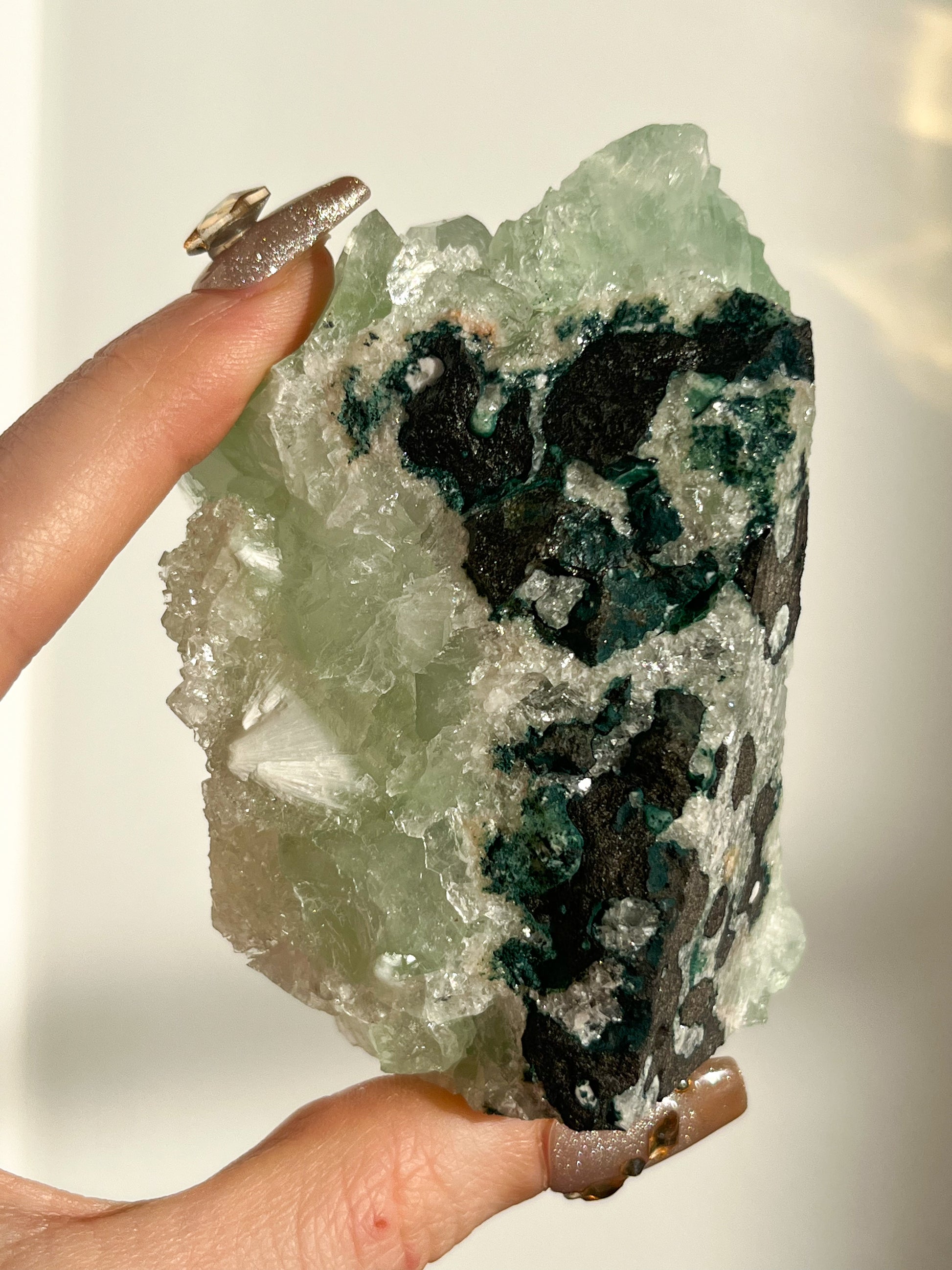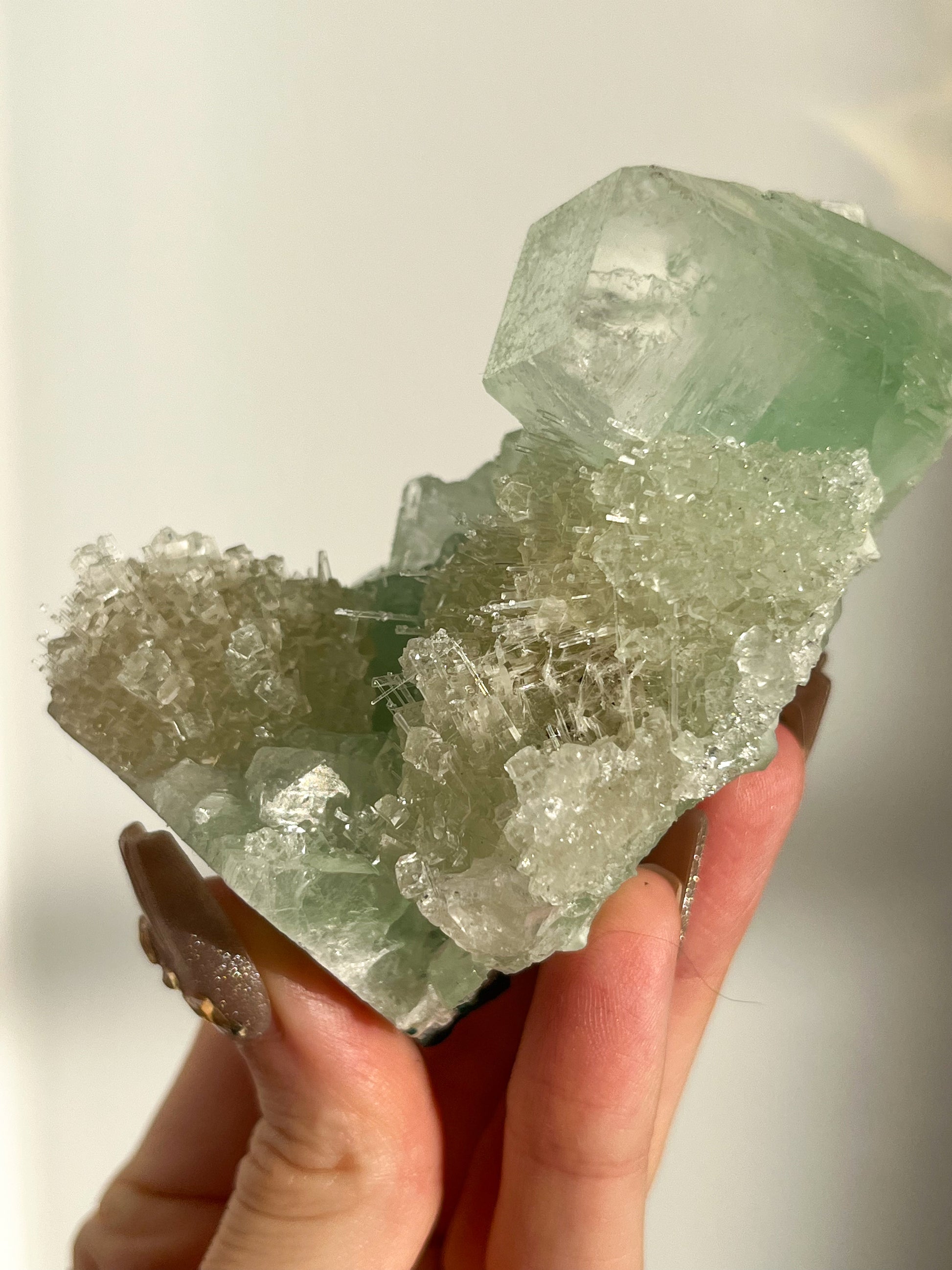 This find of Green Apophyllite, Thomsonite, Mesolite & Calcite specimens are a recent find in 2024 from the Apophyllite mines of India. This latest mineral discovery is from only one find. Making this desirable crystal combination not only rare, but a very exciting one.