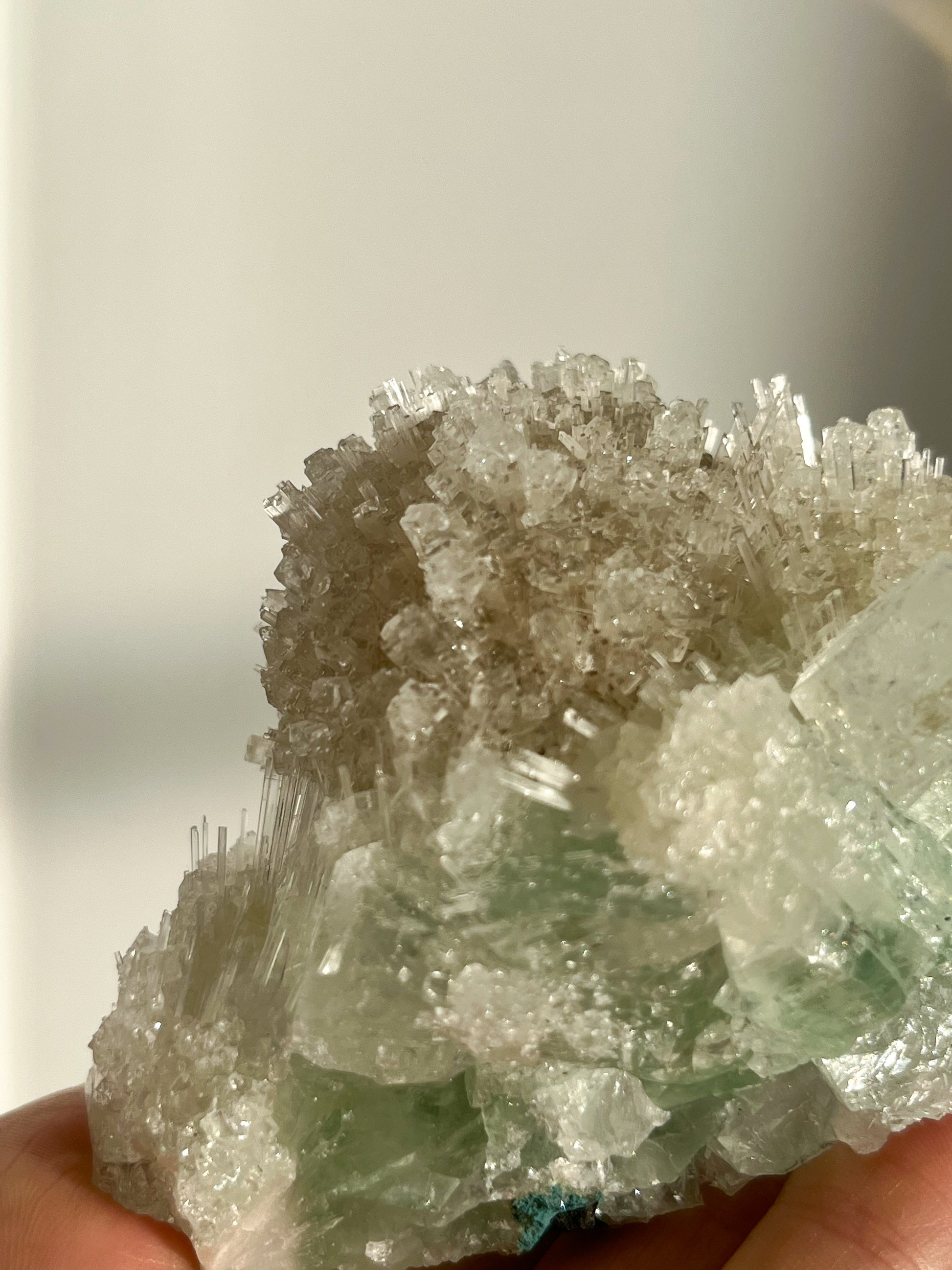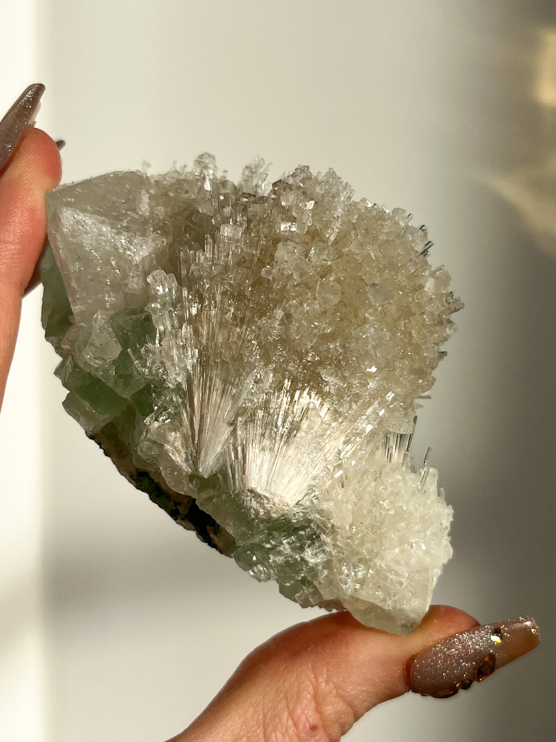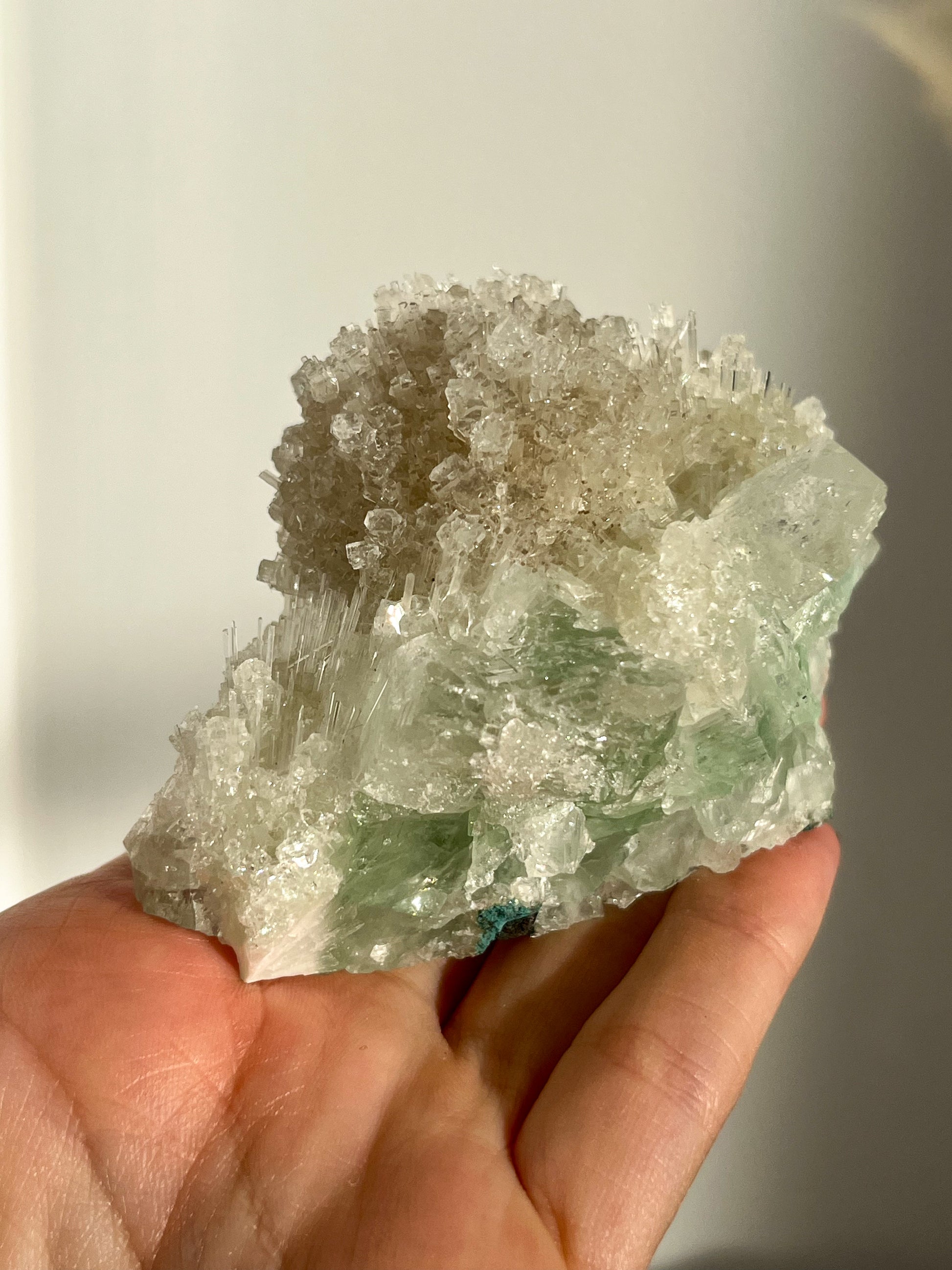 This find of Green Apophyllite, Thomsonite, Mesolite & Calcite specimens are a recent find in 2024 from the Apophyllite mines of India. This latest mineral discovery is from only one find. Making this desirable crystal combination not only rare, but a very exciting one.