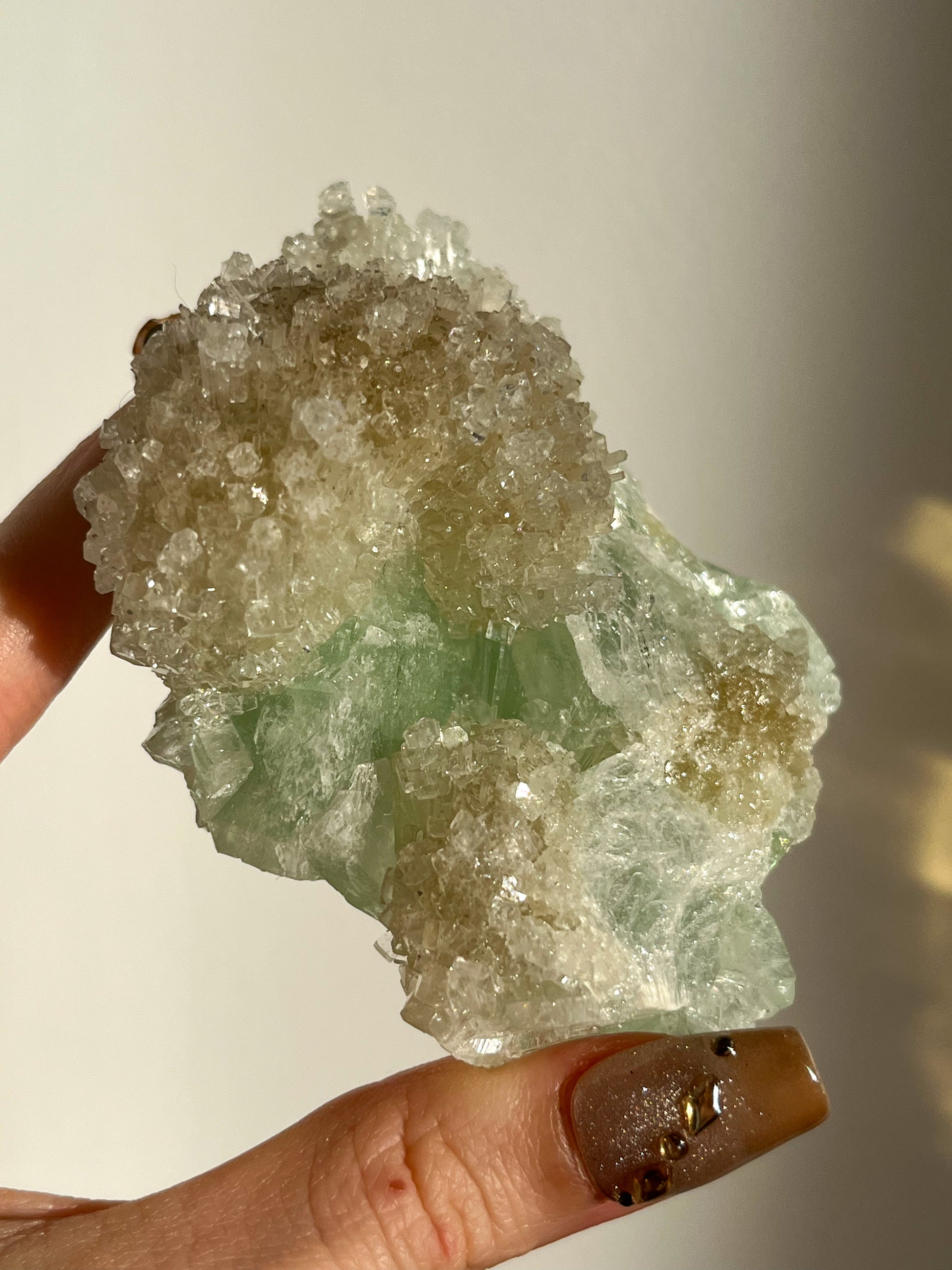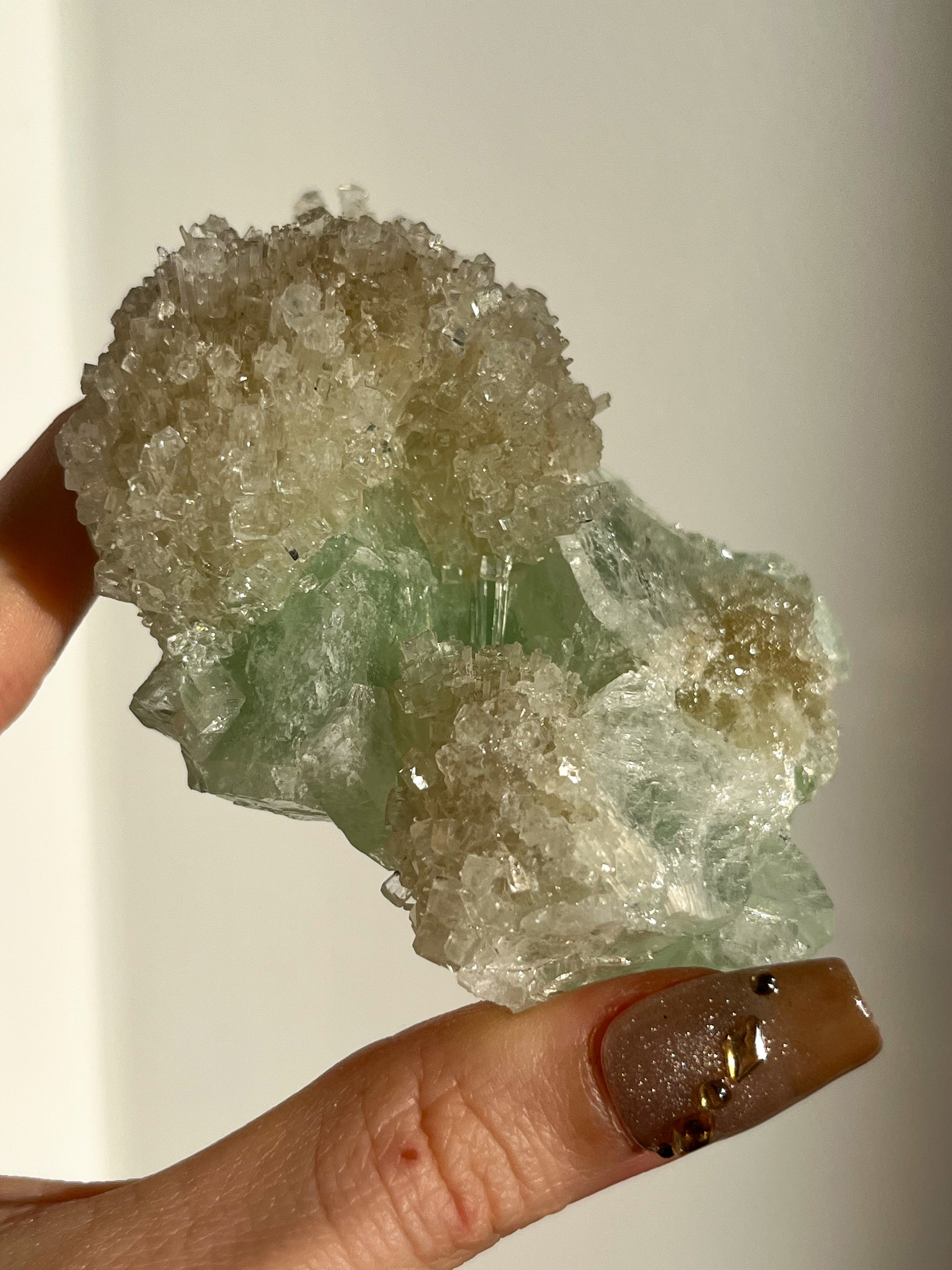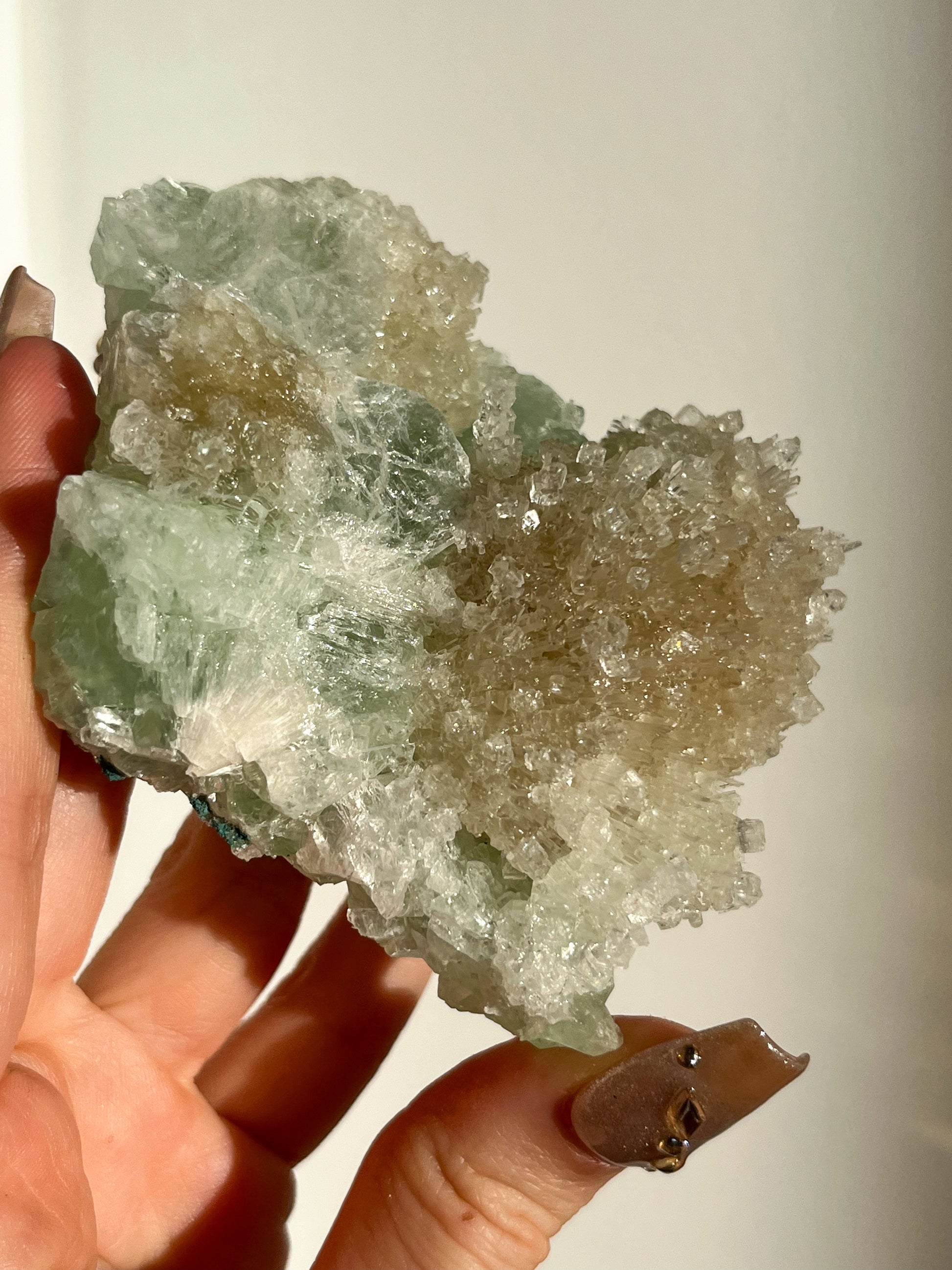 This find of Green Apophyllite, Thomsonite, Mesolite & Calcite specimens are a recent find in 2024 from the Apophyllite mines of India. This latest mineral discovery is from only one find. Making this desirable crystal combination not only rare, but a very exciting one.