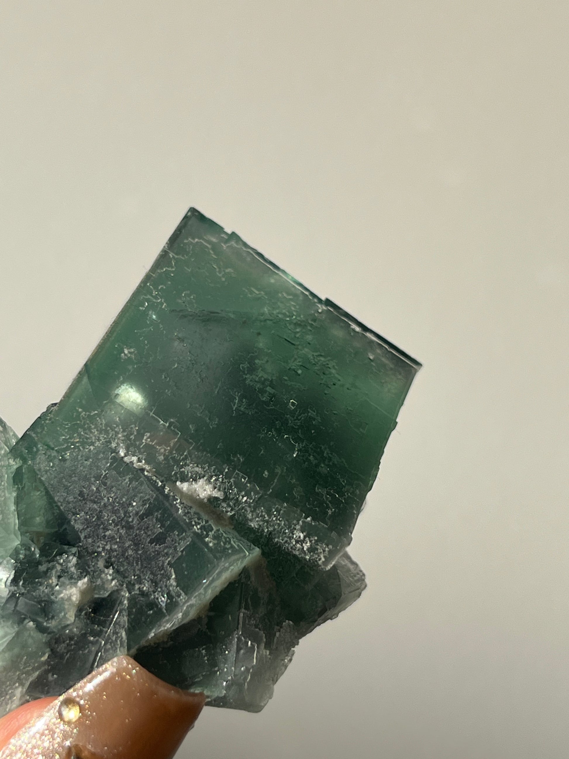 Distinct dark green phantom edges trace earlier stages of crystal growth within well formed and flawless cubic fluorite.
