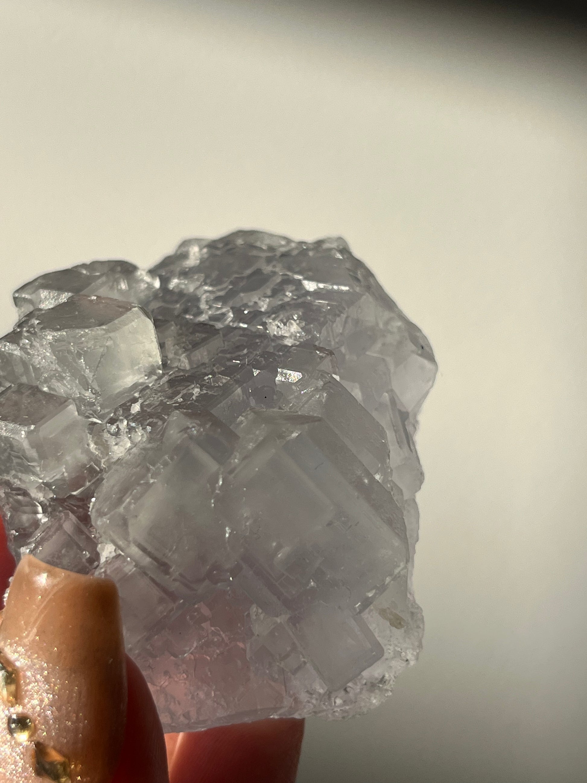 Intercalated cubic fluorite cubes are adorned with pale white phantom veils and druzy quartz coating concentrated on one side. Allowing for variety in mineral presentation and enhanced visual aesthetics.