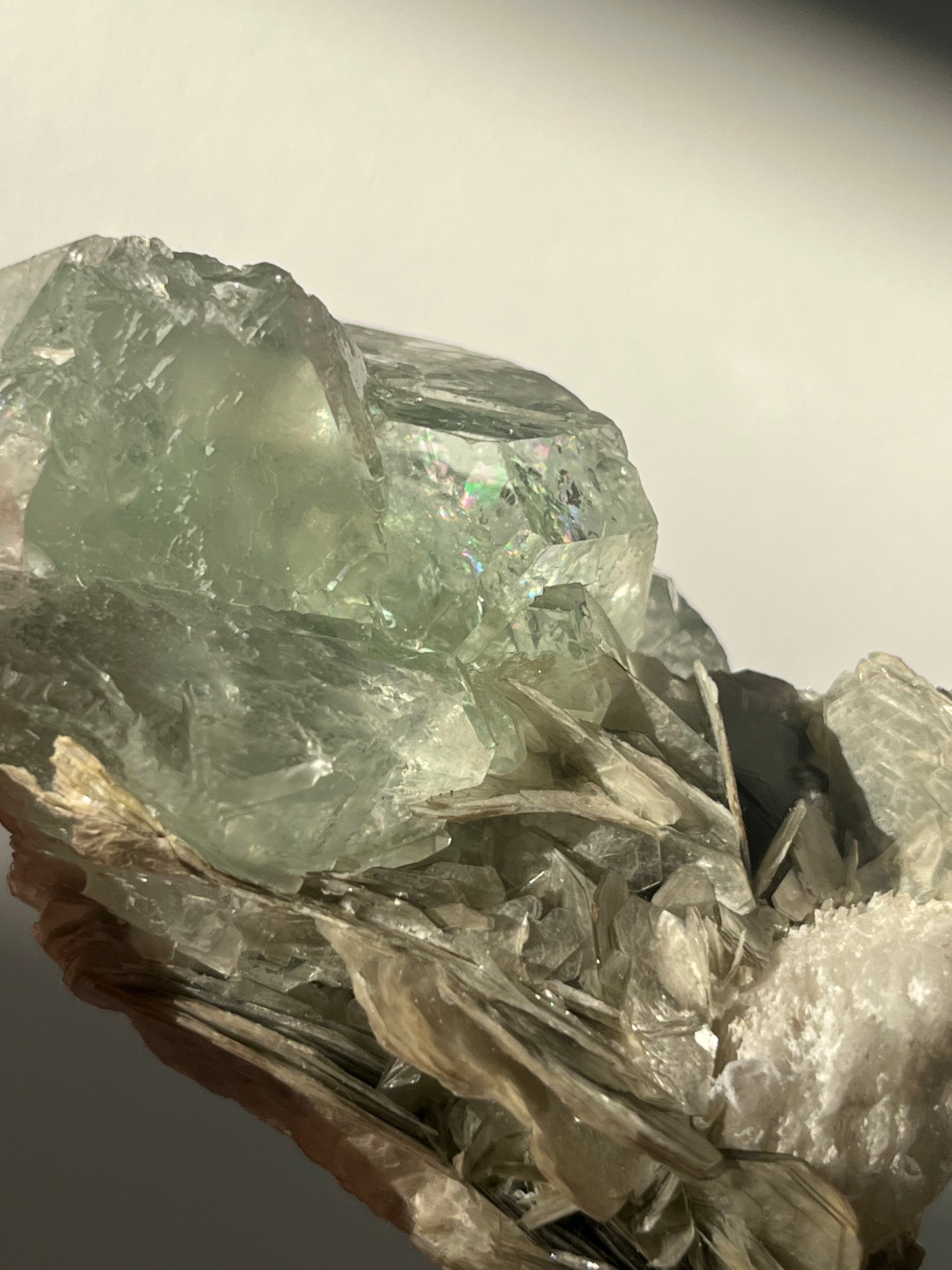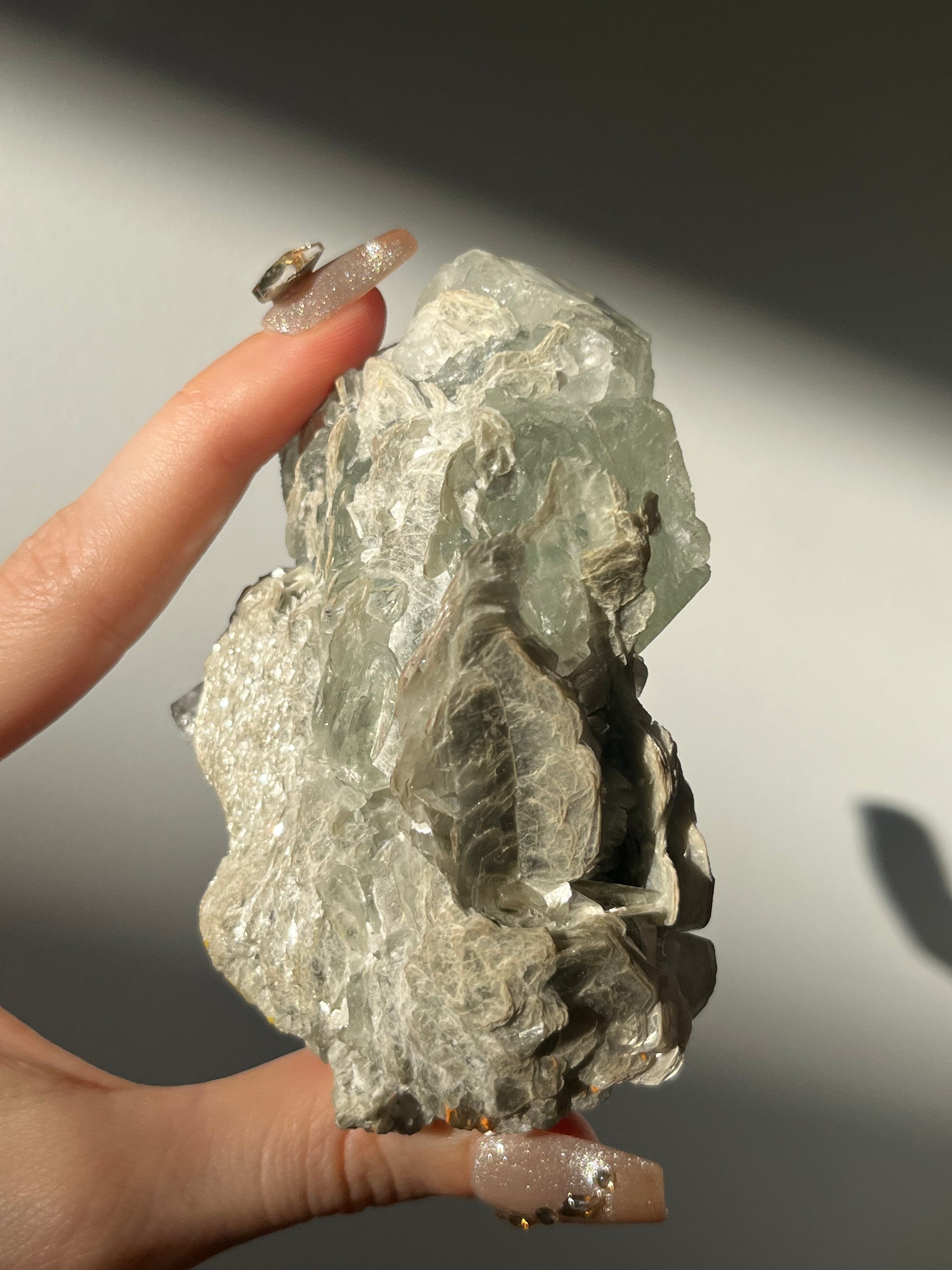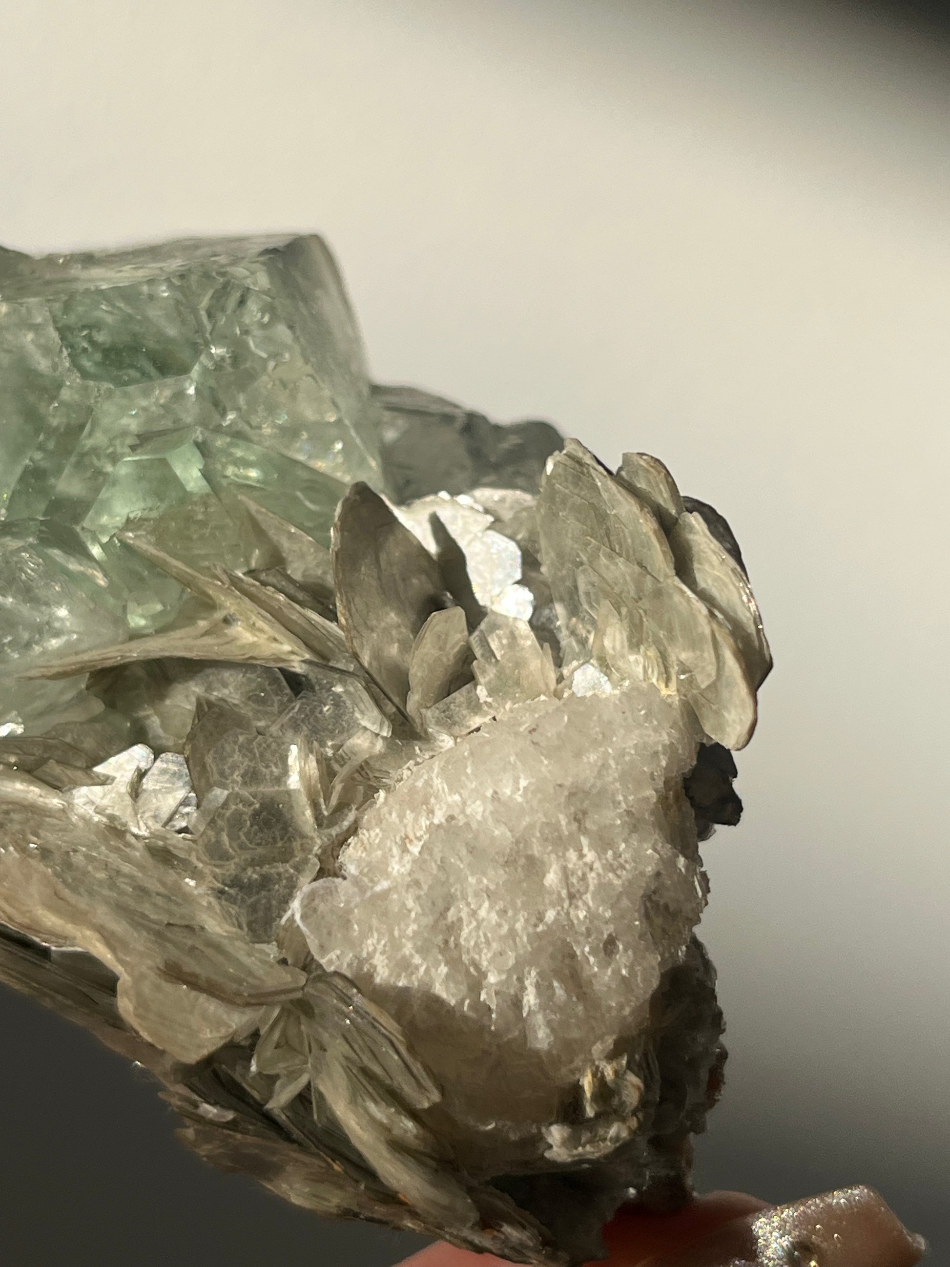 Green Fluorite with Silver Muscovite & Albite Meaning