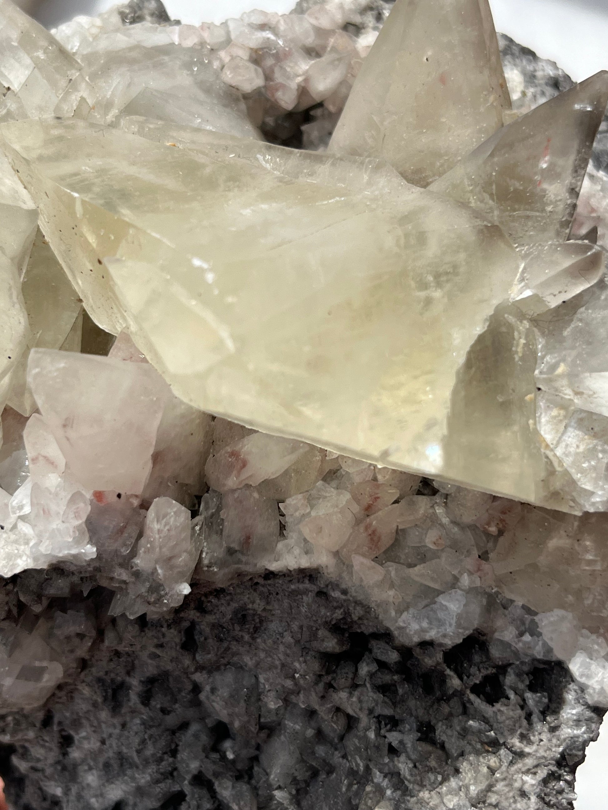 Large exceptionally formed double terminated “Tiger Tooth” Calcites sit in a deep grey matrix. Hematite rich mineral inclusions mark their presence on the calcites in grey and light pink hues which can be observed on the front of the specimen.