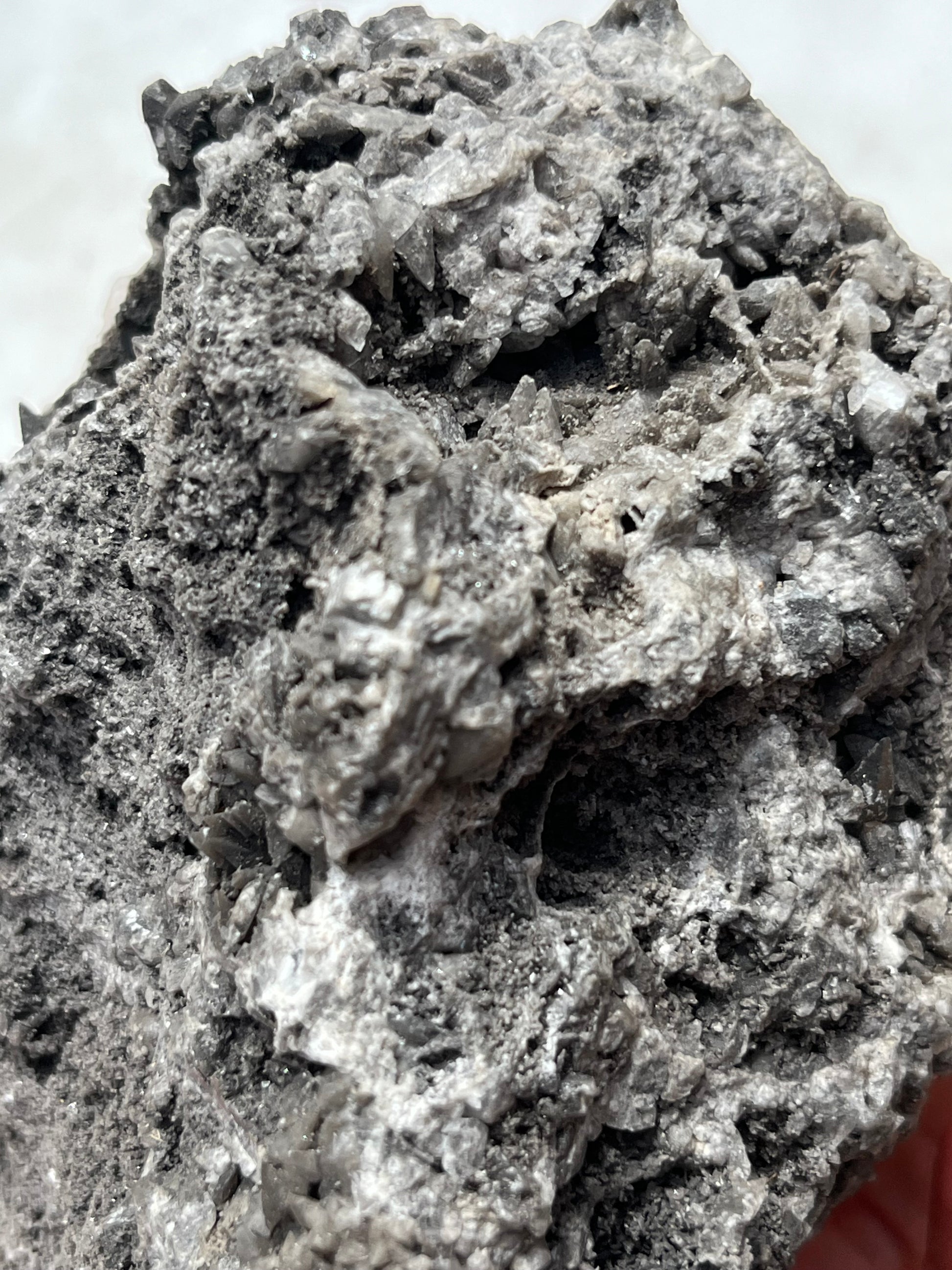 Miniature grey hematite coated Calcite crystals mark the surface of the posterior aspect.