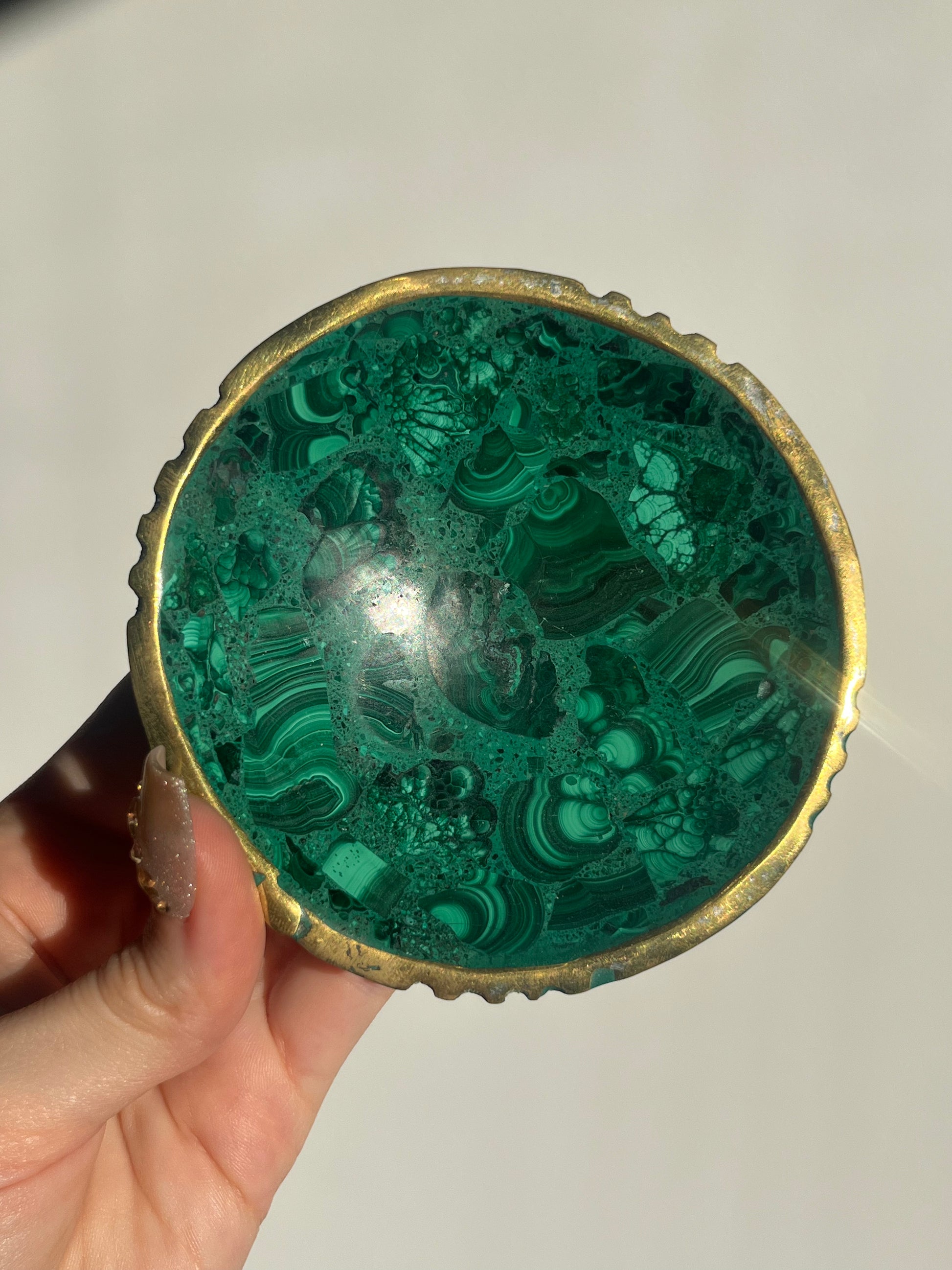 This is a conglomerate Malachite bowl that contains carved and granular Malachite crystals.