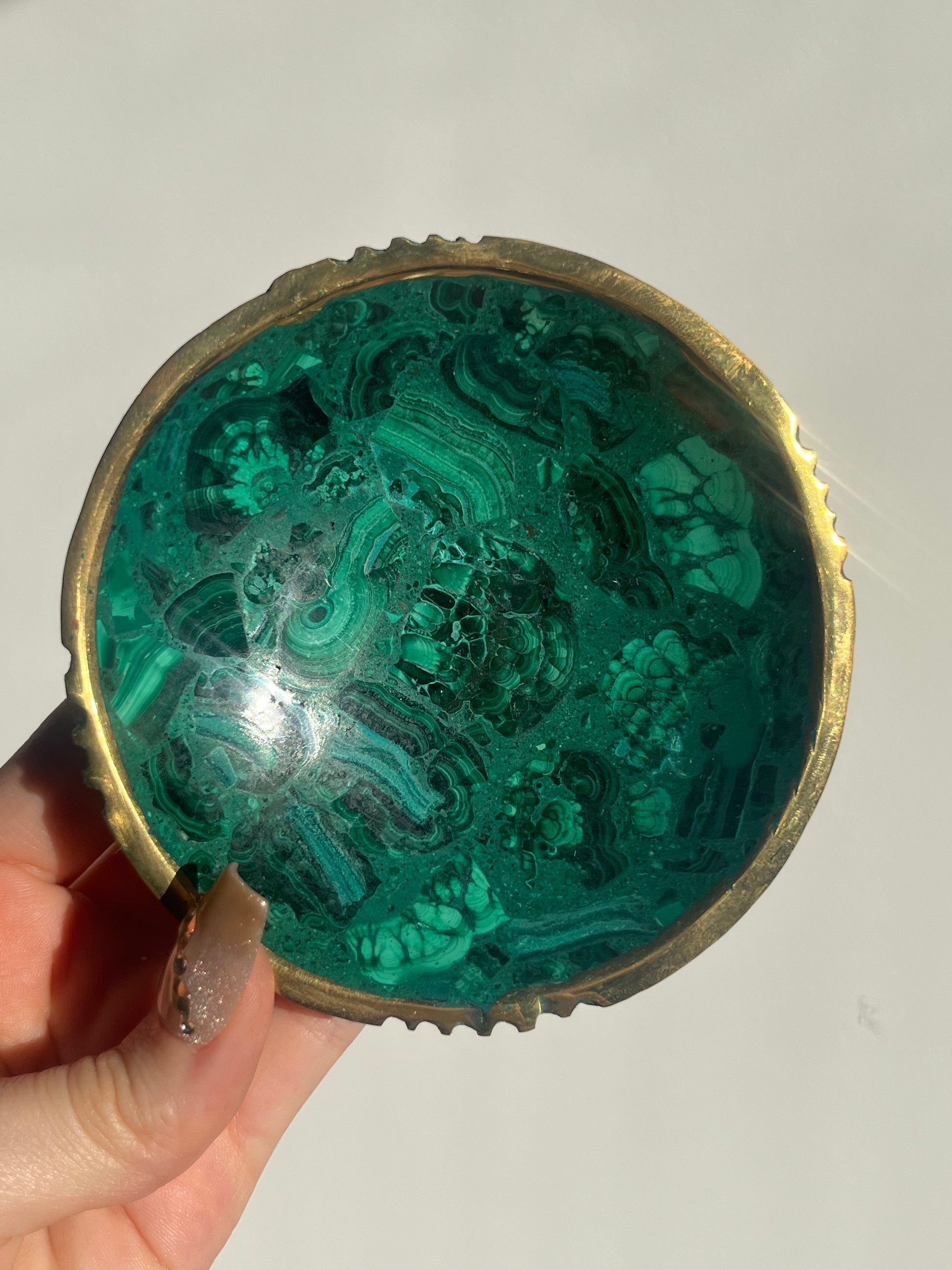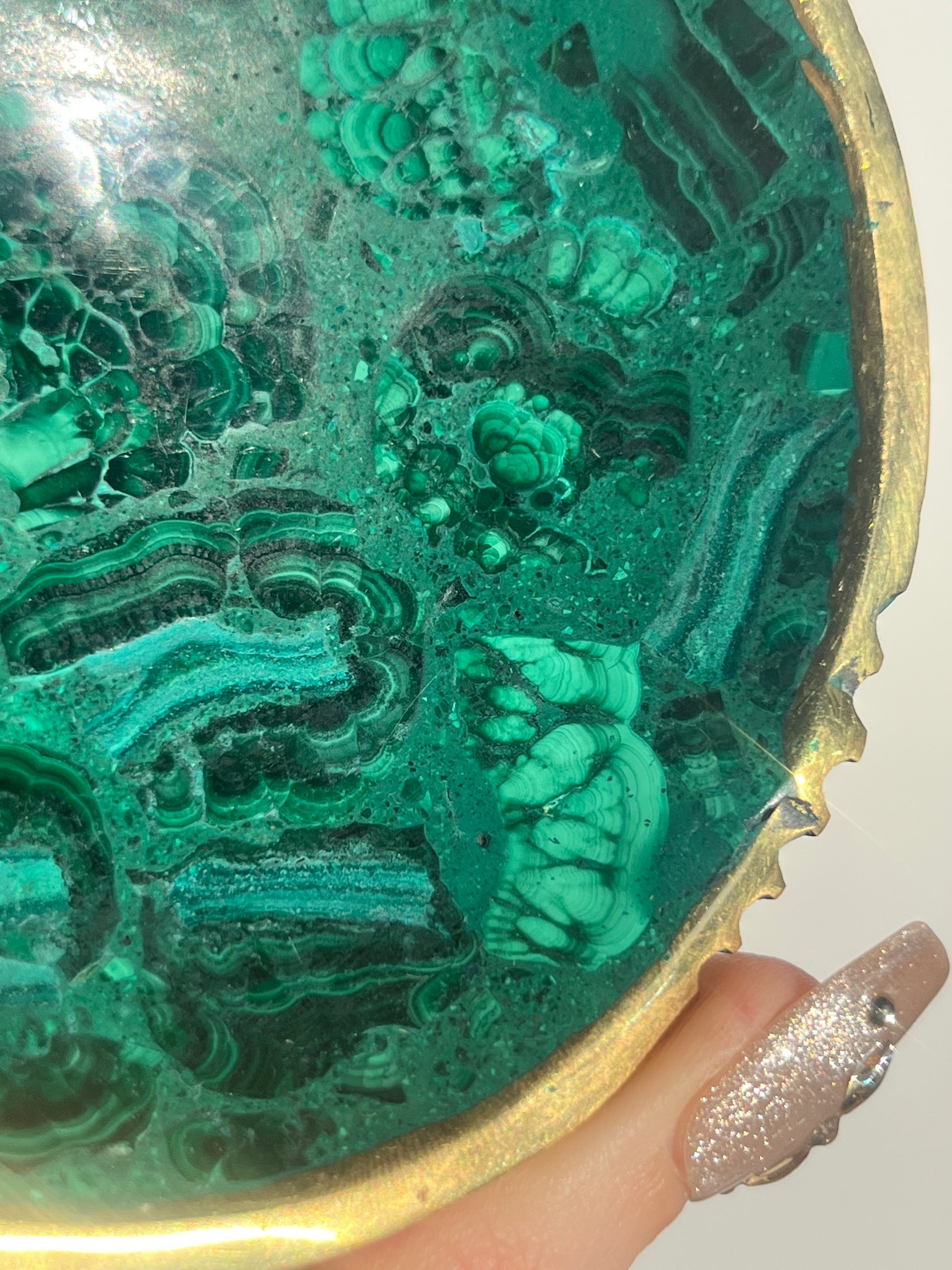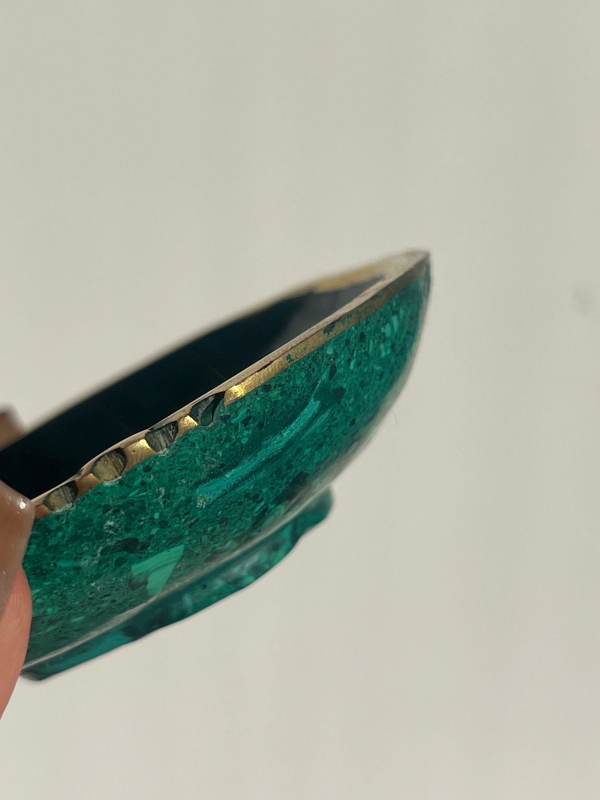 This is a conglomerate Malachite bowl that contains carved and granular Malachite crystals.