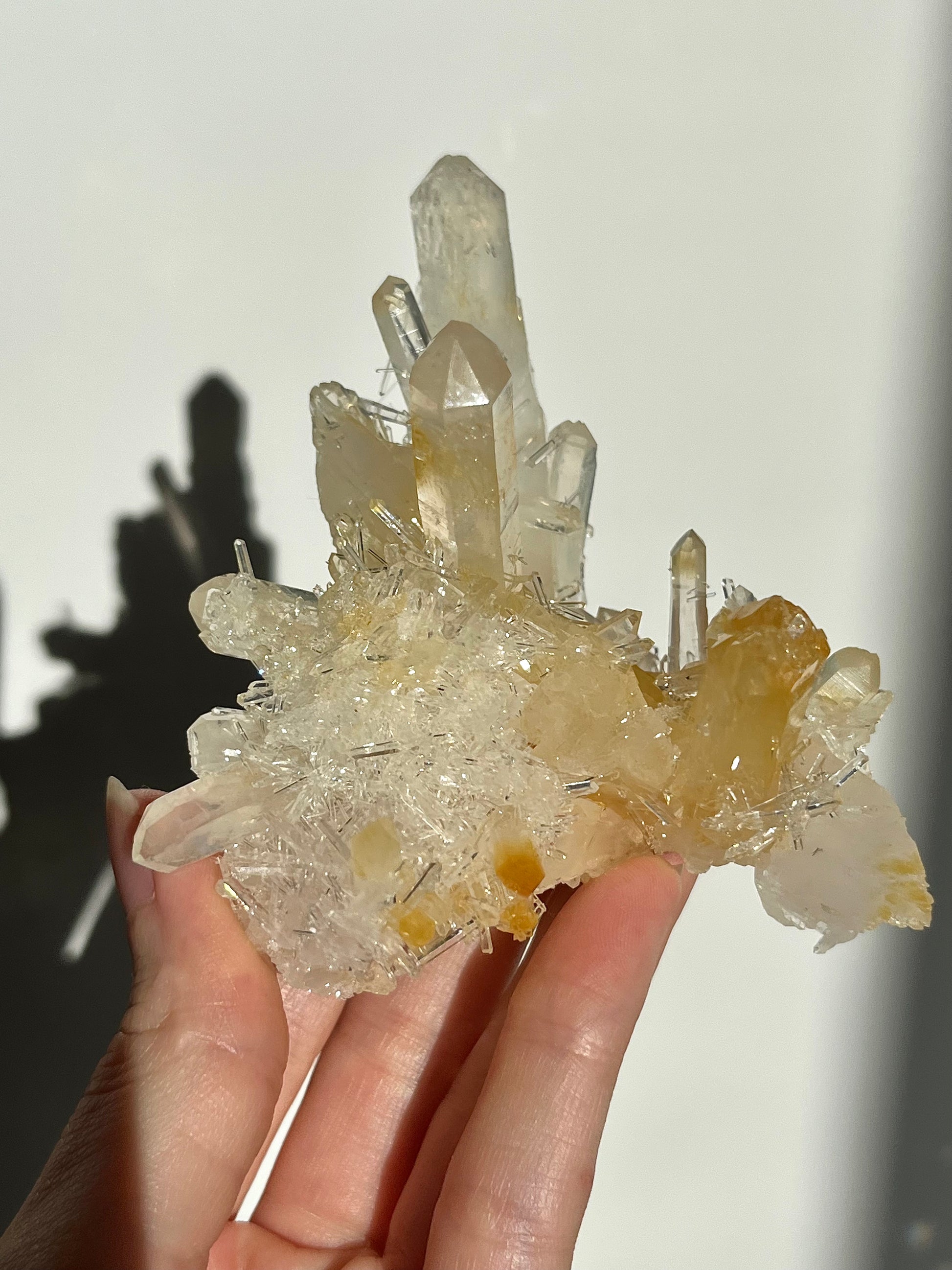 El cuarzo mango es una forma rara de cuarzo que solo se encuentra en Colombia cuyo color amarillo anaranjado lo imparte el compuesto halloysita.