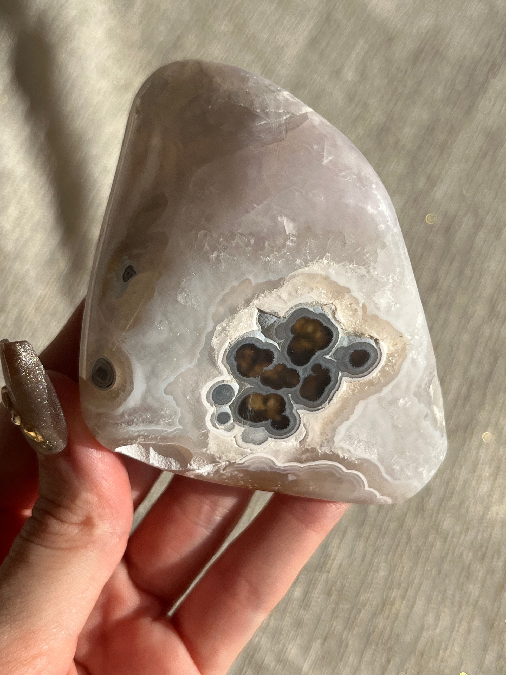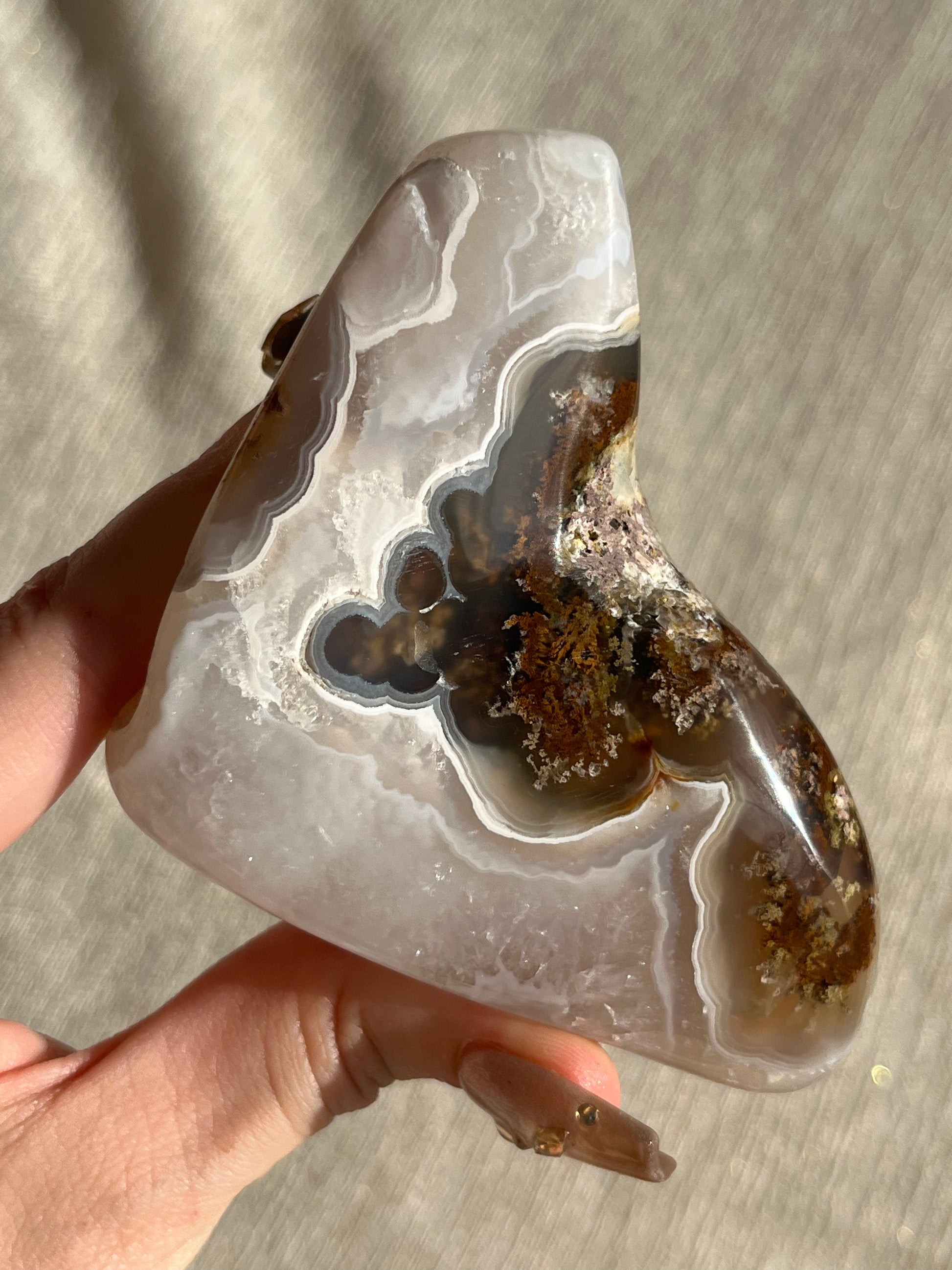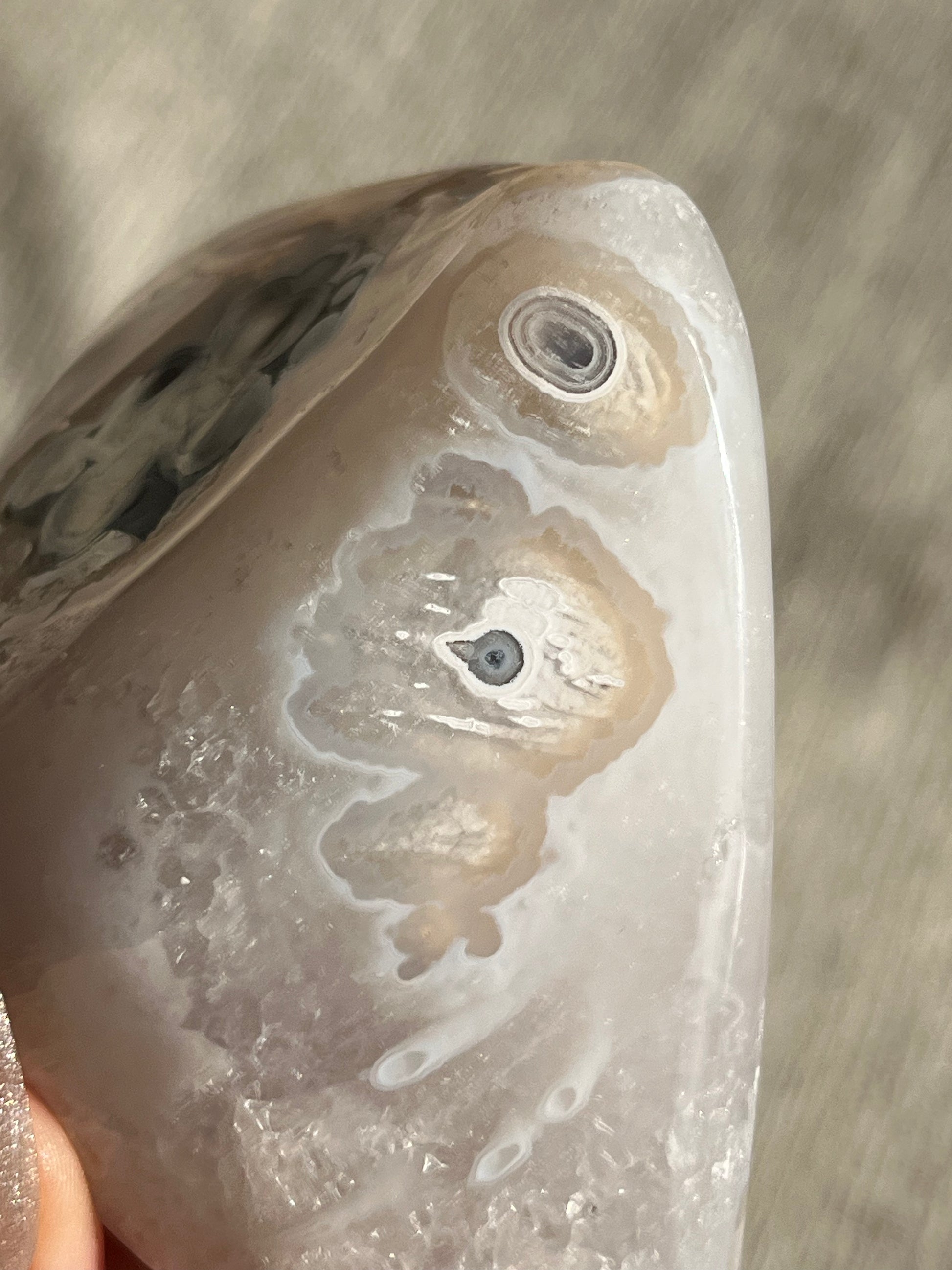 Nebula Agate is a new find from Indonesia first named by the founders of Priestess Crystals. With enchanting orbicular agate rings that pierce through a translucent chalcedony. Depending on how the stone is carved, multicoloured moss & dendritic inclusions can be present.