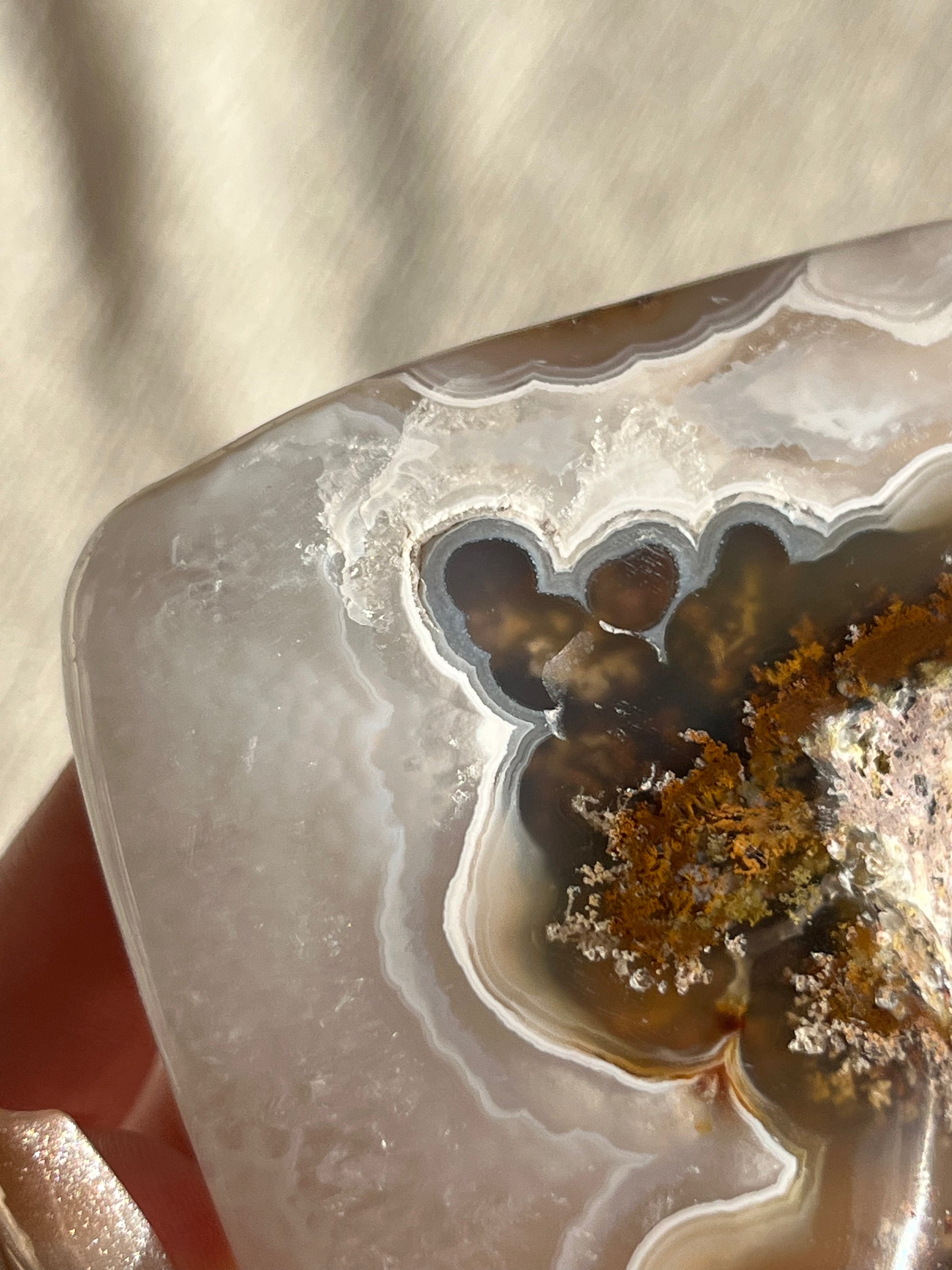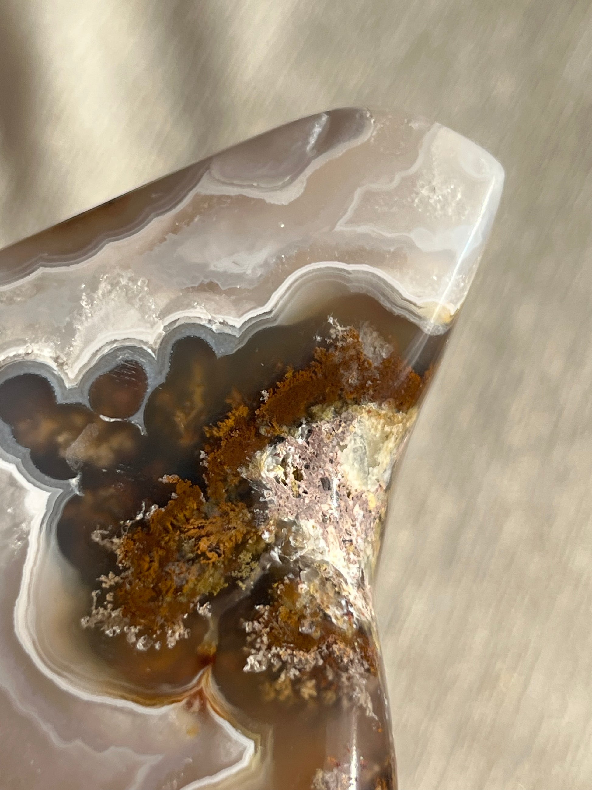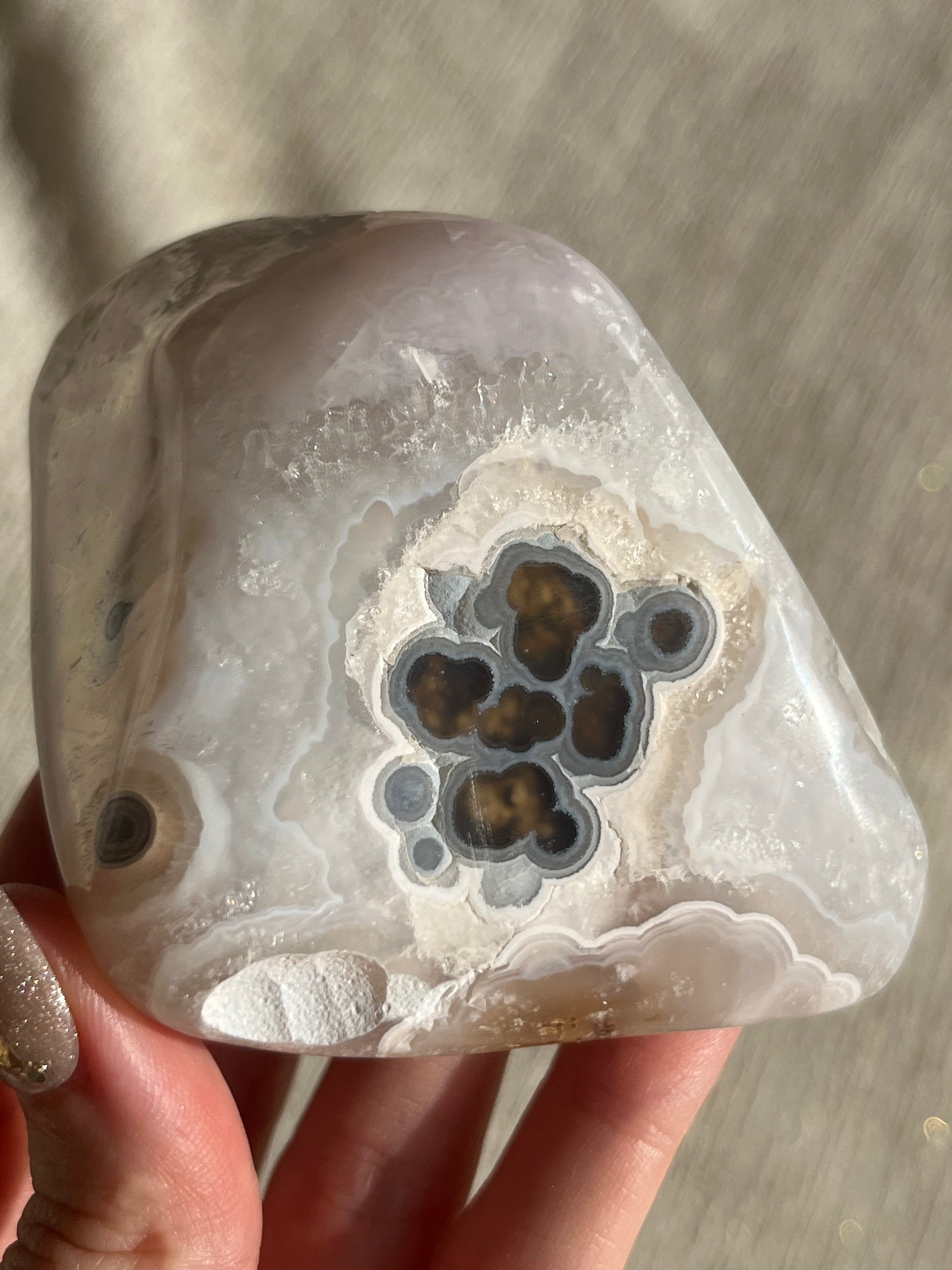 Nebula Agate is a new find from Indonesia first named by the founders of Priestess Crystals. With enchanting orbicular agate rings that pierce through a translucent chalcedony. Depending on how the stone is carved, multicoloured moss & dendritic inclusions can be present.