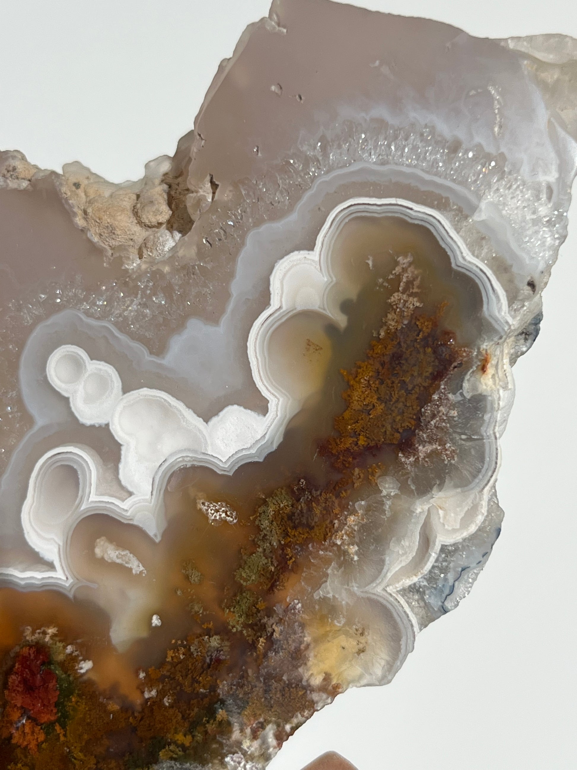 Nebula Agate is a new find from Indonesia first named by the founders of Priestess Crystals. With enchanting orbicular agate rings that pierce through a translucent chalcedony. Depending on how the stone is carved, multicoloured moss & dendritic inclusions can be present.