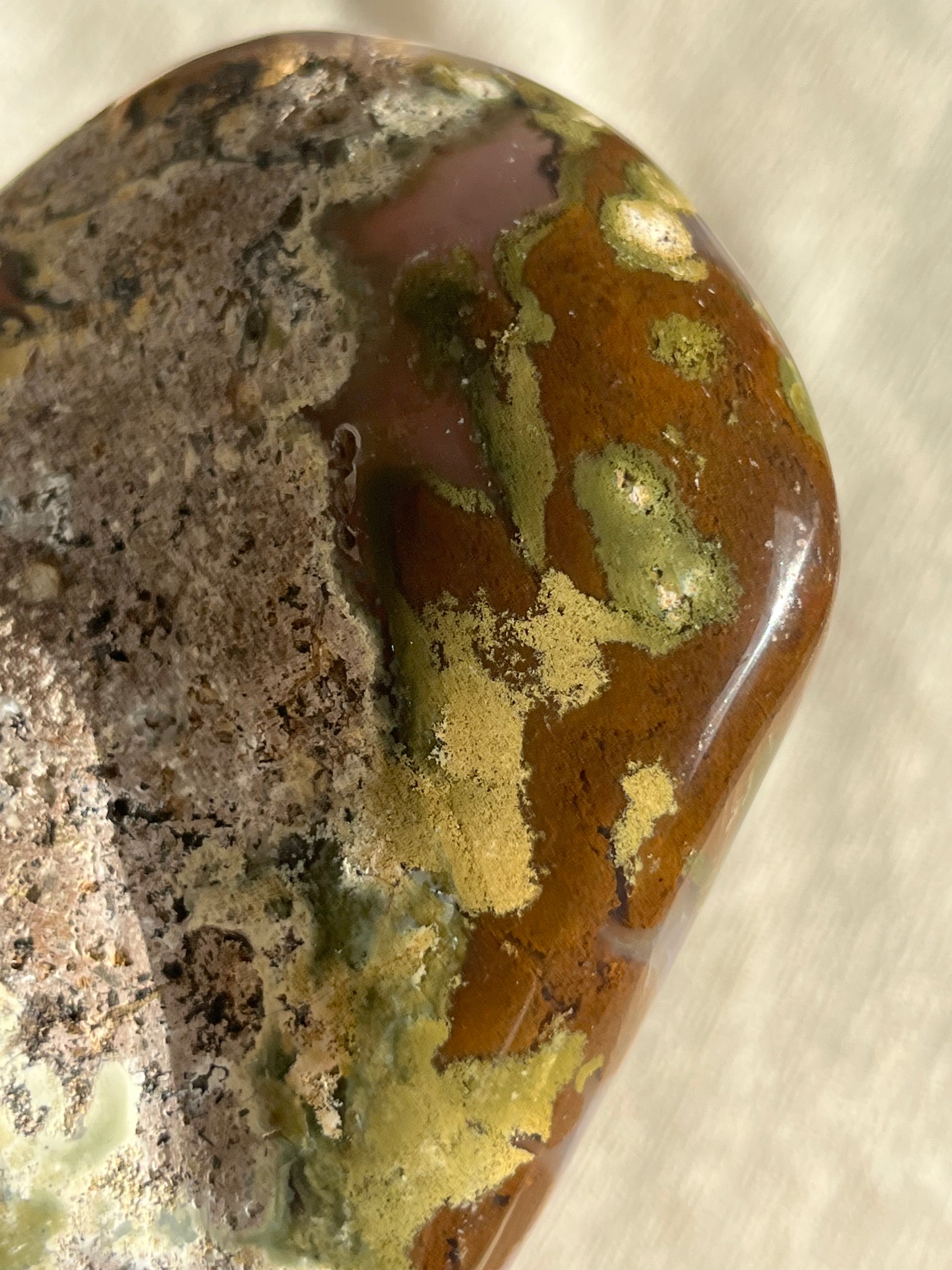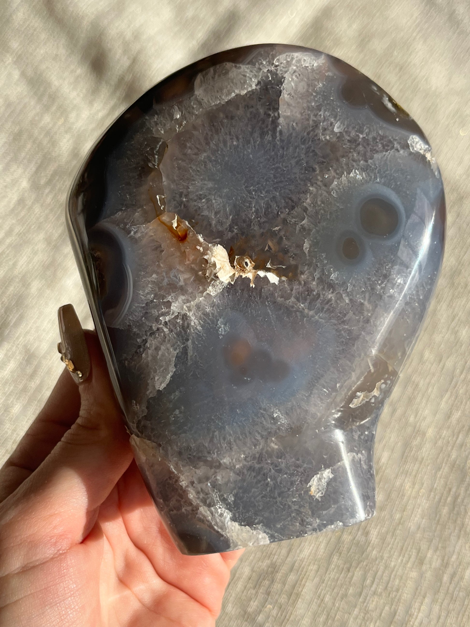 Nebula Agate is a new find from Indonesia first named by the founders of Priestess Crystals. With enchanting orbicular agate rings that pierce through a translucent chalcedony. Depending on how the stone is carved, multicoloured moss & dendritic inclusions can be present.