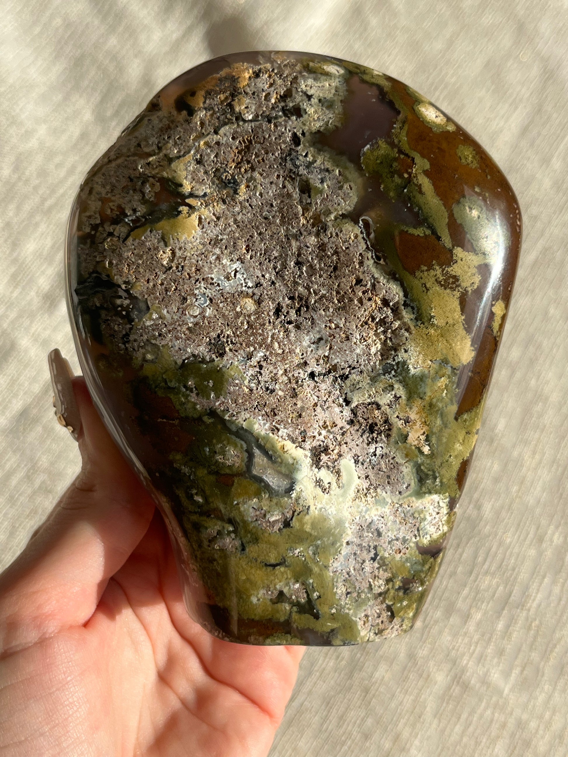 Nebula Agate, Blue Chalcedony and Scenic Moss Standing Freeform J