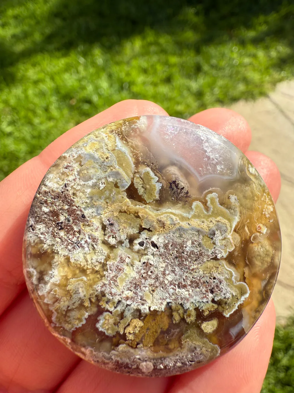 Nebula Agate is a new find from Indonesia first named by the founders of Priestess Crystals. With enchanting orbicular agate rings that pierce through a translucent chalcedony. Depending on how the stone is carved, multicoloured moss & dendritic inclusions can be present.