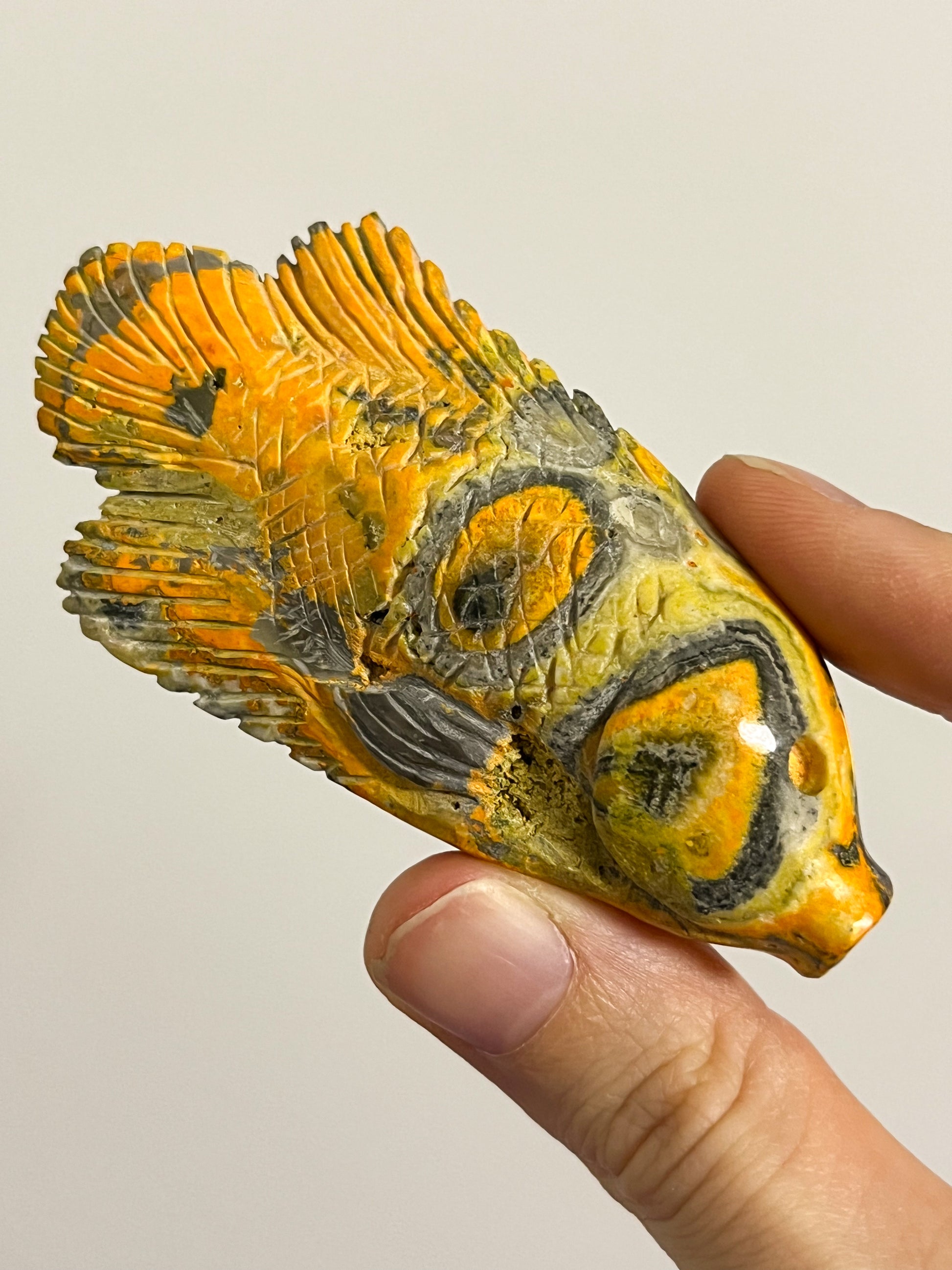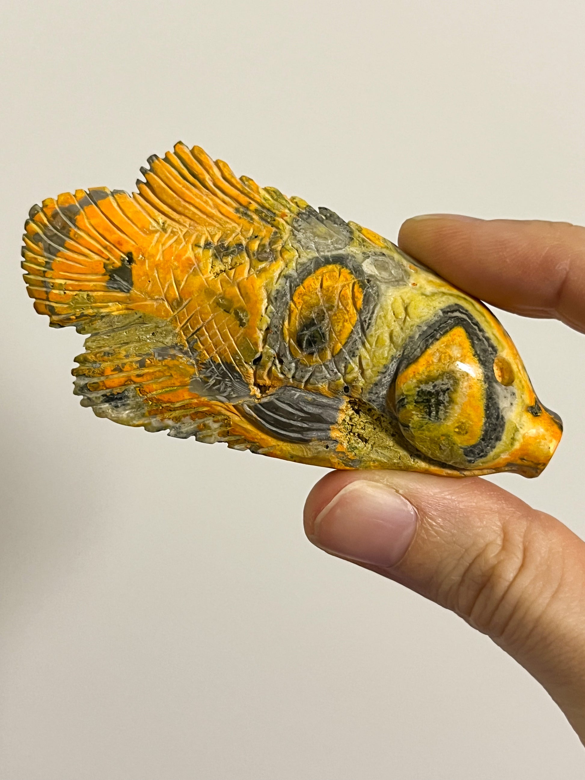 ‘Bee-trice’ Old Stock Orbicular Bumblebee Jasper Fish Carving (Self-standing)
