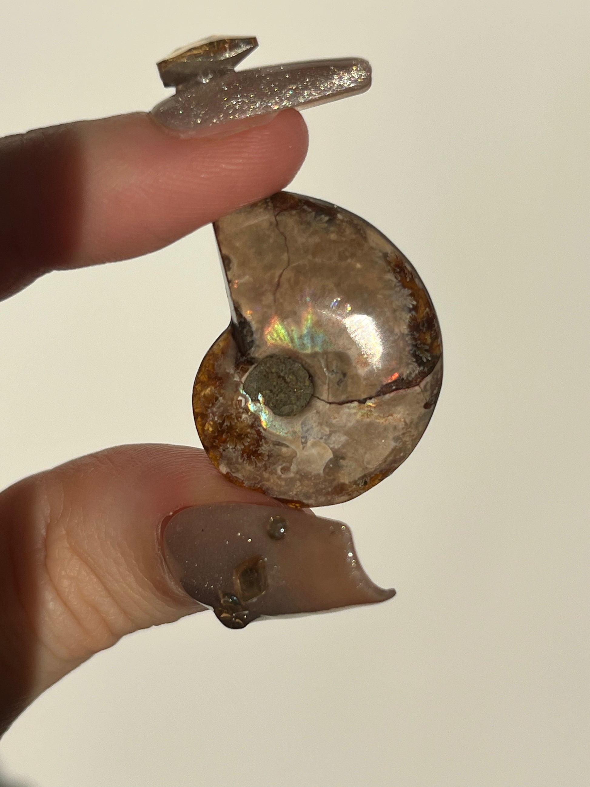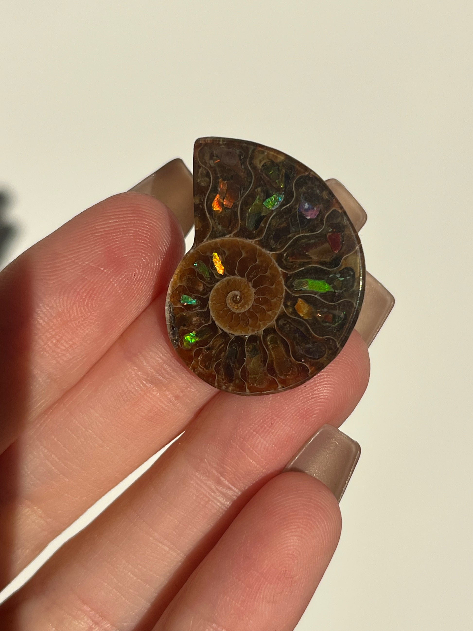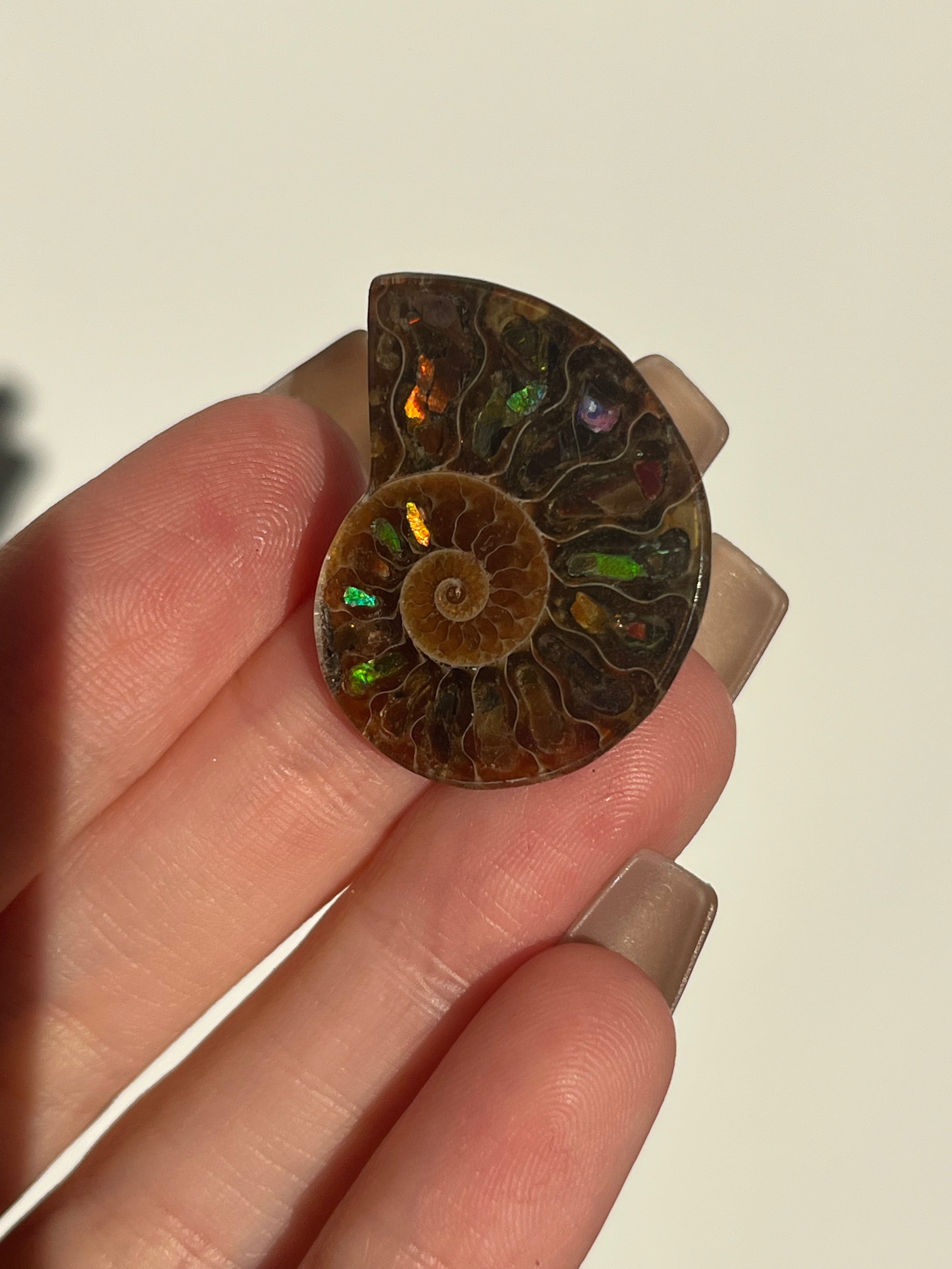 Ammonites are fossils of sea living organisms that lived approximately 120-150 million years ago in the Jurassic period. Over time, the organic matter is replaced by minerals such as calcite and pyrite. Sometimes, the outer shell becomes opalised.