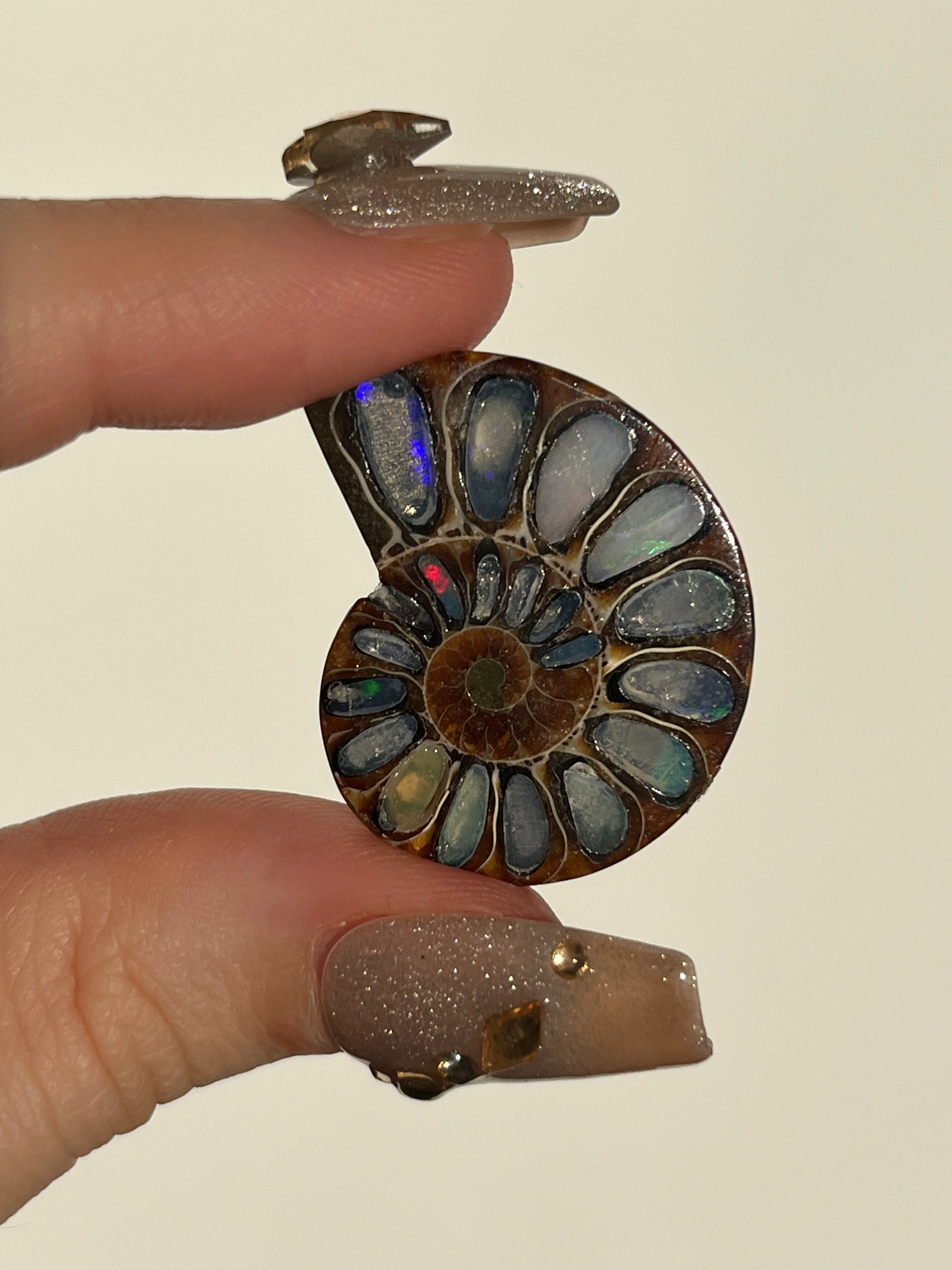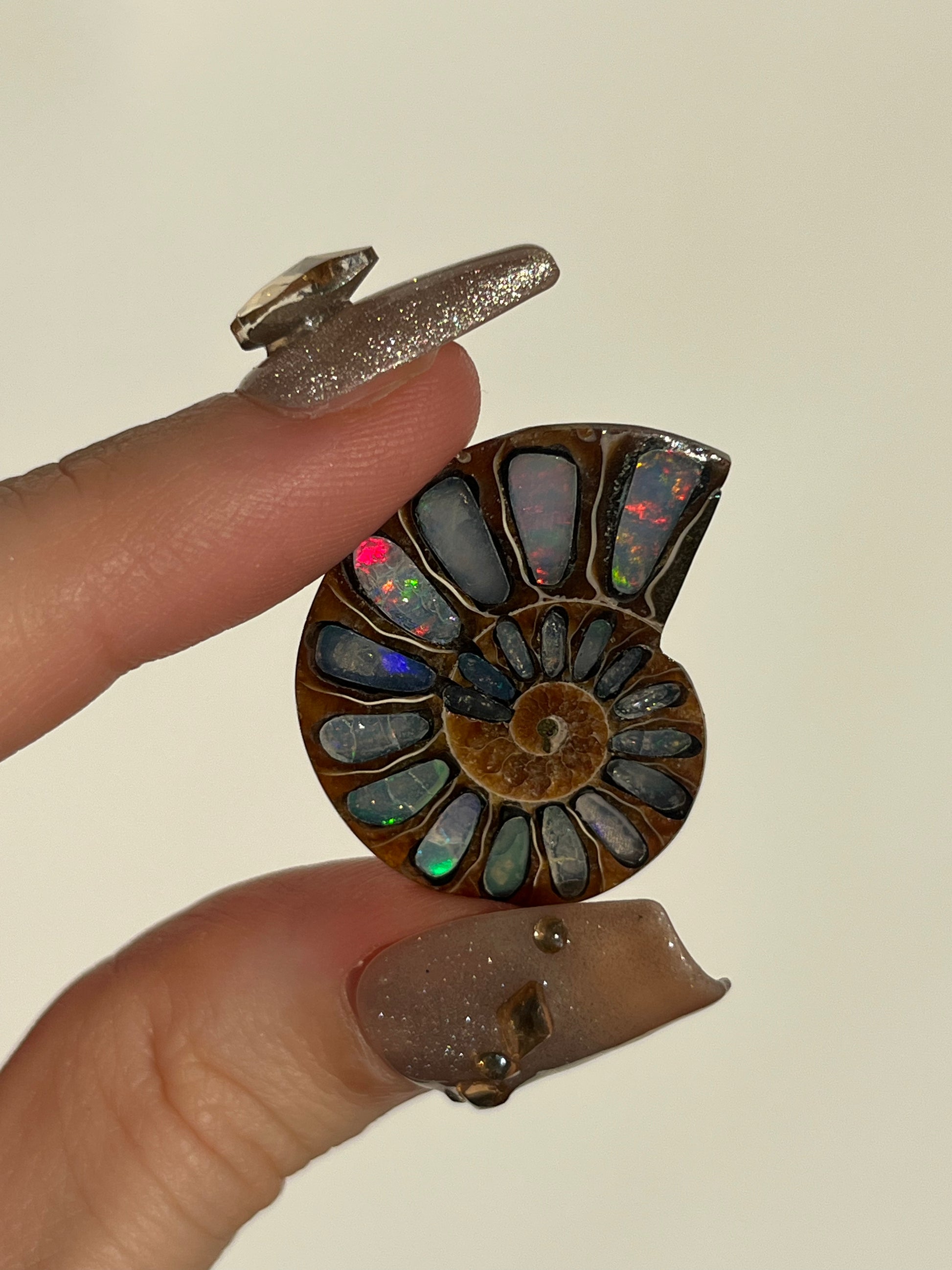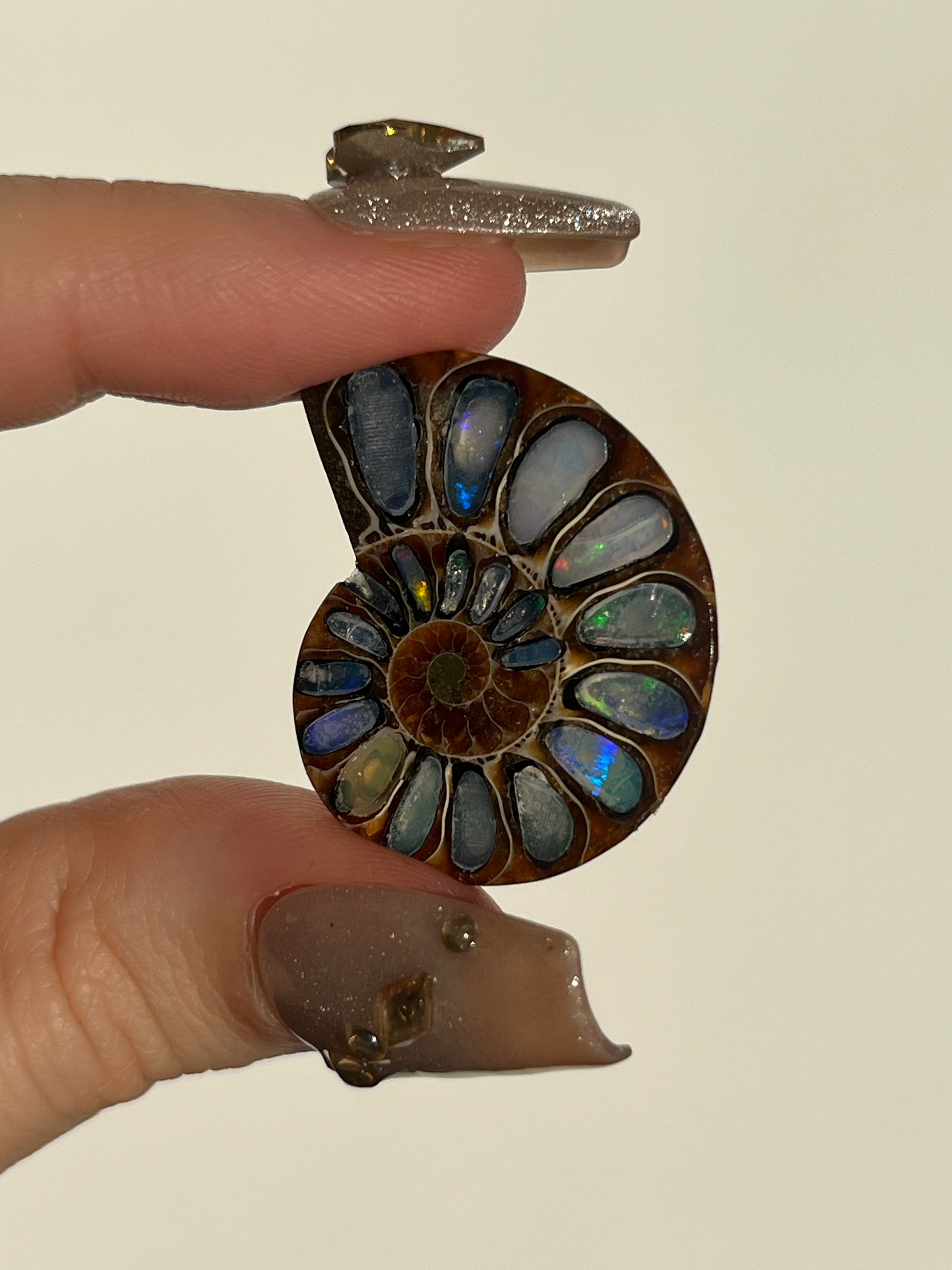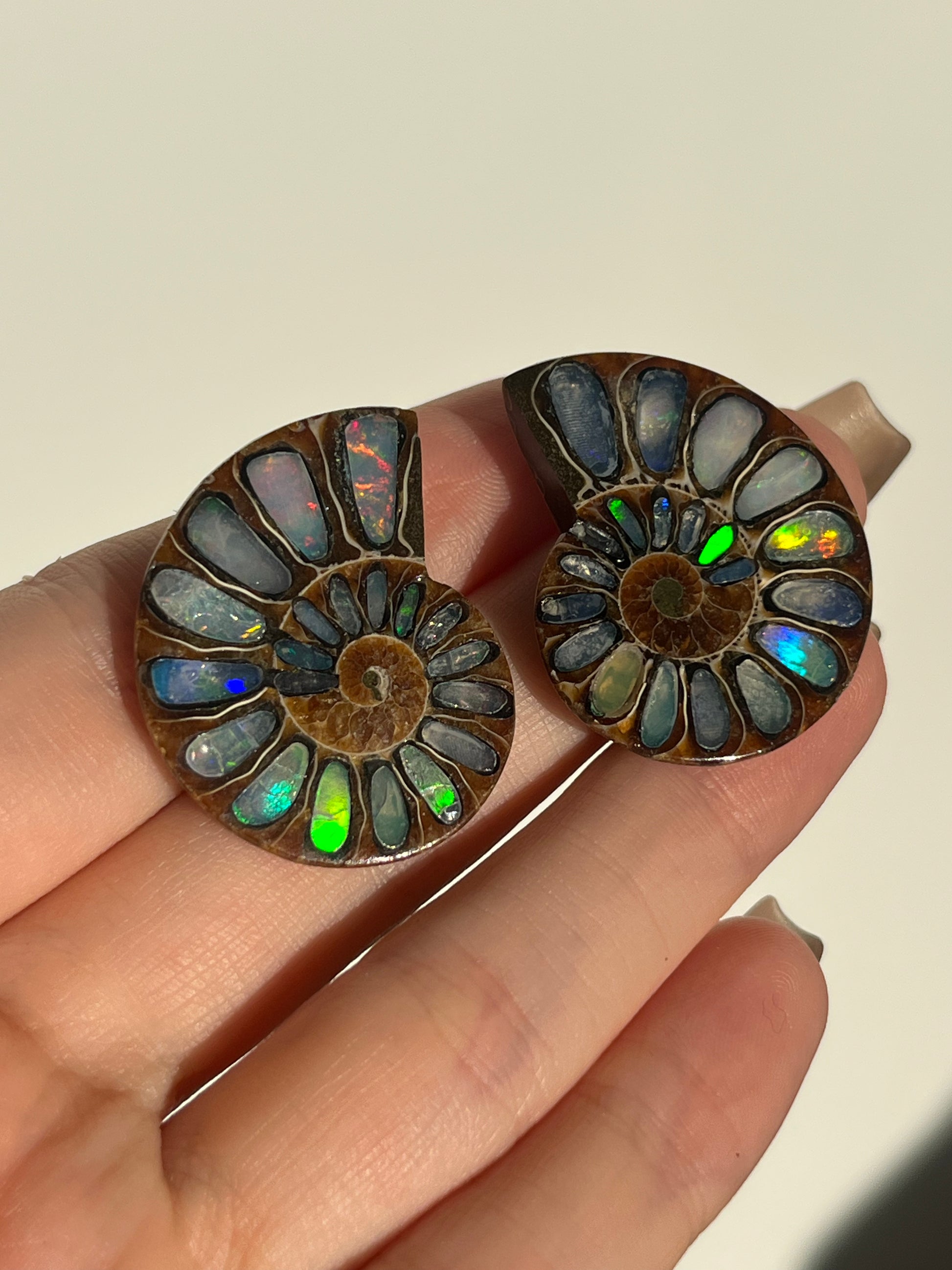 This Ammonite fossil pair has been intricately designed and custom made with opal inlay.