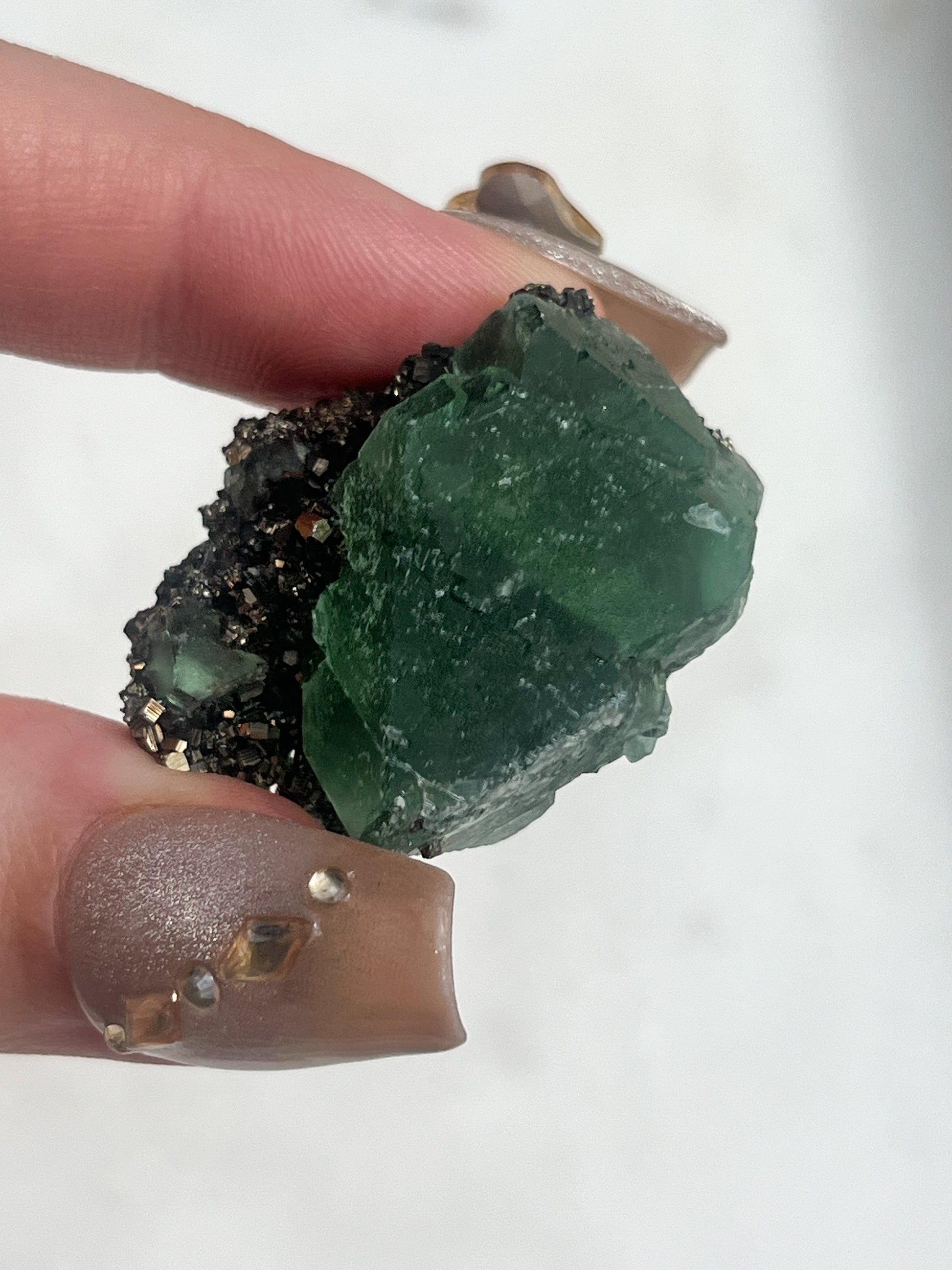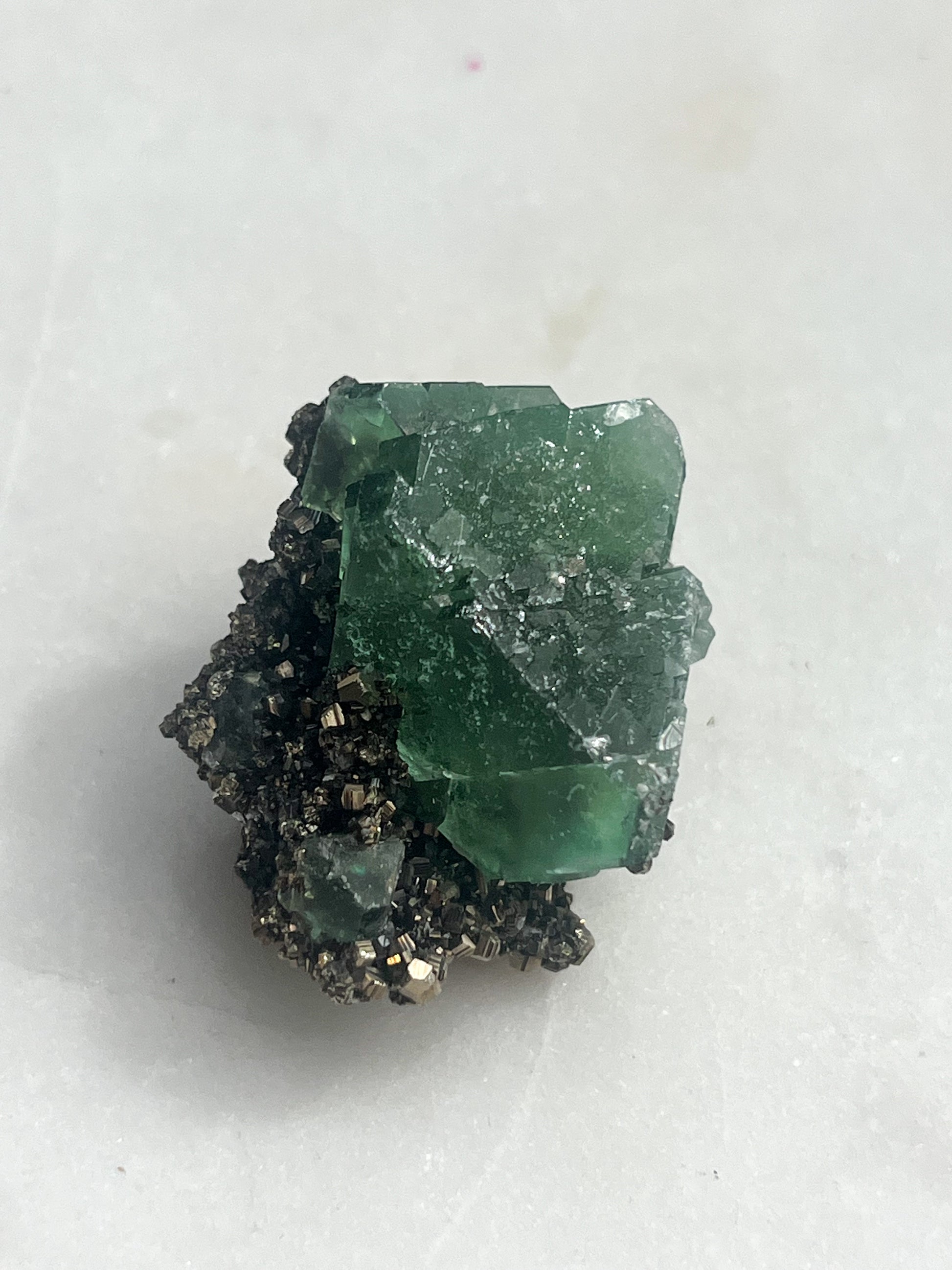 An attractive form of emerald-green coloured fluorite with predominantly octahedral surfaces. Mineral inclusions that can be found alongside this classic fluorite and pyrite combination include sphalerite, jordanite, and geocronite.
