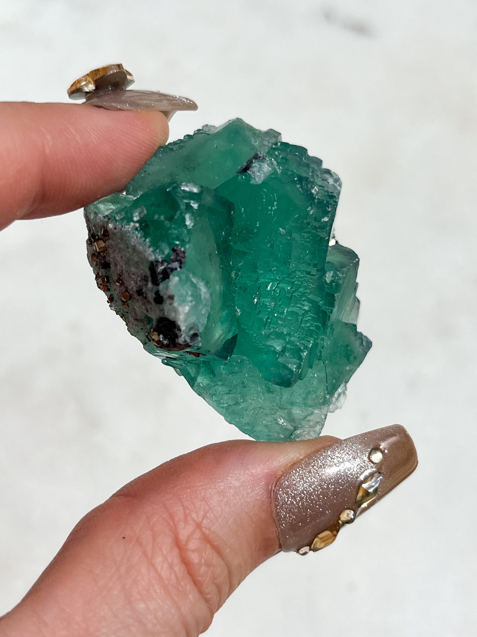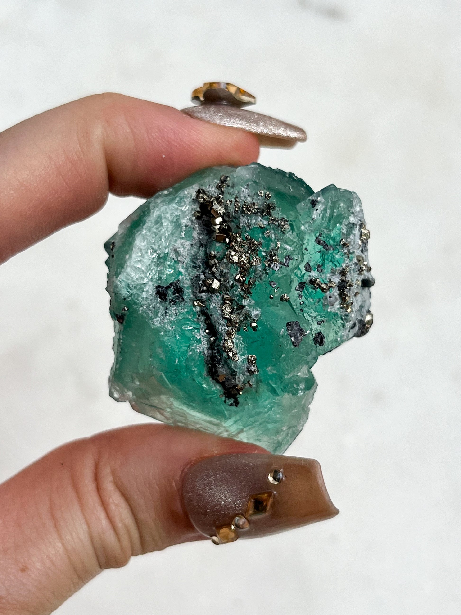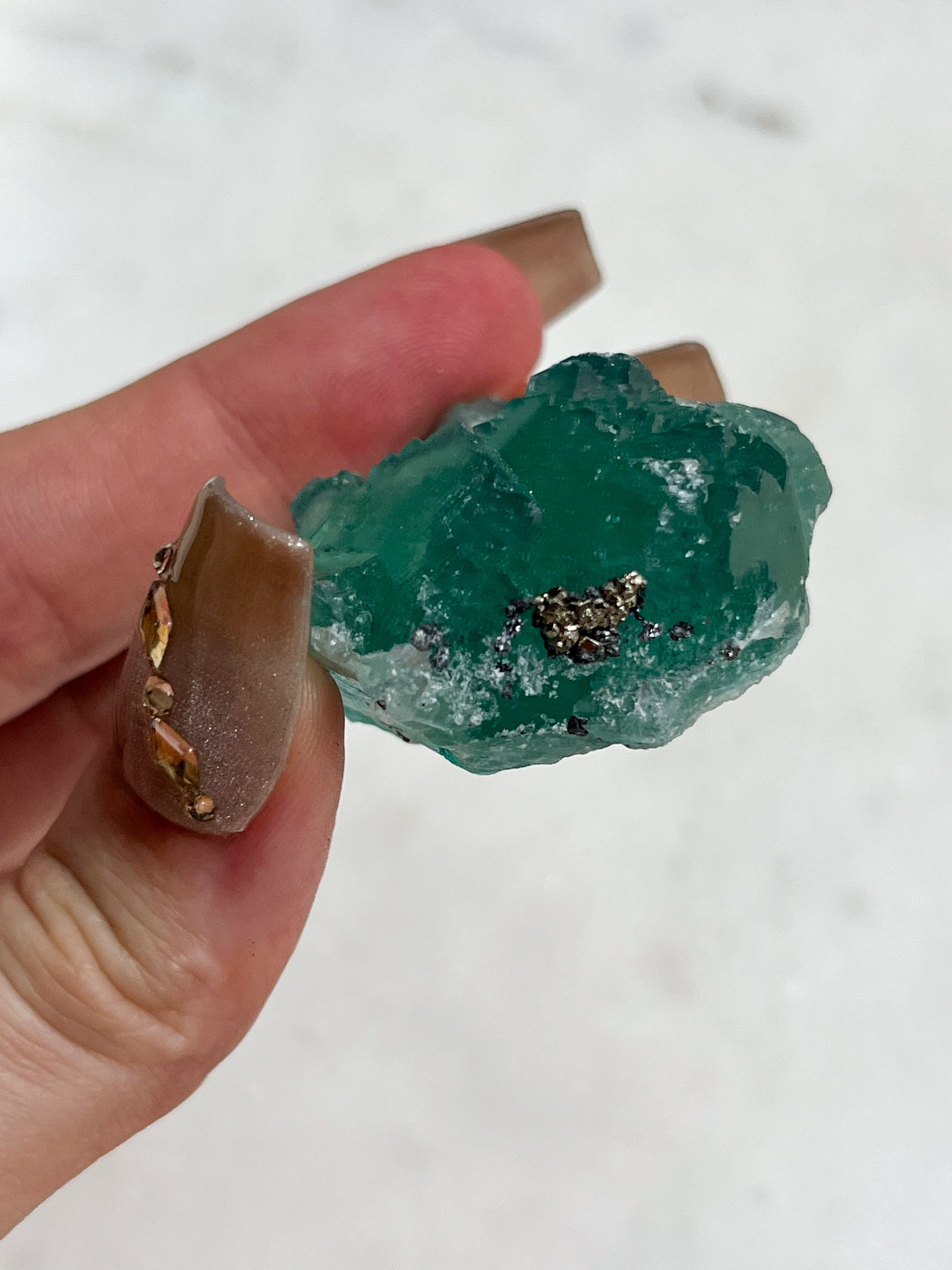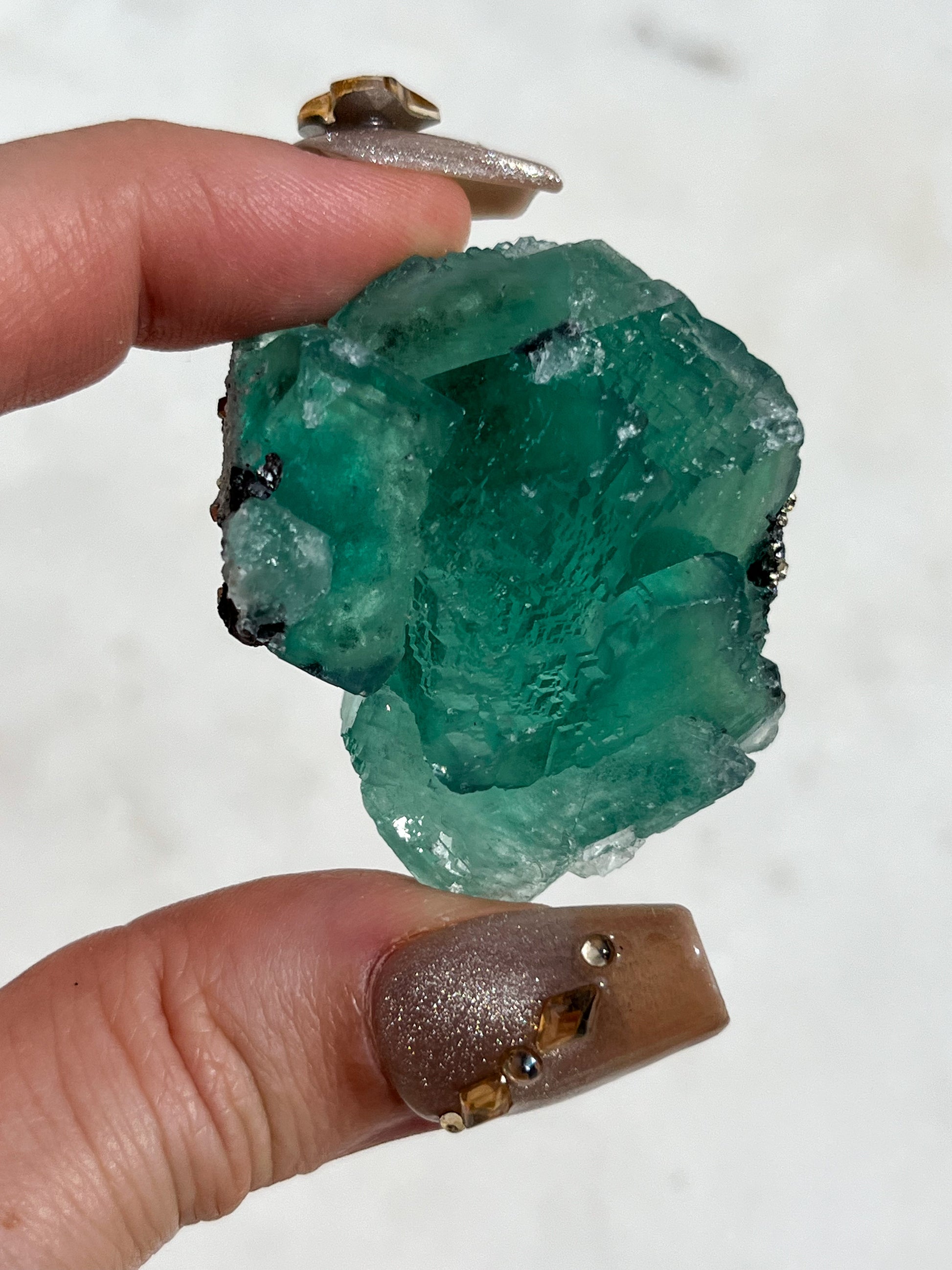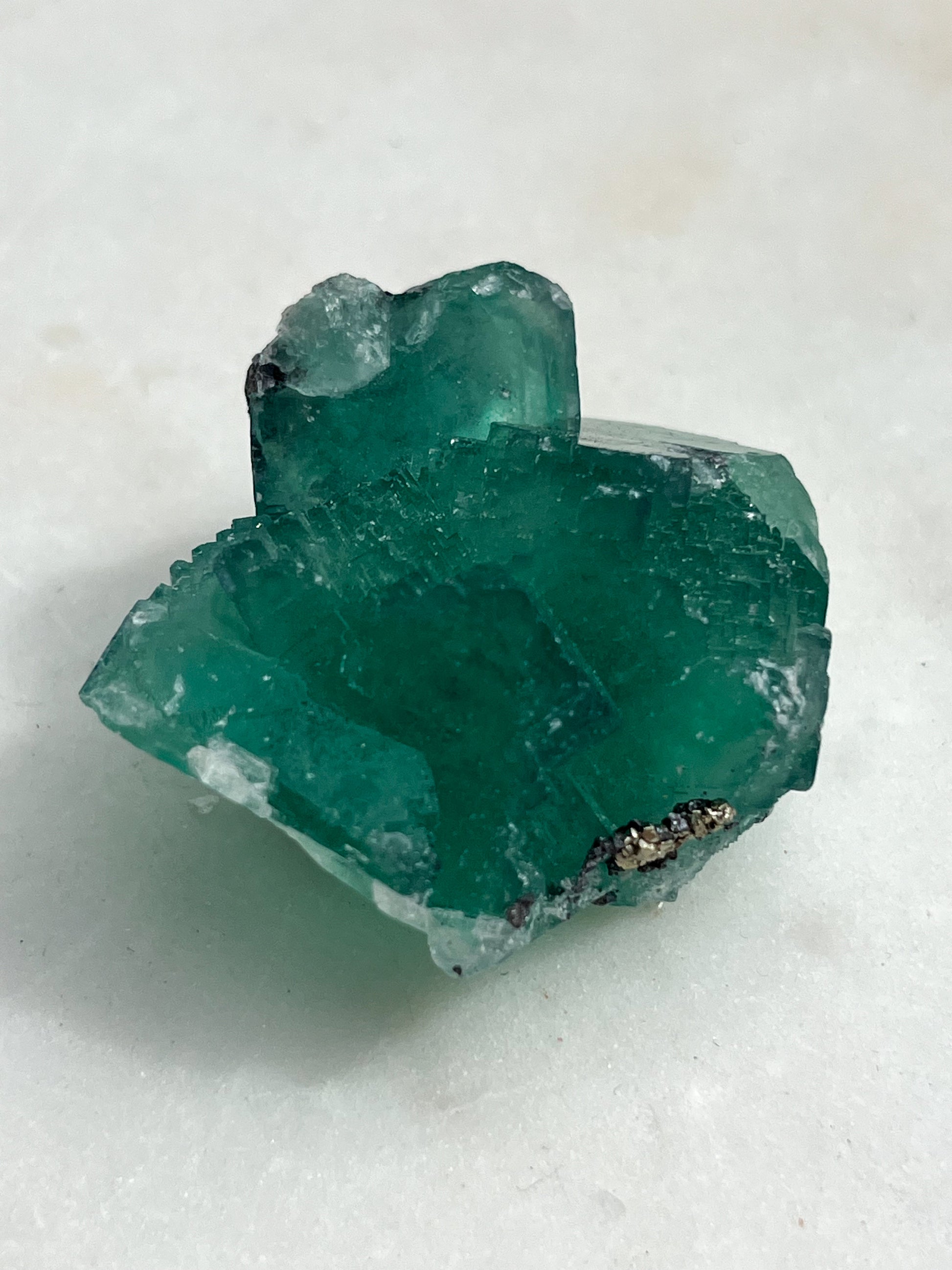 An attractive form of emerald-green coloured fluorite with predominantly octahedral surfaces. Mineral inclusions that can be found alongside this classic fluorite and pyrite combination include sphalerite, jordanite, and geocronite.