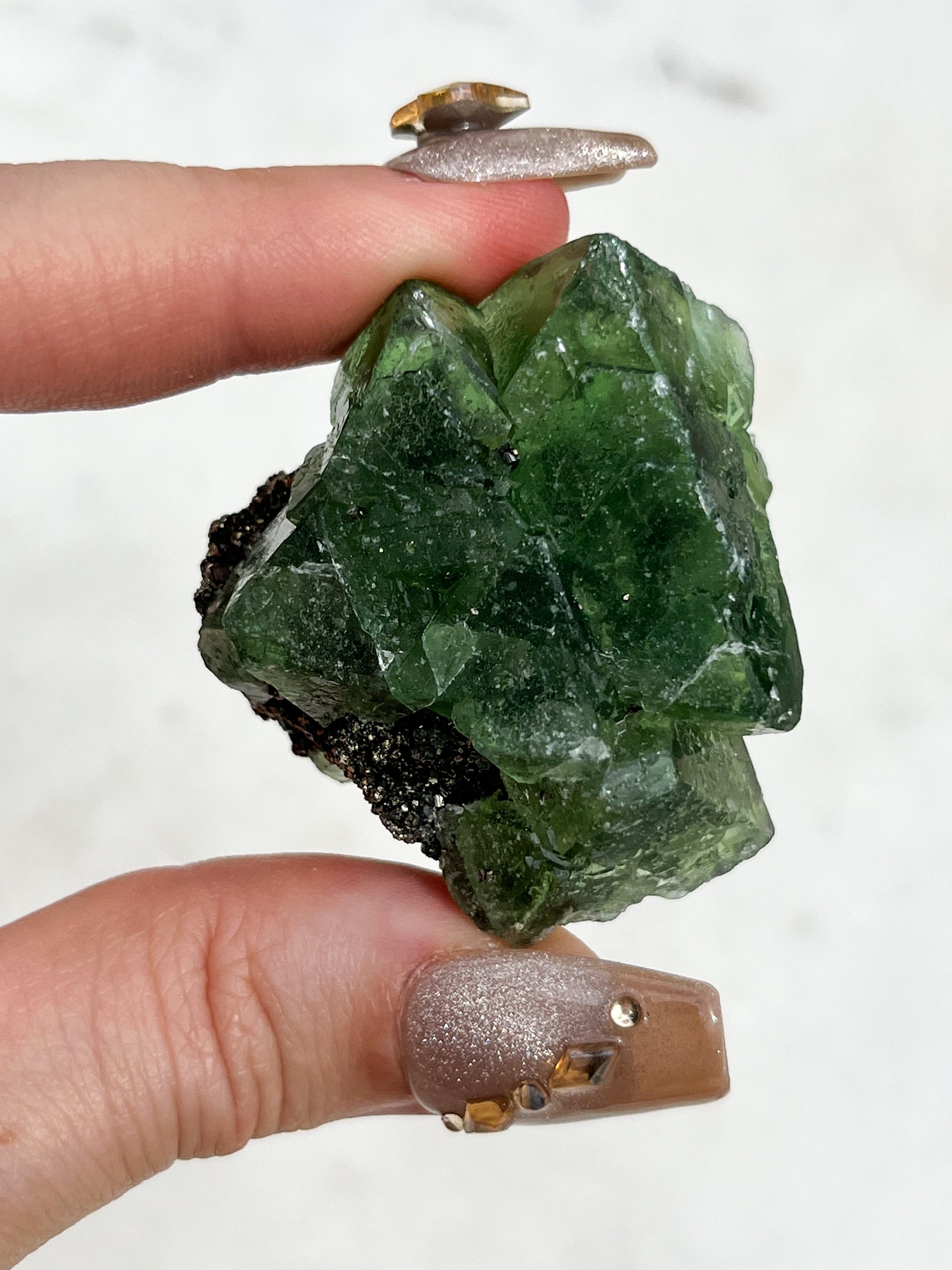 An attractive form of emerald-green coloured fluorite with predominantly octahedral surfaces. Mineral inclusions that can be found alongside this classic fluorite and pyrite combination include sphalerite, jordanite, and geocronite.