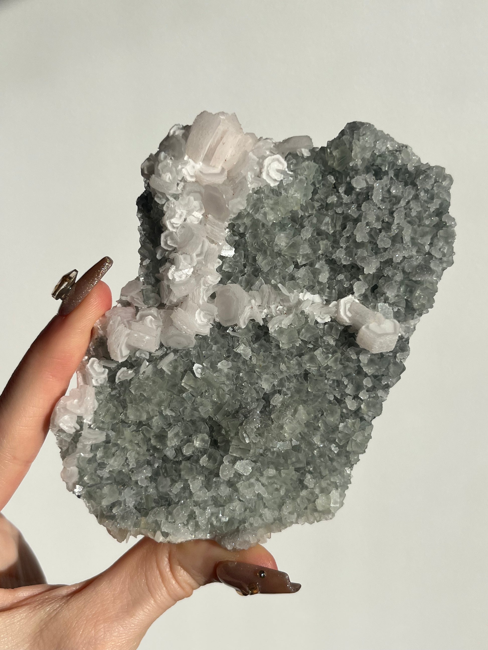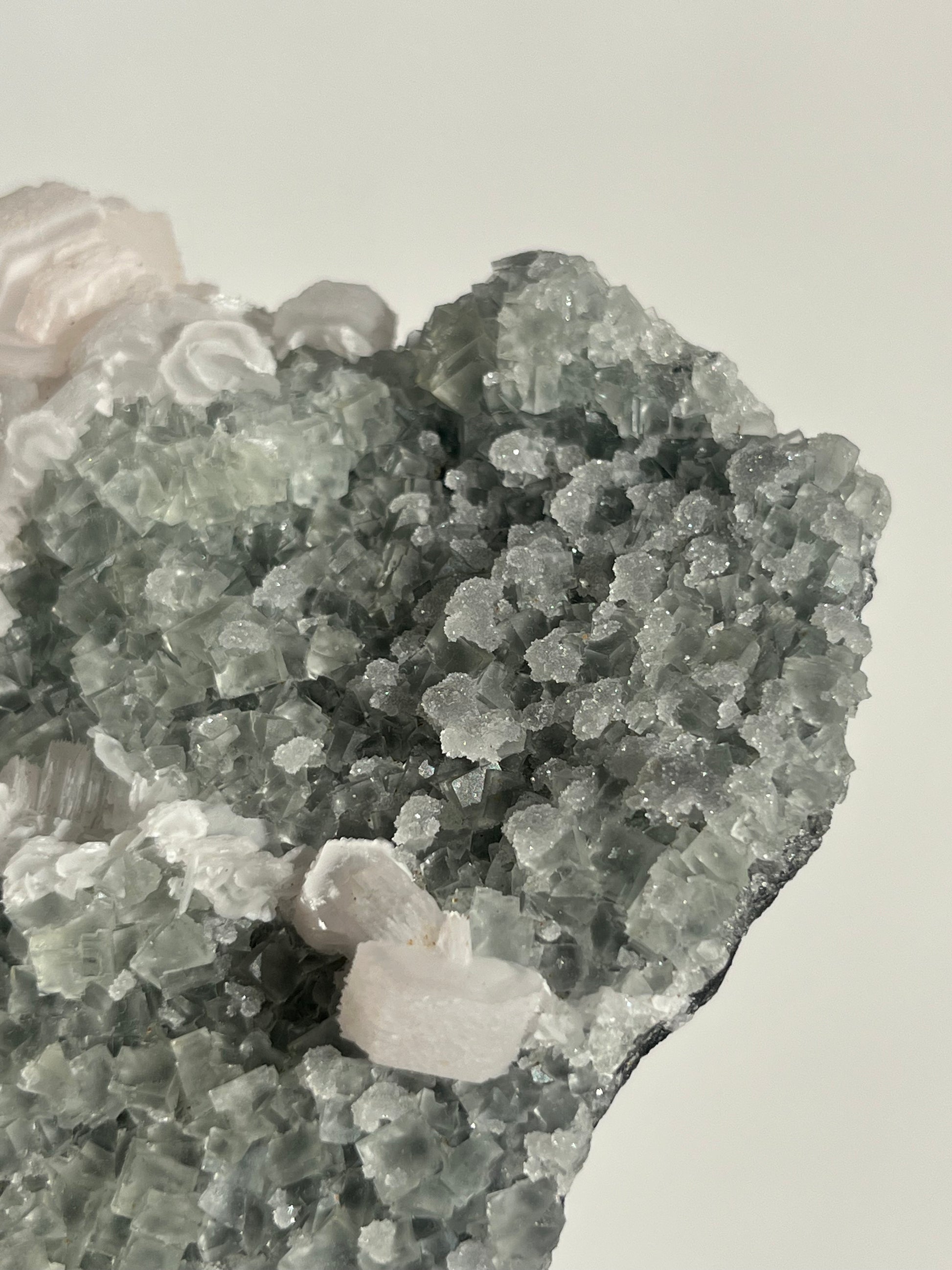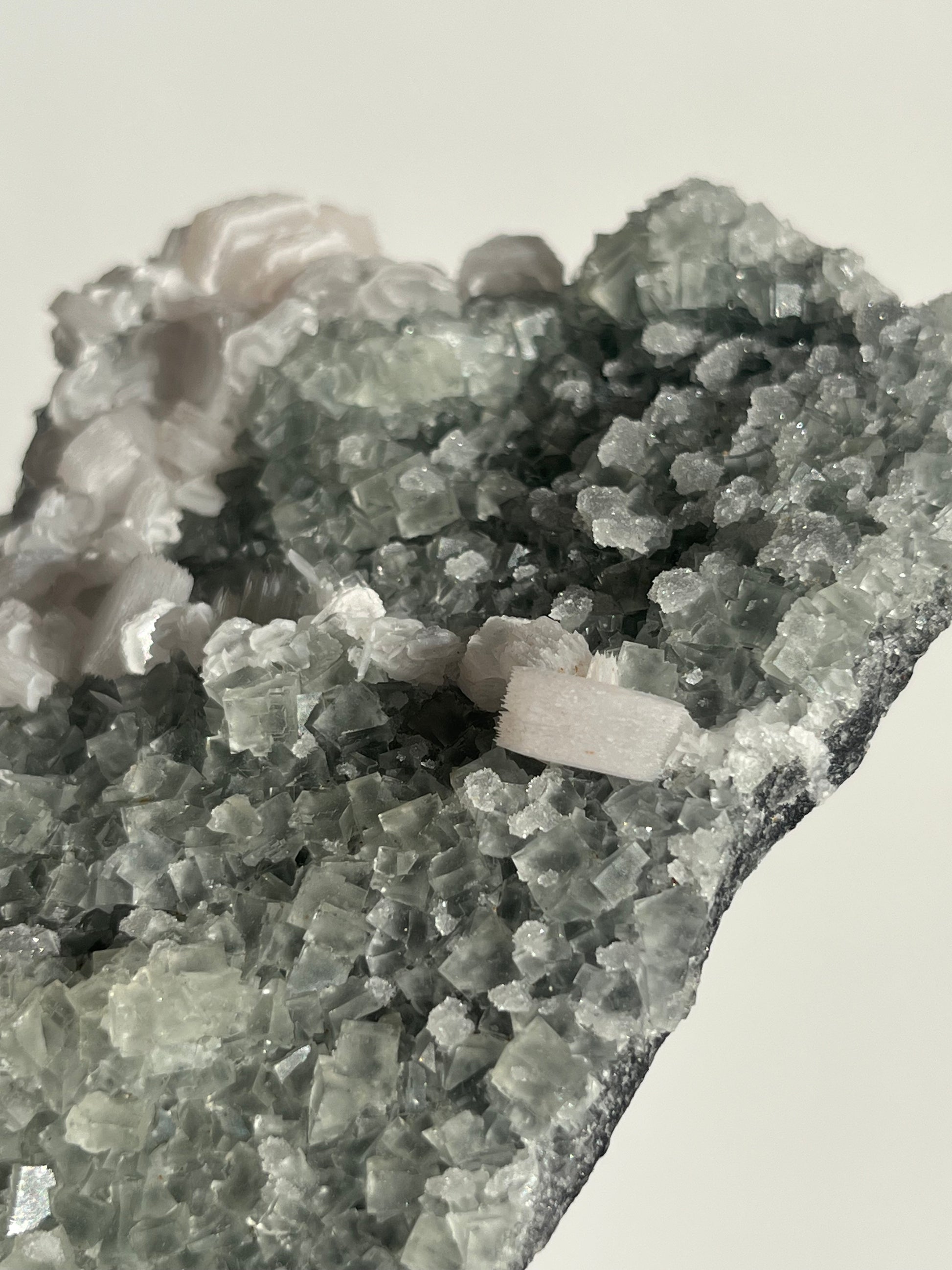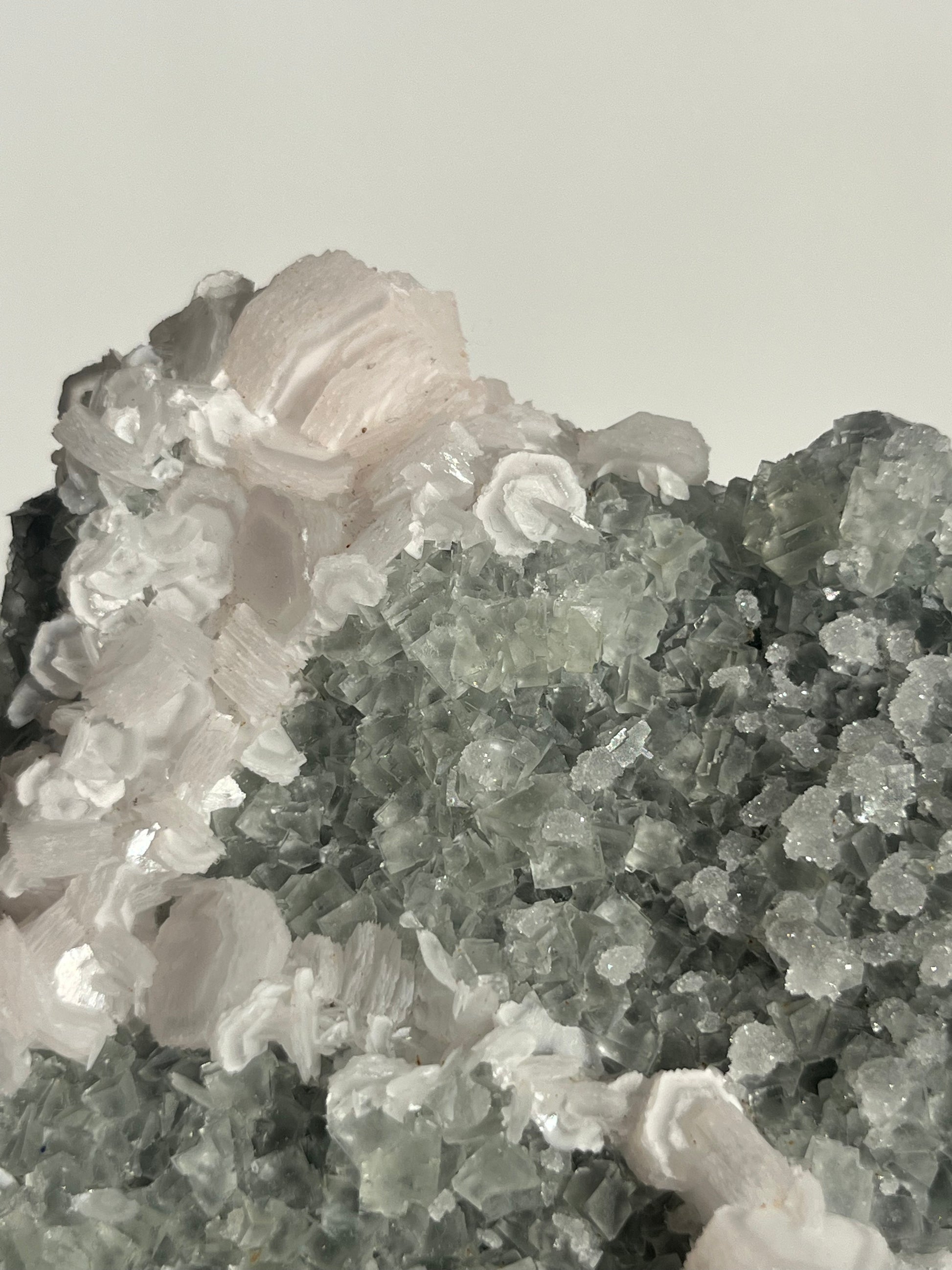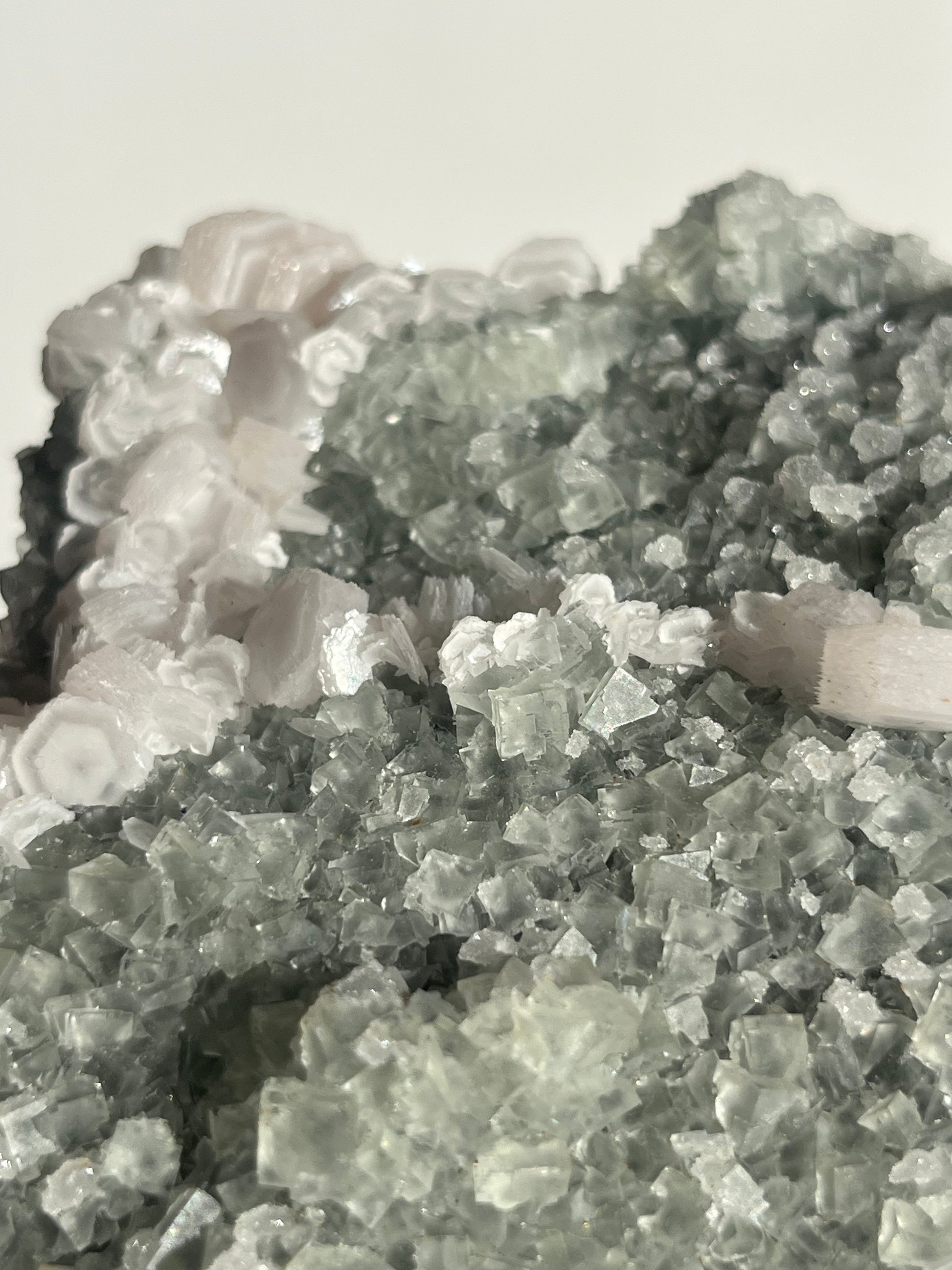 Pink Coin Calcite, Green Fluorite and Quartz Specimen I