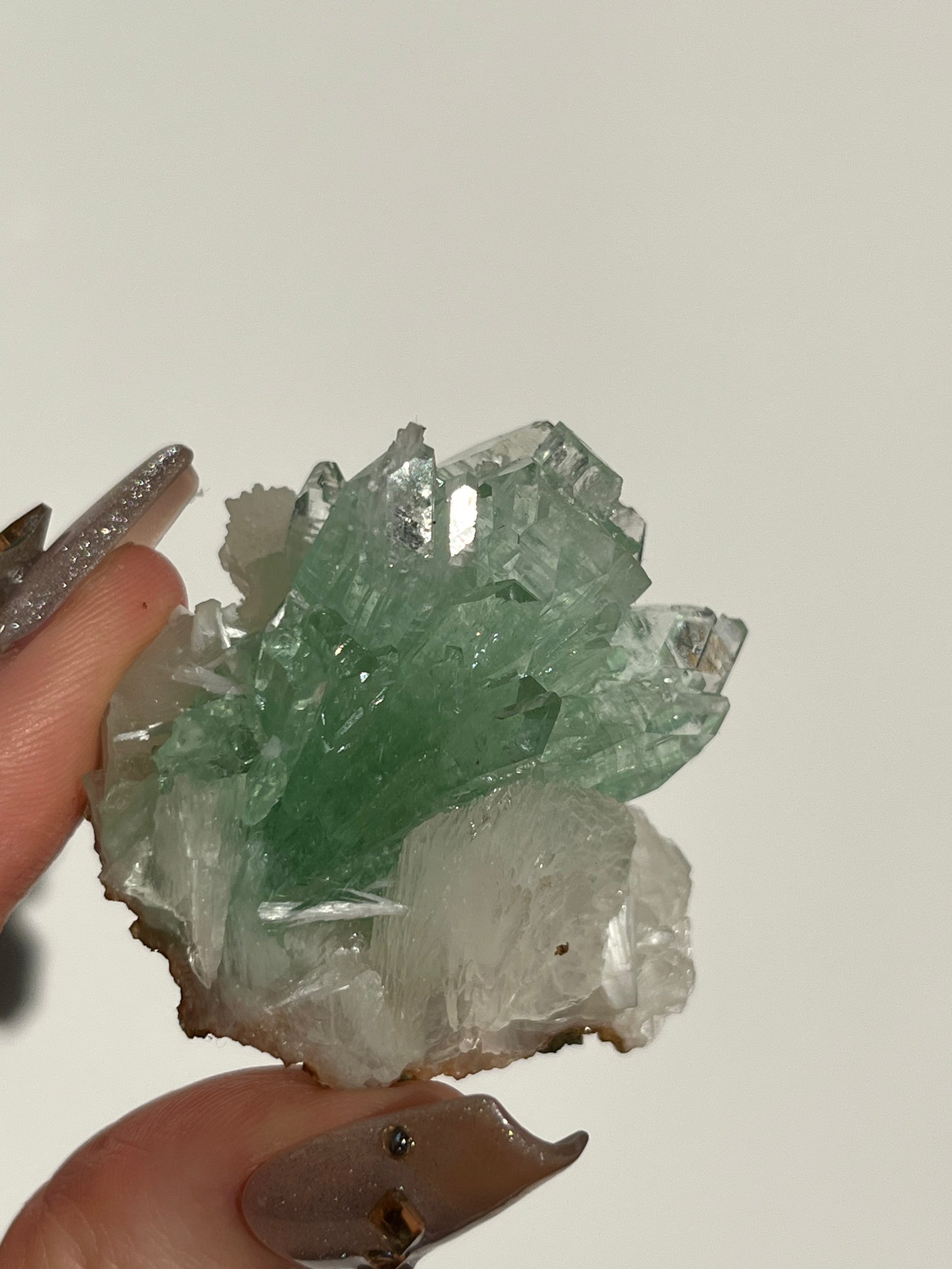 Apophyllite from Jalgaon is world-renowned, and prized for its rare green variation with sharp, natural points. These specimens combine aesthetic beauty with powerful energetic resonance, making them highly sought after among discerning collectors.